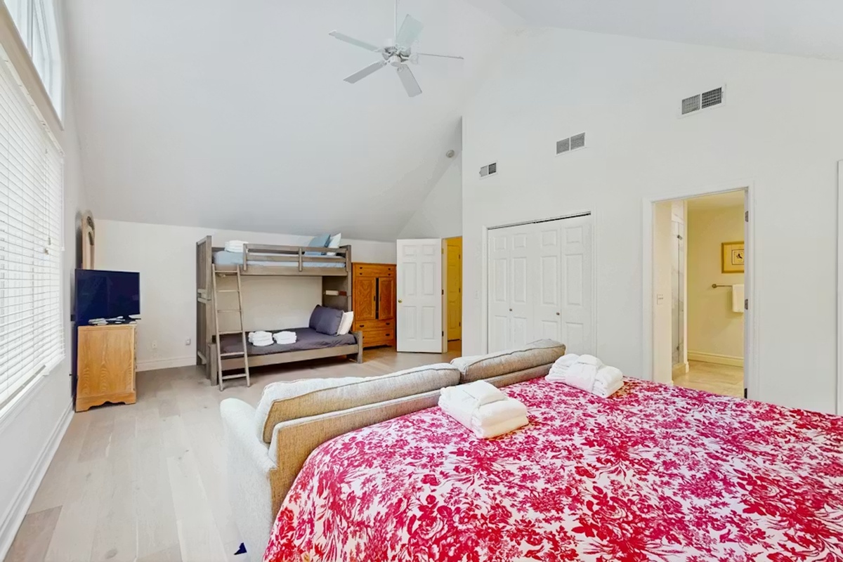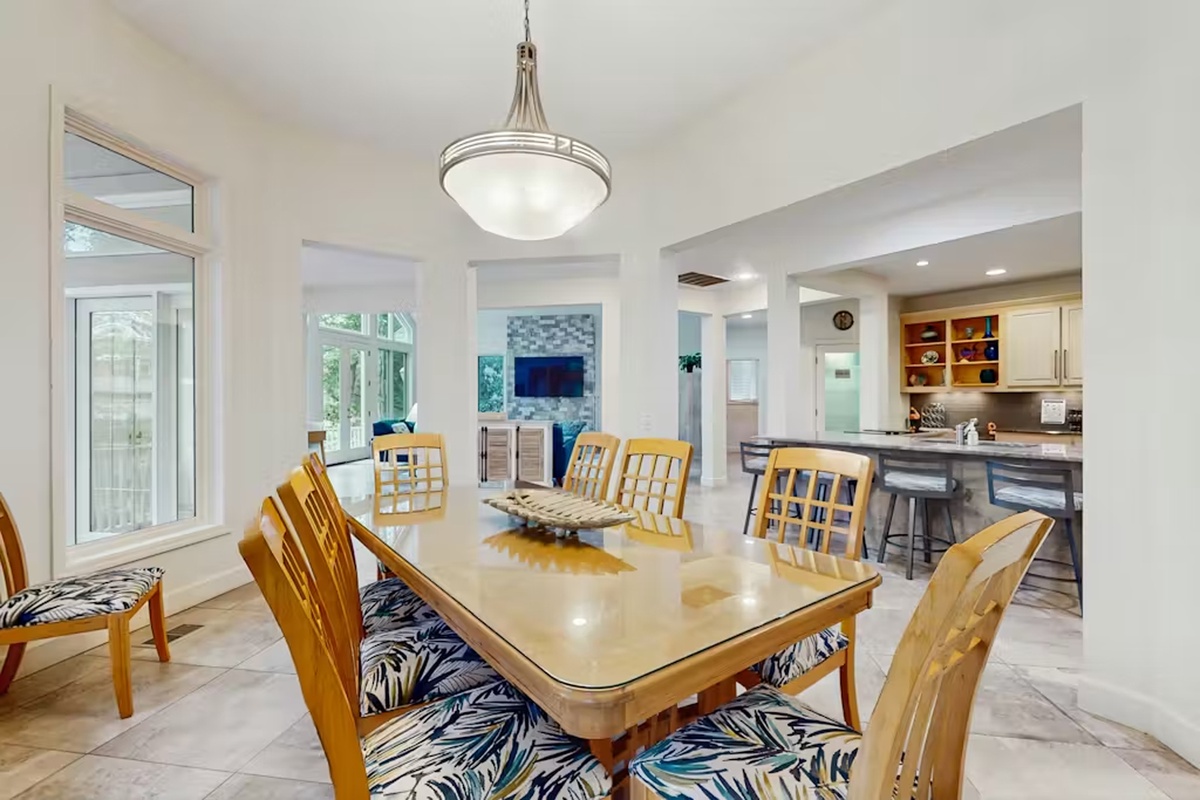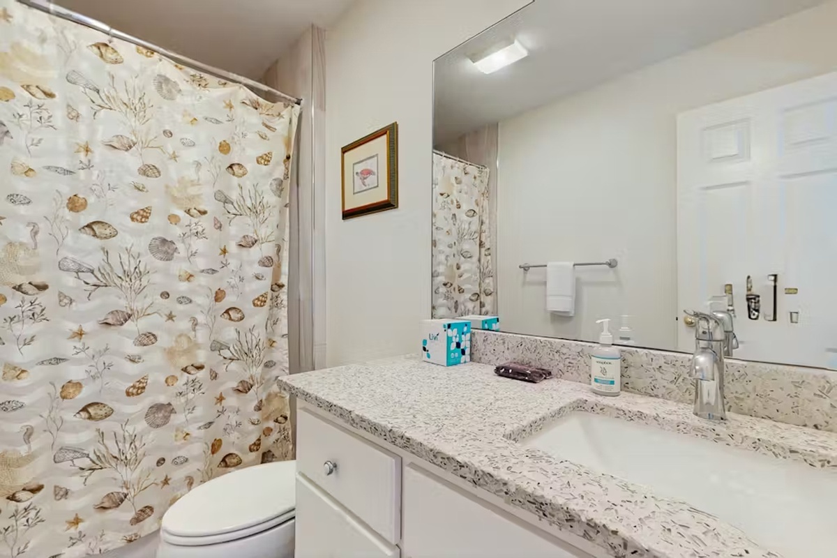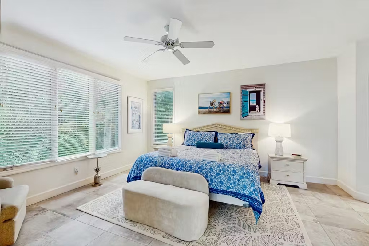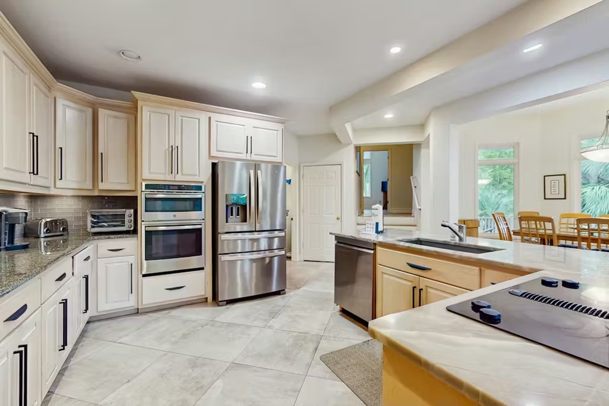 Inside, the home unfolds into a bright and welcoming great room where floor to ceiling windows and vaulted ceilings flood the space with natural light. Plush seating and a smart TV make it easy to unwind after a day spent on the course or by the shore. The full kitchen is a chef’s dream, featuring gleaming custom countertops and a complete suite of stainless steel appliances that inspire everything from simple breakfasts to gourmet dinners. Morning rituals are made sweeter with your choice of a Keurig or traditional drip coffee maker, ensuring every day starts just the way you like it.