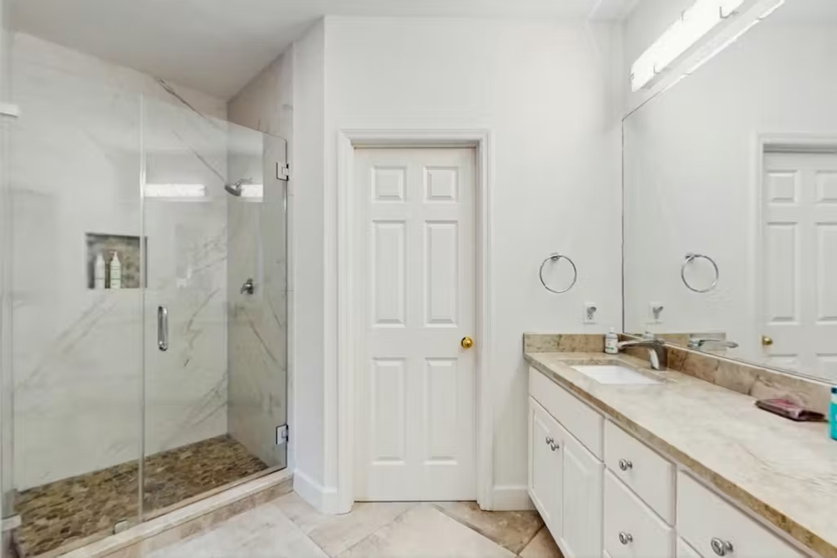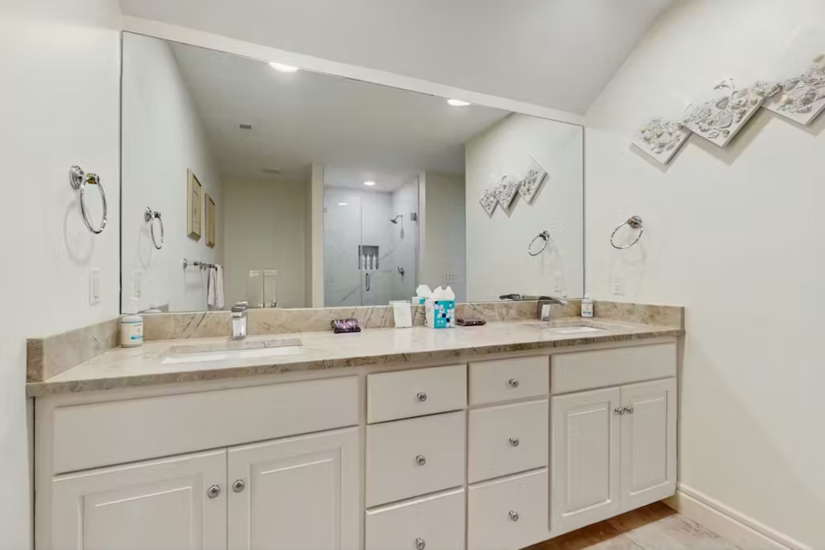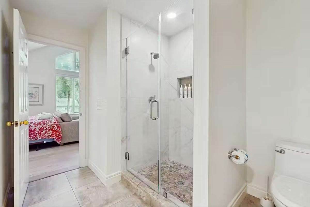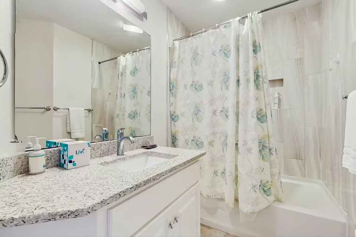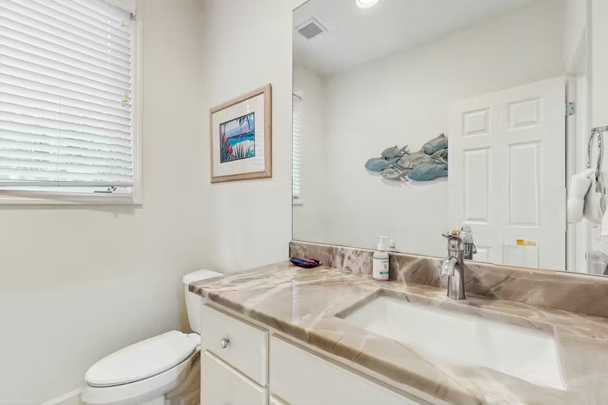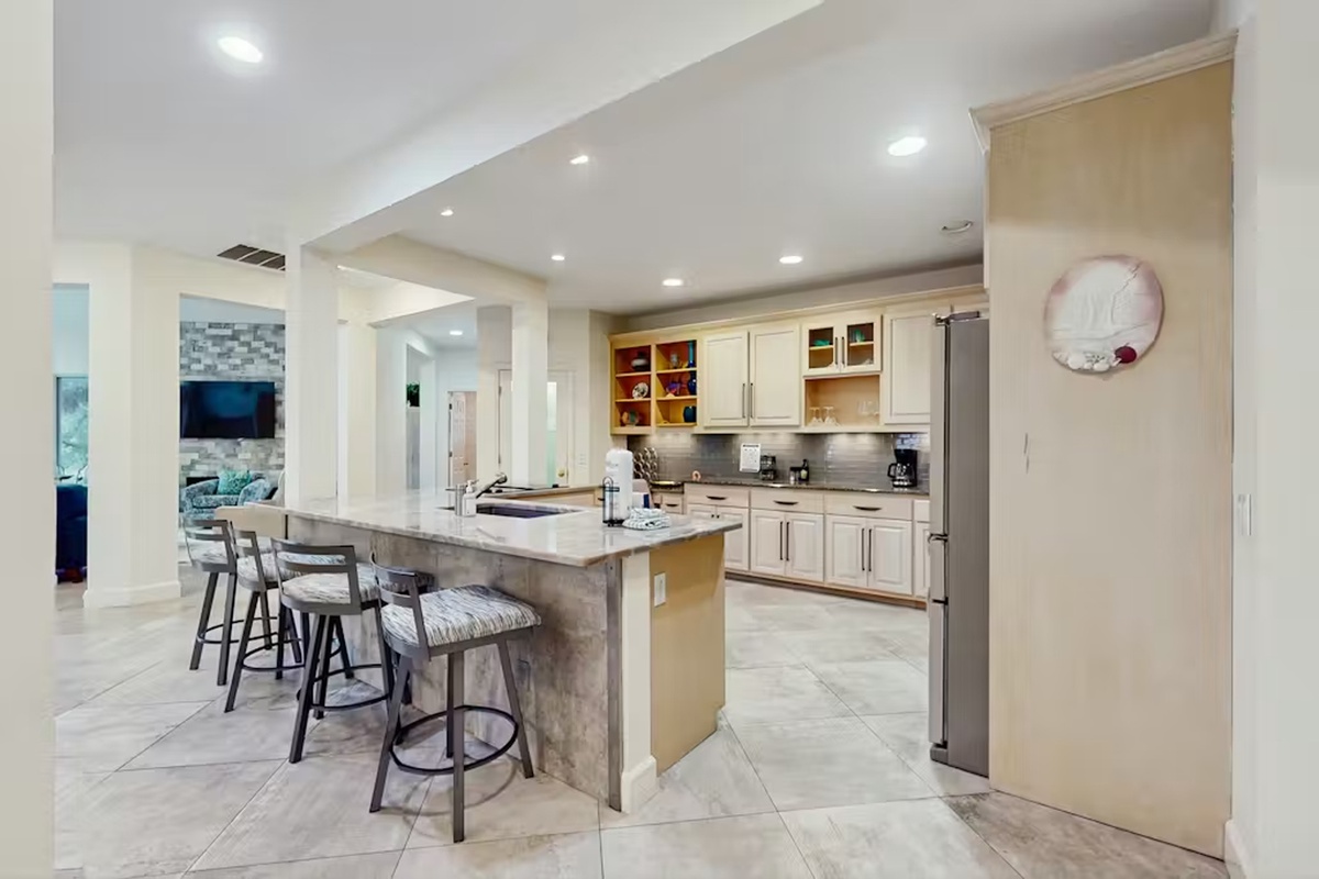 Inside, the home unfolds into a bright and welcoming great room where floor to ceiling windows and vaulted ceilings flood the space with natural light. Plush seating and a smart TV make it easy to unwind after a day spent on the course or by the shore. The full kitchen is a chef’s dream, featuring gleaming custom countertops and a complete suite of stainless steel appliances that inspire everything from simple breakfasts to gourmet dinners. Morning rituals are made sweeter with your choice of a Keurig or traditional drip coffee maker, ensuring every day starts just the way you like it.
