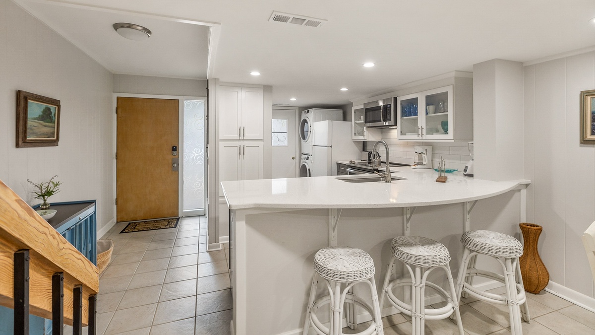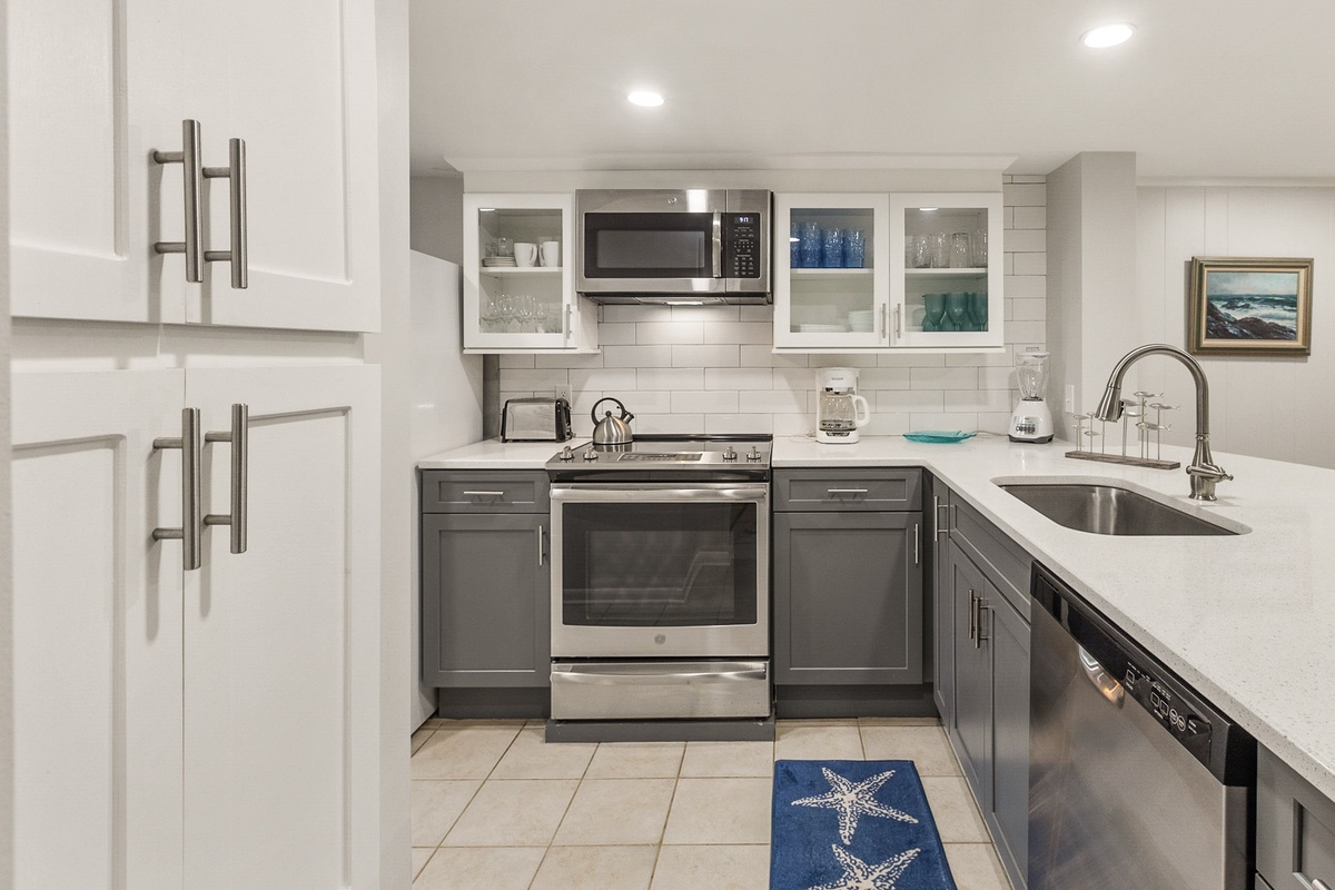 We booked this property last minute for a short getaway. Last year we had stayed at this complex and knew we liked the location. This unit has been remodeled and was fresh and nicely decorated. We felt that it was lacking on some amenities like a grill (propane tank was there but no grill), there also were not any beach accessories like chairs, umbrella, or toys. The unit we stayed in last year had a locked chest on the patio that was full of beach stuff including a wagon. Thankfully we brought our own stuff, however you aren’t allowed to keep it on the patio and we received a call from the management company letting us know we were in violation (we did see other units with beach stuff on their porch). Because we had our bikes stored in the front area we had to wheel our beach wagon into the living room. It would be nice if this unit had the outdoor box to house beach stuff. Overall a nice place to stay and we enjoyed our time there.Leeanna H. - Posted: 5/21/2020
