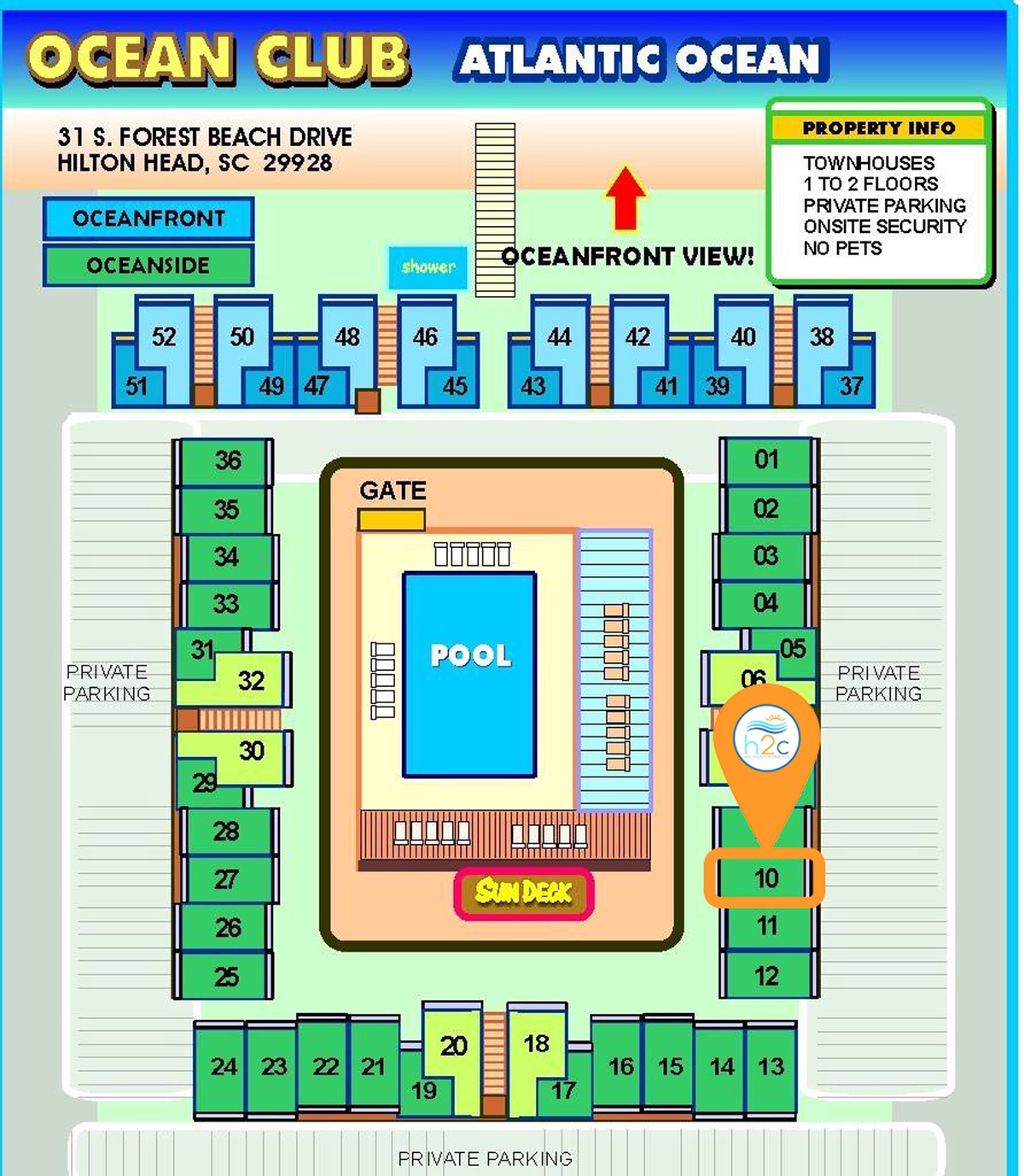 10 Ocean Club was a great place to stay in Hilton Head. It was just steps to the pool and beach and very close to shopping and restaurants. The villa was as pictured and we enjoyed our stay. It was clean and check in was easy. The pool was perfect - it was clean, the water was the perfect temperature (even in October) and it was steps from the back patio. A few notes for those visiting with young kids - be sure to bring a nightlight. The upstairs hallway is narrow and at night it's hard to see the steps. Also, the tub does not have a drain plug - so baths are not possible. My husband is very tall and the ceilings are surprisingly low. He had to duck at the bottom of the stair to avoid getting hit. Please note: beach chairs, bikes and umbrellas are not provided- so bring your own or plan to rent them (we were disappointed that there were no beach chairs). Also, the sliding glass patio door didn't have a working lock. It had a sliding latch that could only be locked from the inside. It became problematic when it was time to leave because we had to choose to take a chance and leave it unlocked or lock it and walk all the way around the building to get to the beach. Other then those very minor issues- we had a lovely stay.During this stay the property was under previous owner or management.Gretel W. - Posted:
