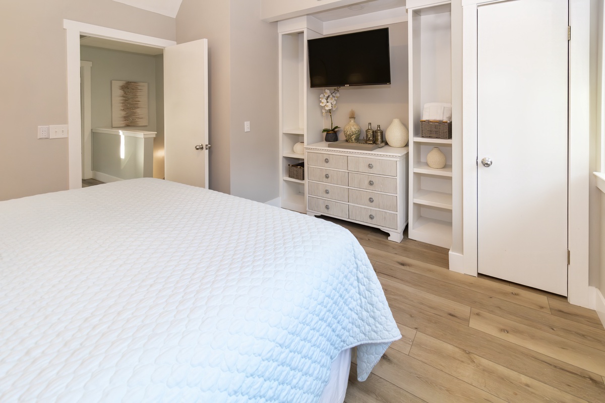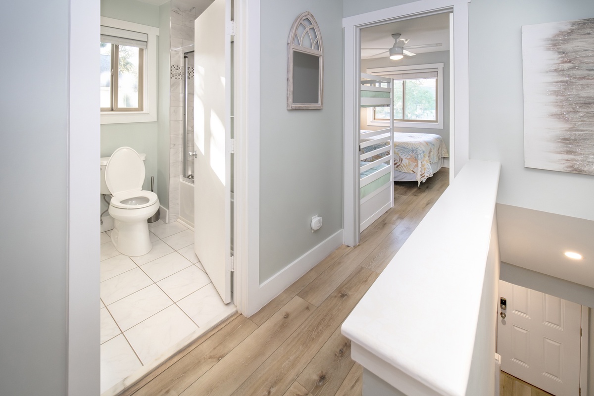 The primary bedroom is on the second level and features a large king bed and a flat-screen TV. The guest bedroom has a queen bed, a twin bunk bed, and a pull-out trundle bed. The shared full bathroom comes with a double vanity and a shower/tub combo.