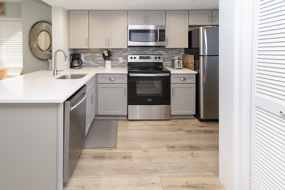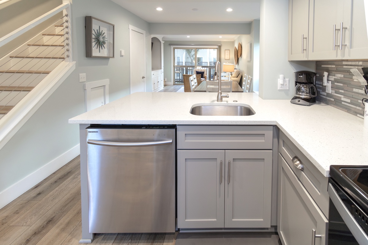 The living area has been beautifully decorated with inviting furniture and delightful pastel tones. You can enjoy your favorite TV shows on the cable and streaming services provided. The kitchen has everything you need to prepare mouth-watering meals for your friends. From a full-size fridge, stove, and oven to a microwave, coffee maker, and dishwasher, you'll find everything you need to cook up a storm. The adjoining dining table seats everyone comfortably.