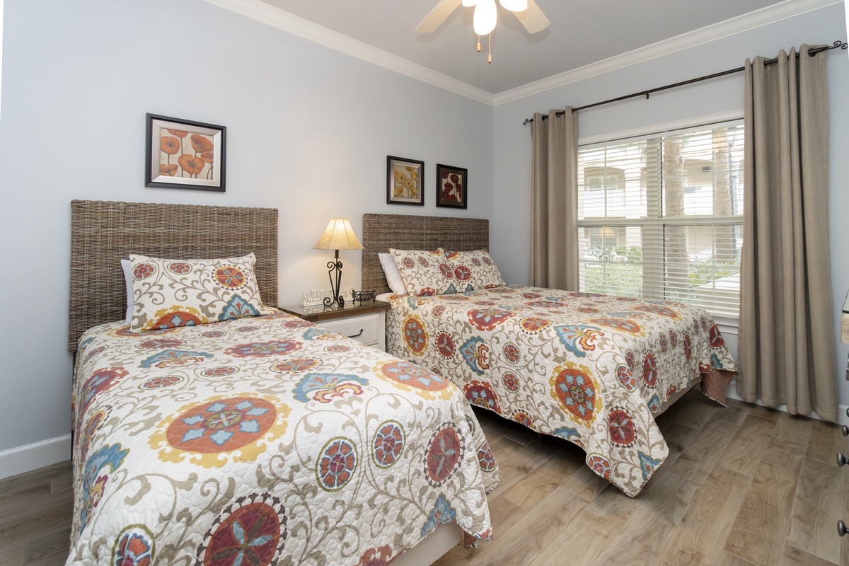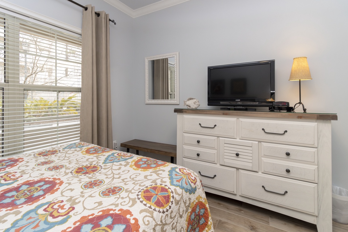 The second bedroom is just as lovely, with a queen and a twin bed, a flat-screen TV, DVD player, and a private bath.
