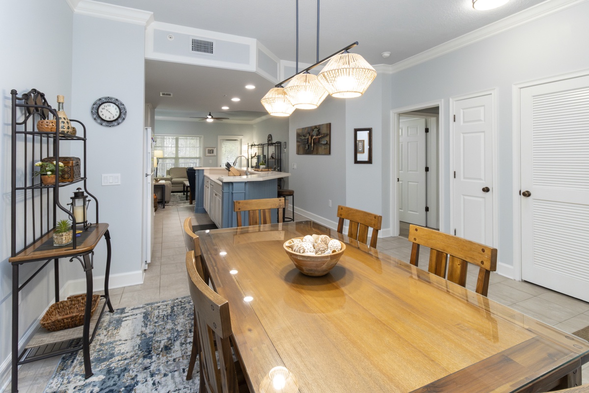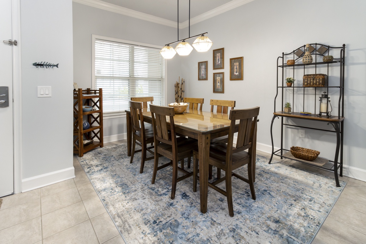 You'll love the rustic wooden dining table in the formal dining area, which can seat up to six people. The kitchen is fully equipped with all the appliances you need to whip up some delicious meals during your stay. And if you need to do some laundry, there's a convenient washer/dryer in a nearby closet.