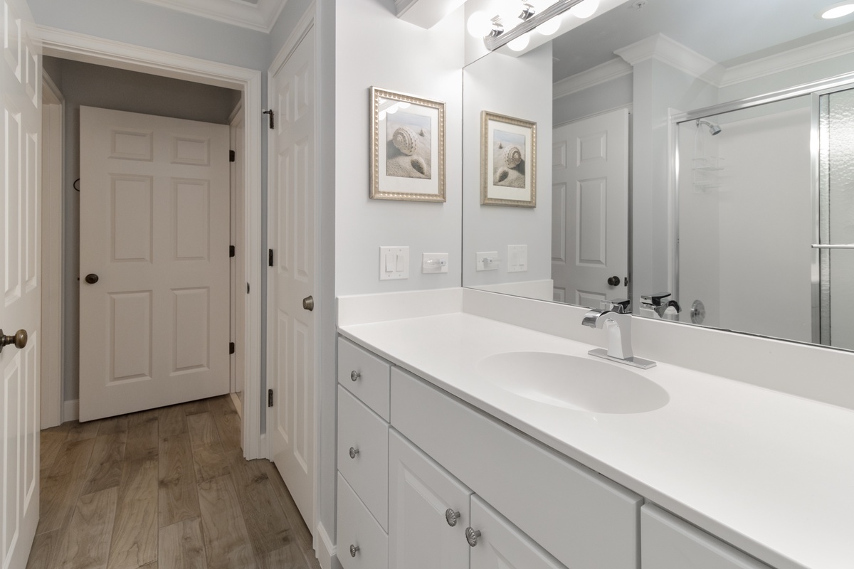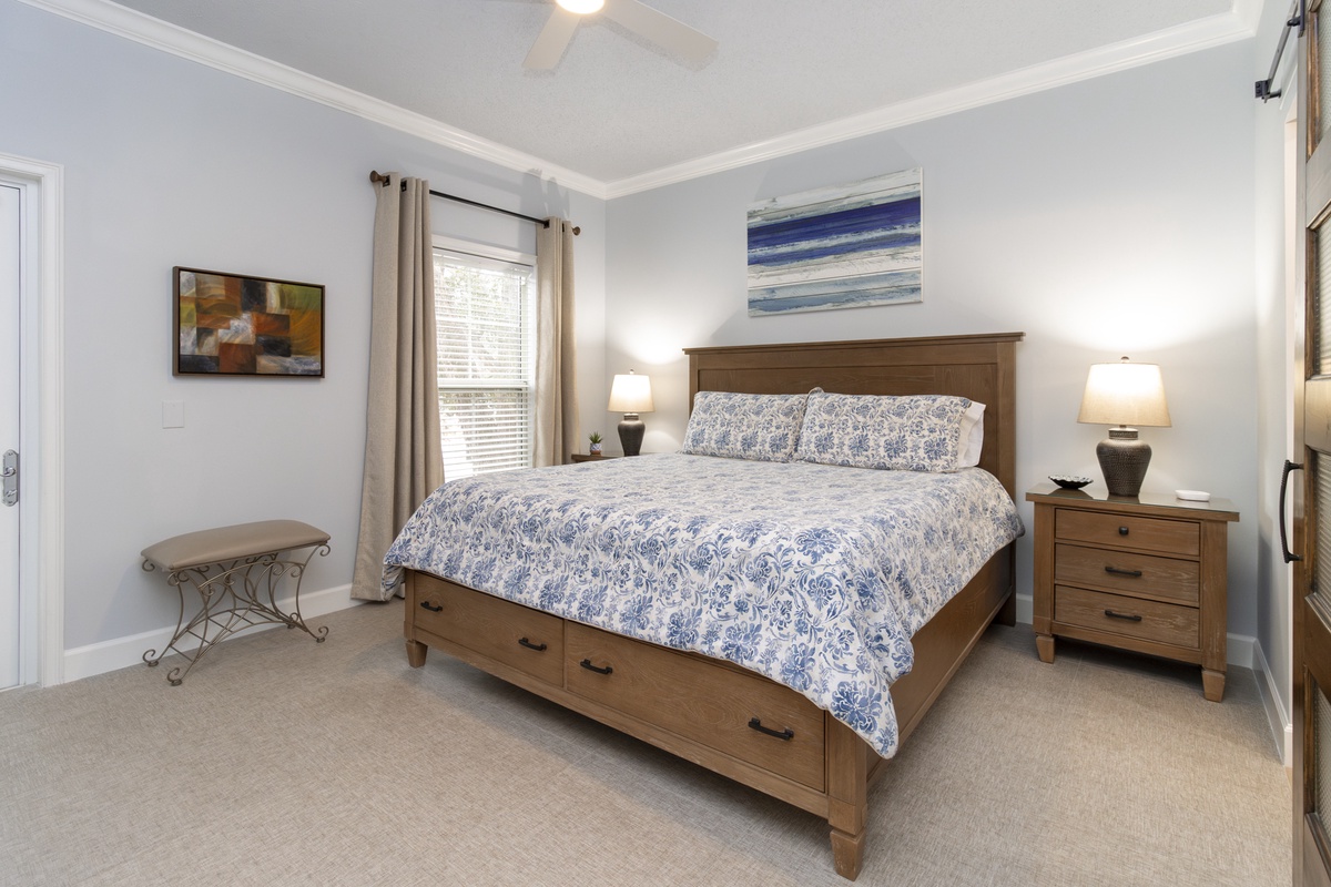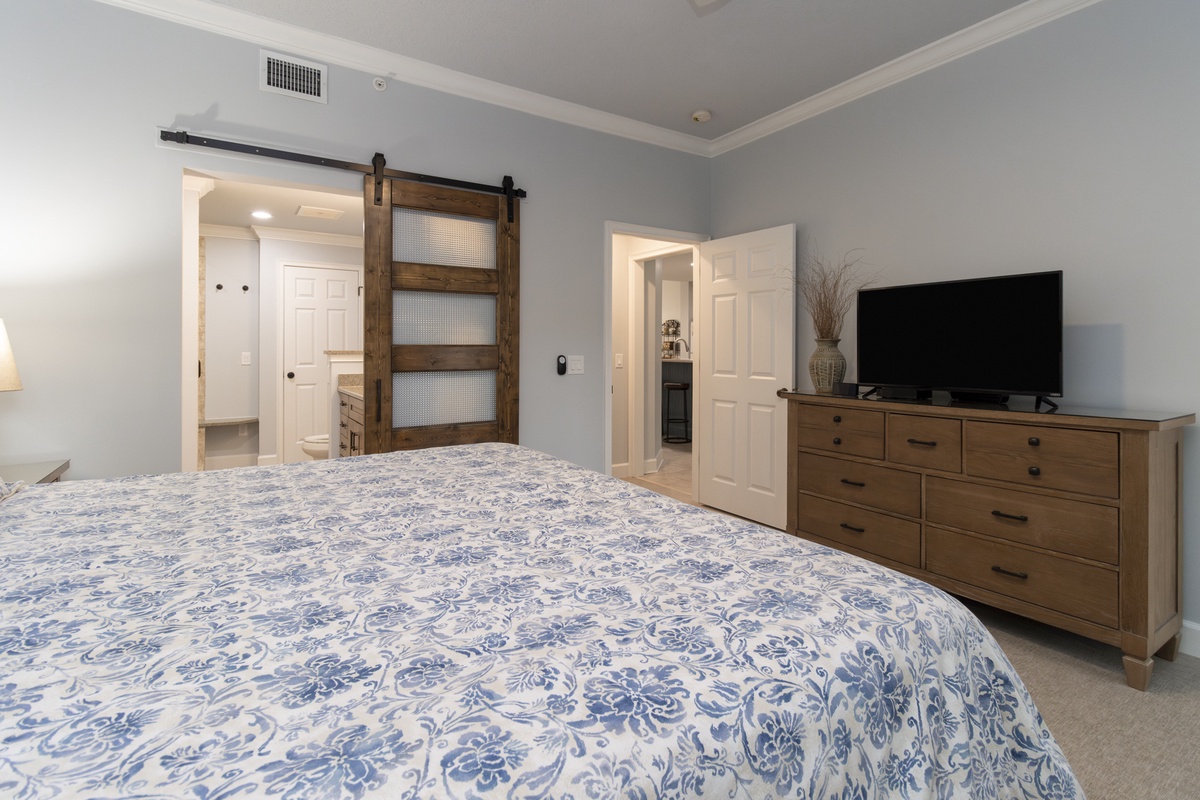 The primary bedroom is beautifully decorated and features a king-size bed, night tables, and a private bath with a new walk-in shower. And if you want to enjoy some fresh air, there's a door to the balcony where you can take in the view.