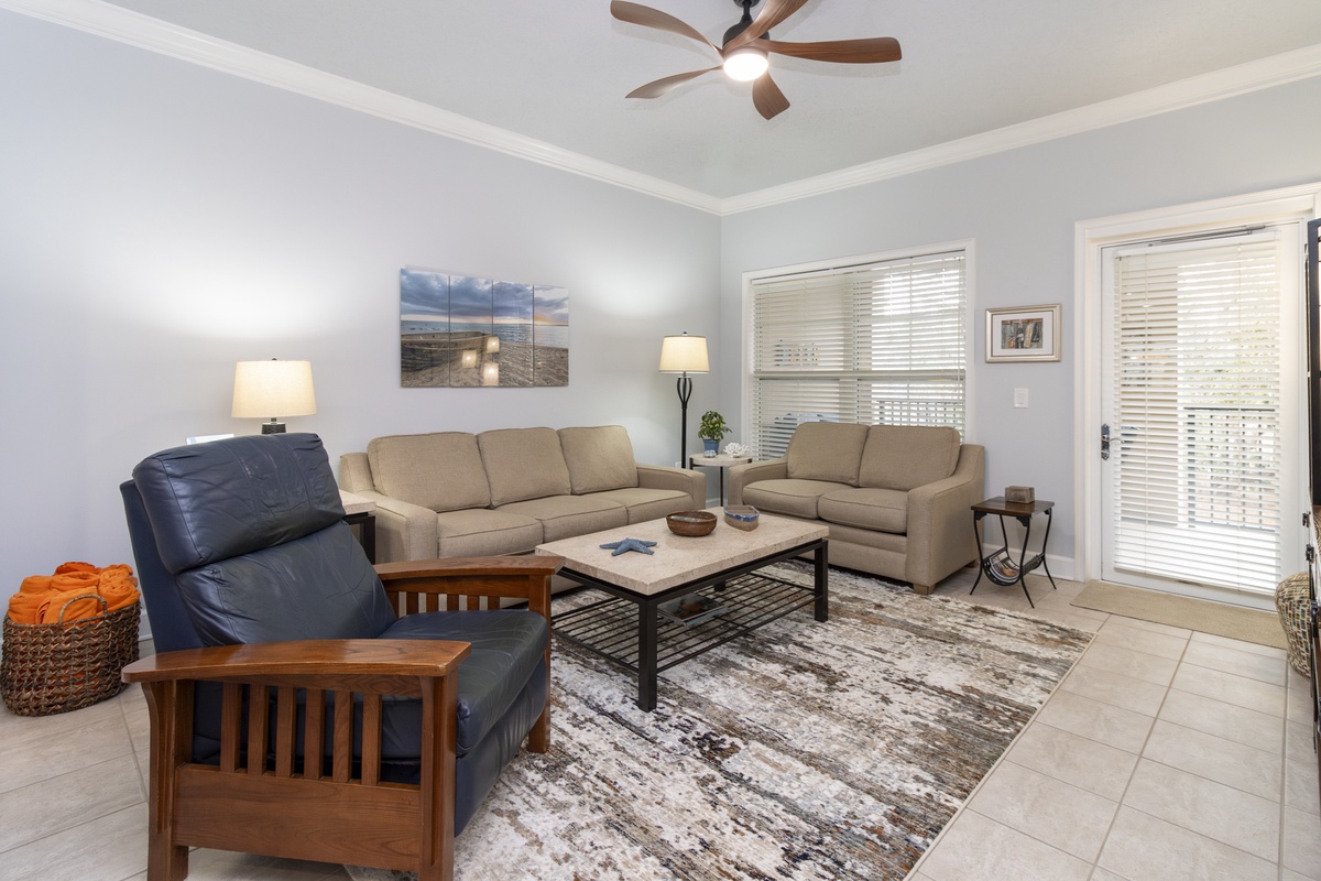 The living room is super cozy and perfect for relaxing after a long day at the beach. There's a big sofa and loveseat, as well as a comfy blue leather Morris chair. And if you want to watch some TV, there's a flat-screen TV/DVD & CD system in the wall-unit entertainment center.