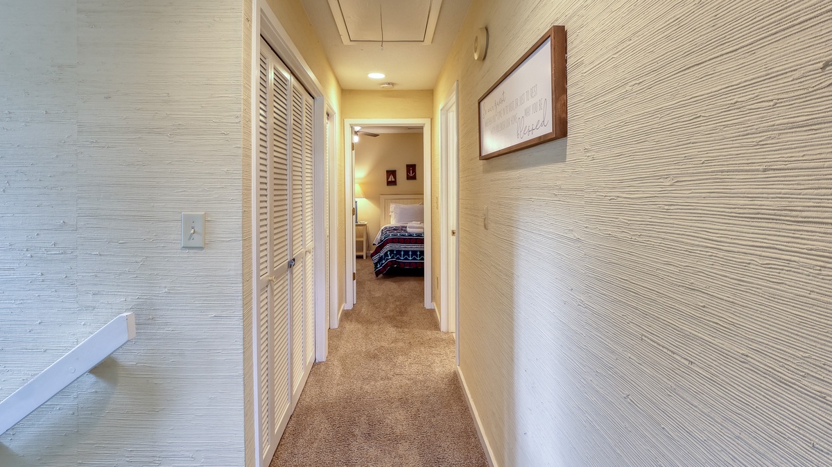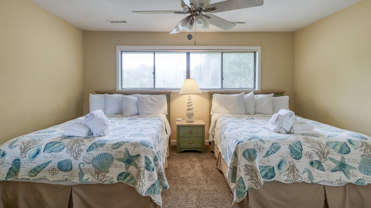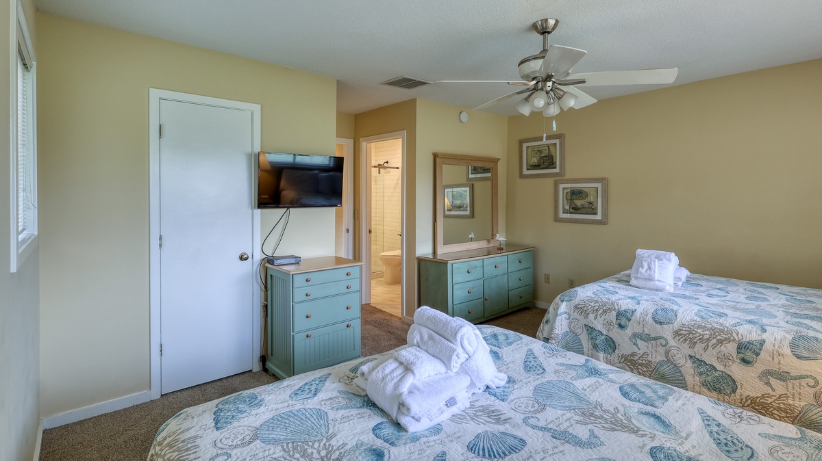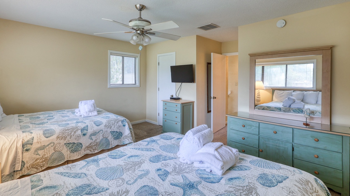 The second floor has two guest suites, one with 2 queen beds and full bath, the other with 2 twin beds. There is also another full bath.