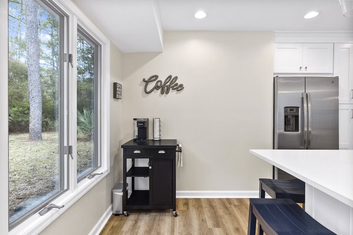 This house is in Greenwood Forest, which is a nice interior Sea Pines neighborhood. The house is beautiful and has recently been remodeled. We did a lot of cooking and found the kitchen well stocked. The hosts were very responsive and provided good recommendations including our favorite, Fishcamp restaurant. The house is 1.7 miles from the Sea Pines Beach Club. The only hassle was parking and drop off for beach access within Sea Pines. If you arrive by 7:30 or so, you can stage a car at the club with your gear. After that, gate attendants do not let you drive in, even for a drop off. The have a trolly, but it's not great if you have large umbrellas, etc. We ended up staging a car at the beach club early each morning with our gear, coming back for breakfast and dropping everyone off in the golf course parking lot with the other car afterward. The drop off car would go back to the house and the driver would bike back to the beach. It was actually nice to have a bike at the beach as it's easy to ride on. None of this is any reflection on the place, which was wonderful. Just want you to be aware of beach access within Sea Pines. Access to the public beach at Caligny is pretty easy.Joe S. - Posted: 8/8/2021