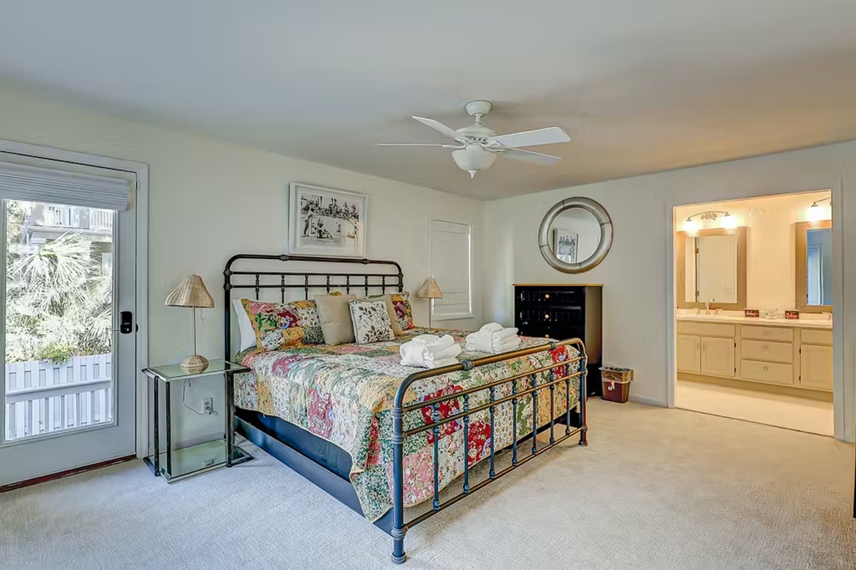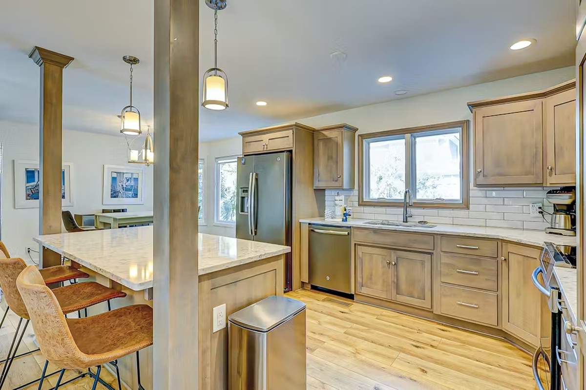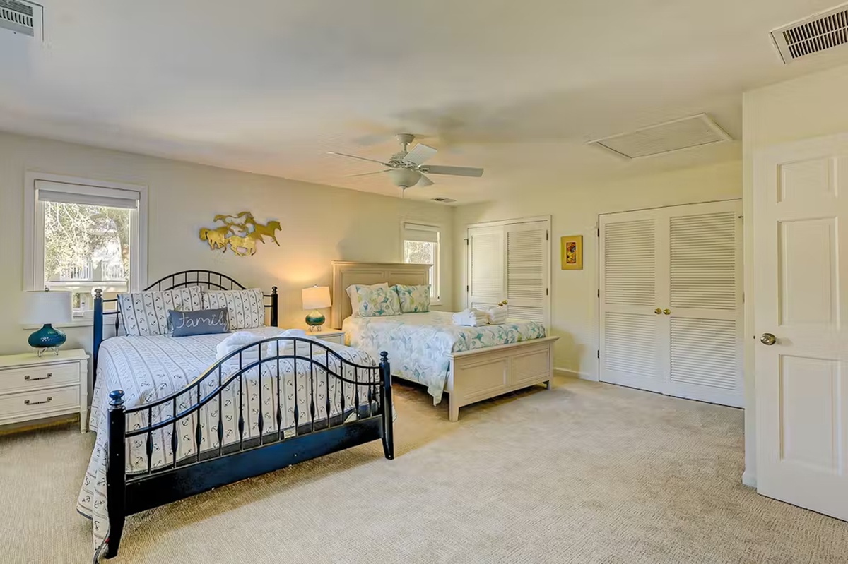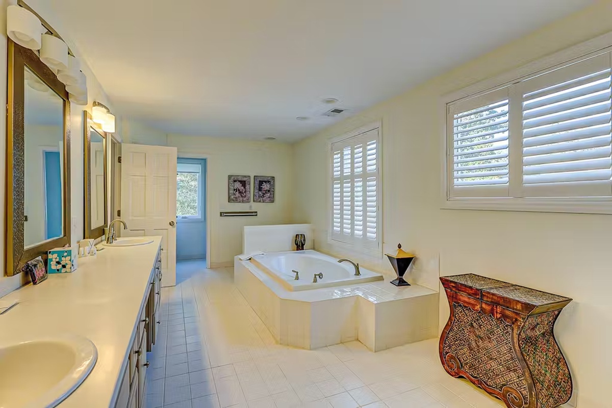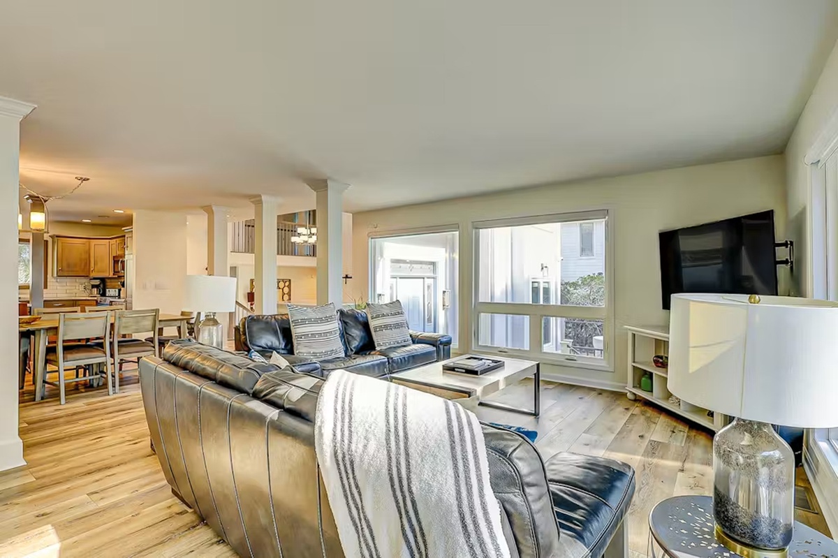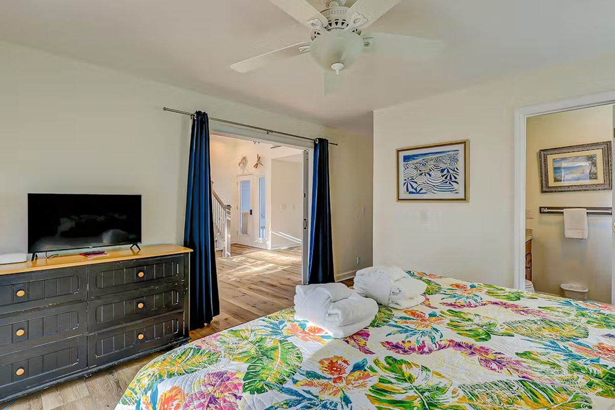 Designed for memorable gatherings, this spacious retreat offers five well appointed bedrooms that comfortably host families and groups of friends. Four bedrooms feature luxurious king beds, while the fifth bedroom includes two queen beds and a rollaway twin for added flexibility, ensuring everyone has their own perfect place to rest. Each bedroom includes a private bathroom, creating a sense of personal space and convenience that elevates the entire stay. The primary suite on the top floor adds even more appeal with a sleeper sofa and serene views, making it an ideal sanctuary after long days in the sun.