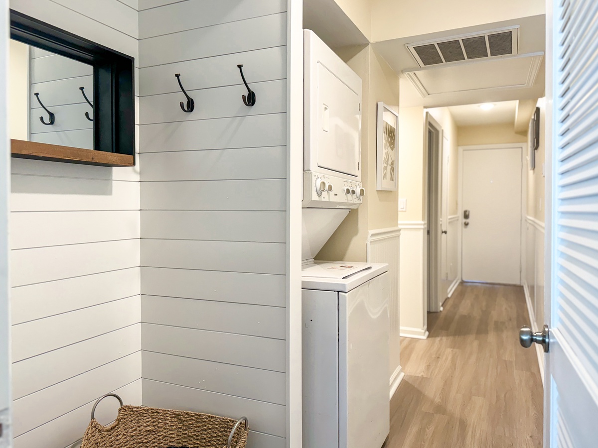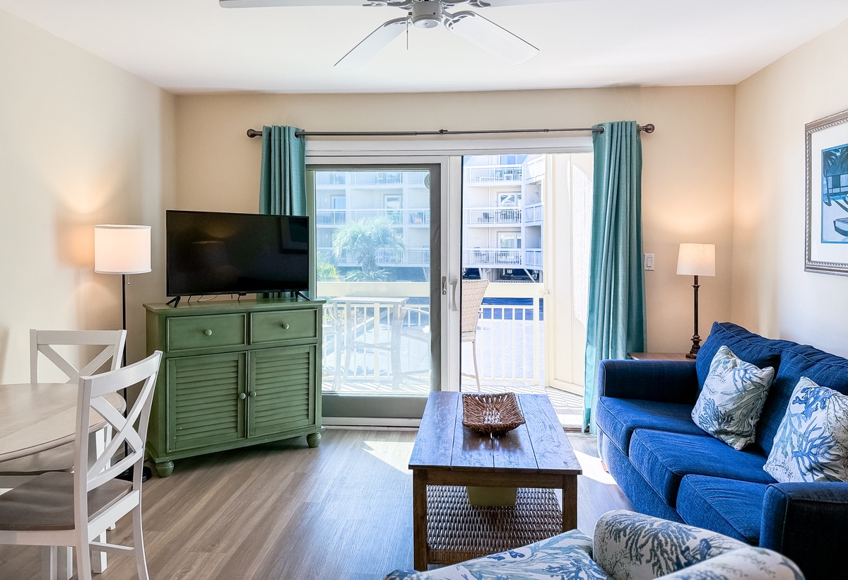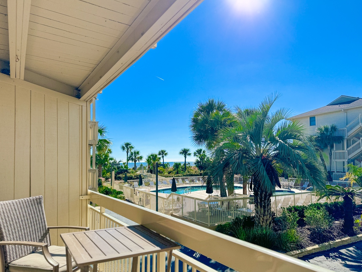 The main bedroom is extremely comfortable and has a queen-sized bed. The kitchen is fully equipped to cater to your cooking needs, and it is connected to a spacious and cozy living room that features a queen-size sleeper sofa to accommodate any additional guests. The living room leads to a balcony through a sliding door, which has seating for two people and offers stunning views of the pool, dunes, and ocean beyond. The bathroom features a tub/shower combo and is shared between the two rooms. You can stay connected with free WiFi throughout the property, and there is a private washer and dryer at your disposal for your convenience.