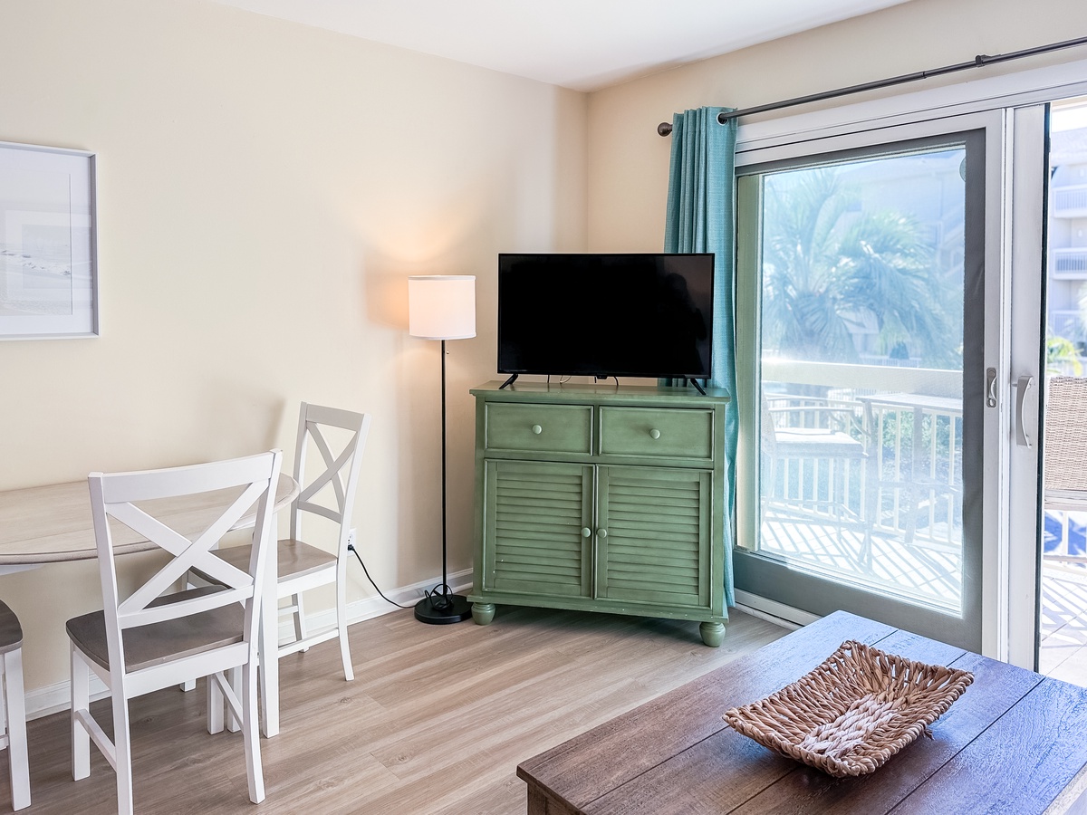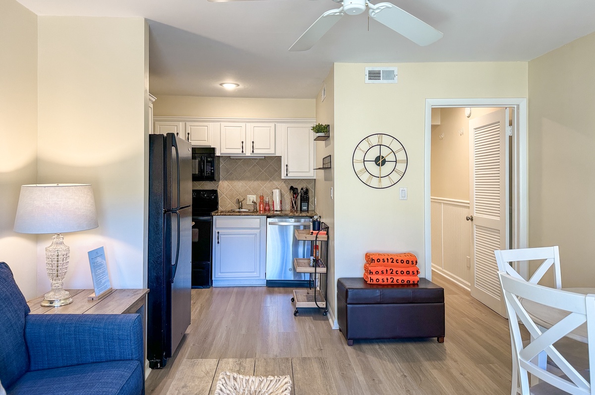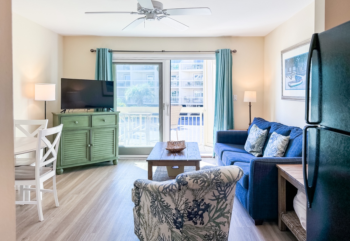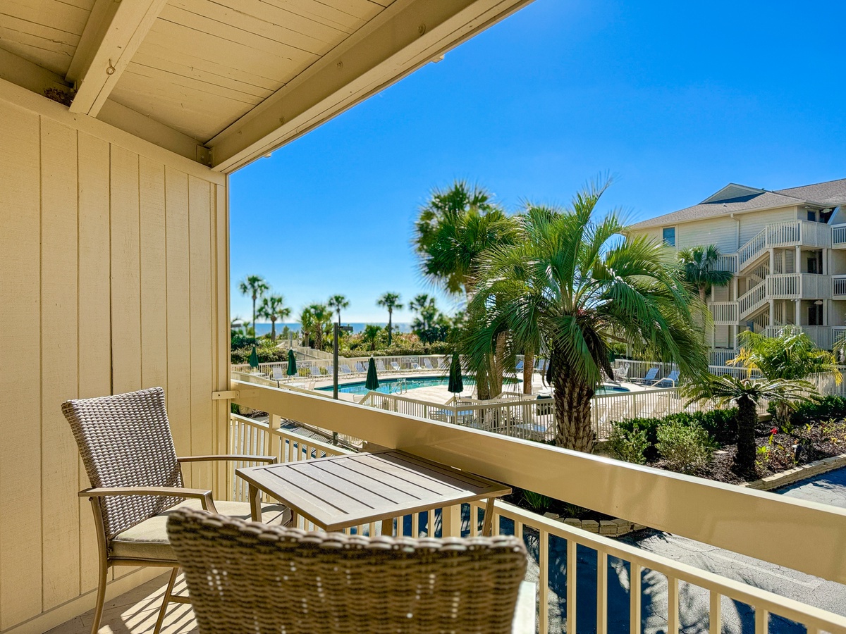 The main bedroom is extremely comfortable and has a queen-sized bed. The kitchen is fully equipped to cater to your cooking needs, and it is connected to a spacious and cozy living room that features a queen-size sleeper sofa to accommodate any additional guests. The living room leads to a balcony through a sliding door, which has seating for two people and offers stunning views of the pool, dunes, and ocean beyond. The bathroom features a tub/shower combo and is shared between the two rooms. You can stay connected with free WiFi throughout the property, and there is a private washer and dryer at your disposal for your convenience.