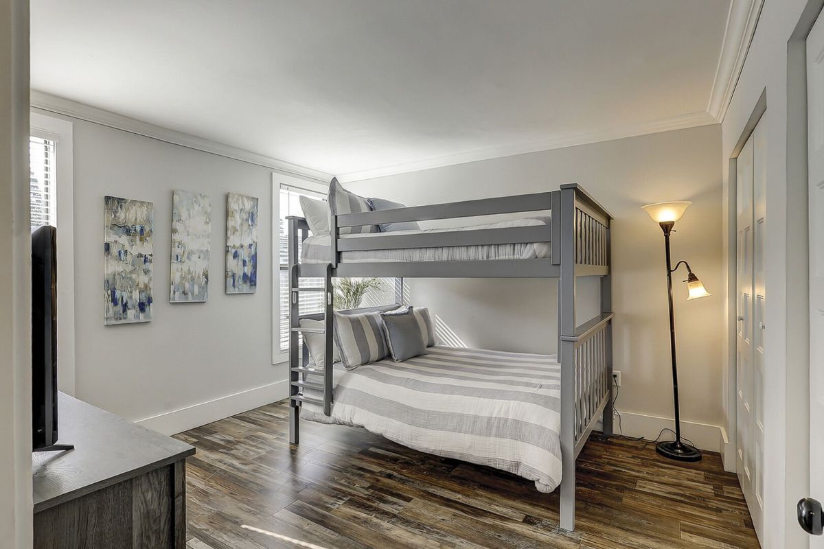 Step into an open living space where coastal décor and natural light combine to create a calm gathering area. The fully equipped kitchen invites casual meals and entertaining. The primary suite is a true sanctuary with a king bed and a private bathroom featuring a walk-in shower. A second bedroom has a queen bed, and the third is set up for fun and flexibility with queen bunk beds. These two guest rooms share a full bathroom with a tub/shower combo. A convenient half bath rounds things out for added ease.