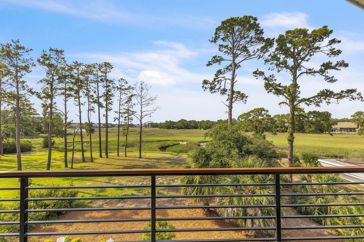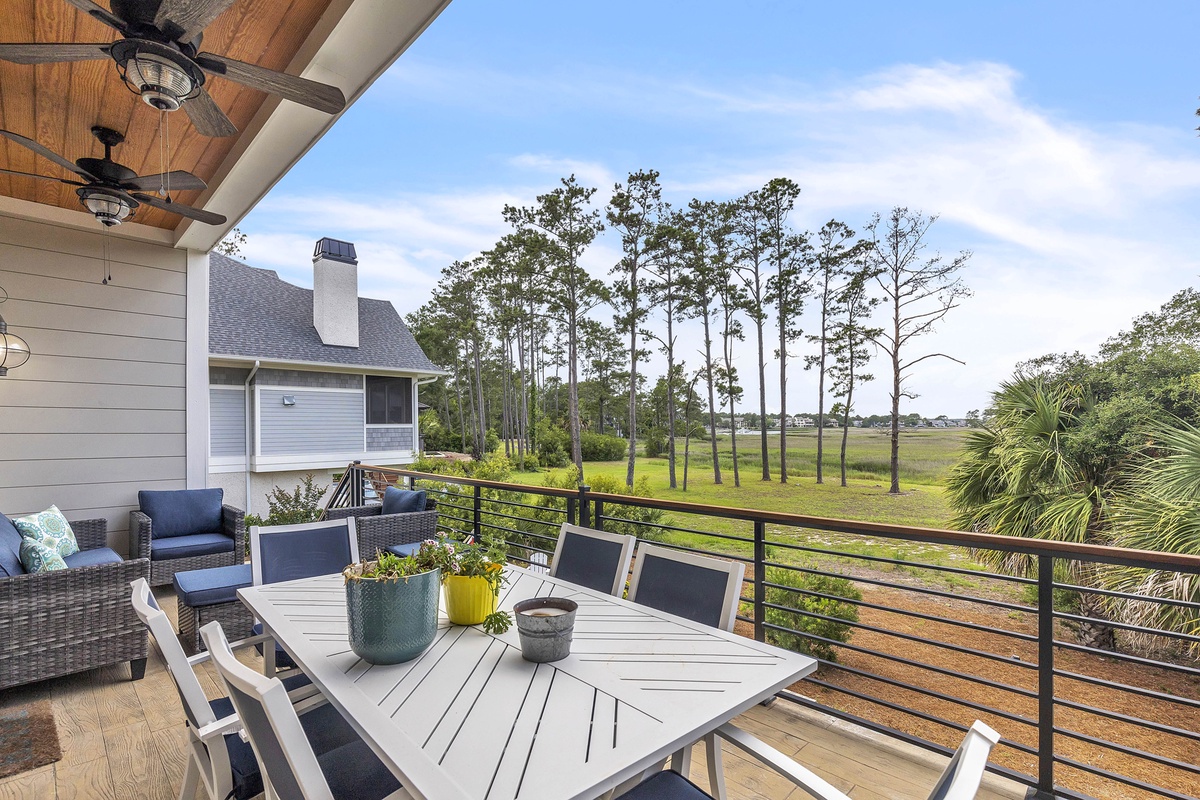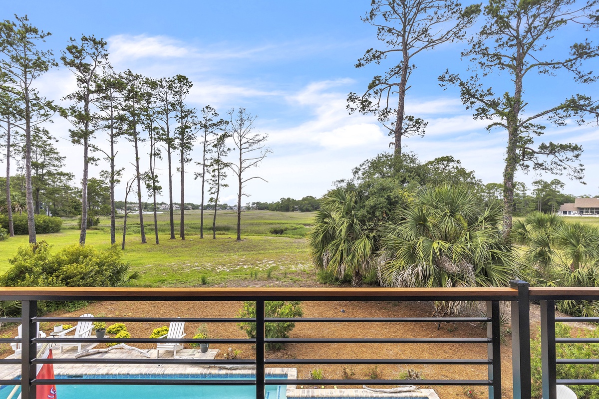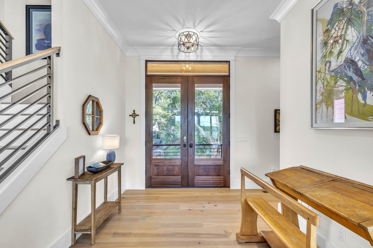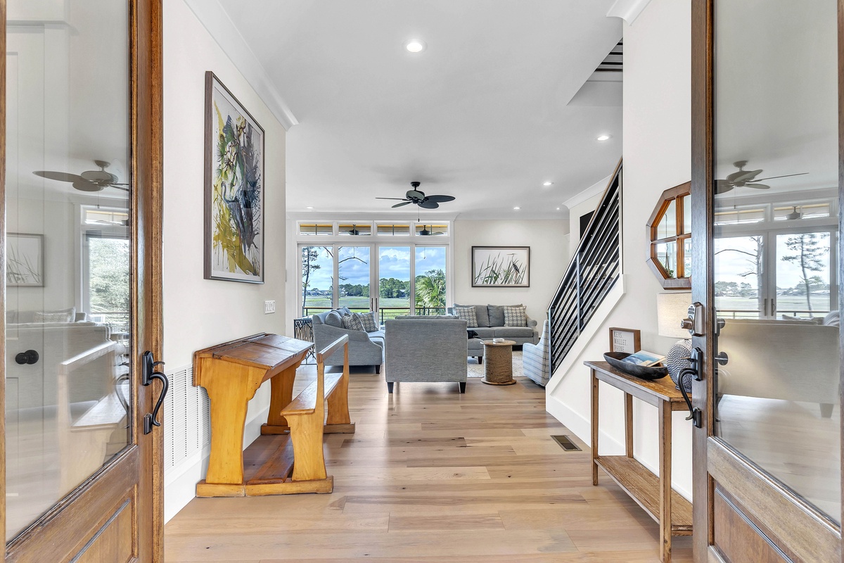 Welcome to "After Dune Delight". This 5-bedroom and 5-bath is a short 5 minute walk to the beach and it has been meticulously designed and furnished with no detail left undone, and it shows. Step through the front doors of the raised first level of the home and be greeted by the open-concept living, dining, and kitchen areas. Floor-to-ceiling windows and sliders open up to the balcony, providing exceptional views of the expansive marshes and tidal creeks below. The well-appointed kitchen has everything you need for making simple snacks or gourmet meals, and ample seating is available at the island and dining table. The primary bedroom is on this first level and features a king bed and a dream bathroom with his and her vanities, a large soaking tub, and a walk-in shower. This bedroom also has access to the balcony. Also on the first level is the office for those who want to work remotely. This office has a queen Murphy bed (that can be set up prior to arrival upon request) and uses its own full bathroom with a shower. The laundry room is situated adjacent to the kitchen.