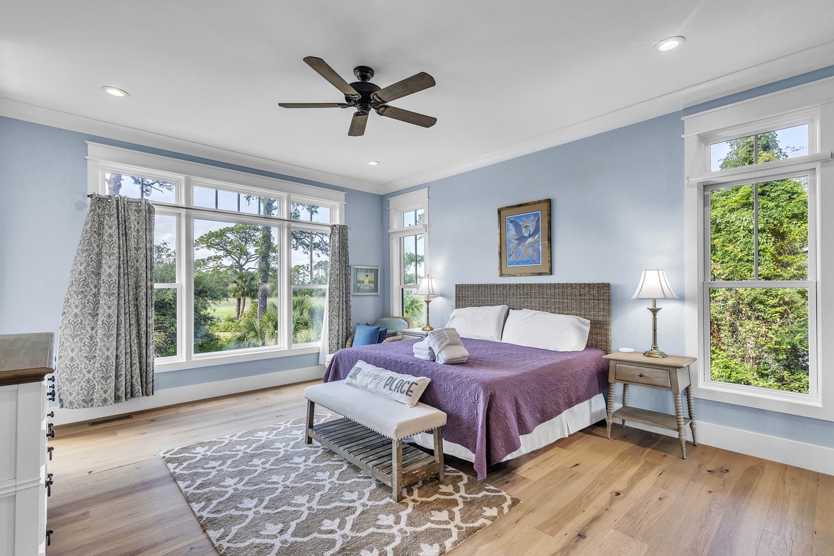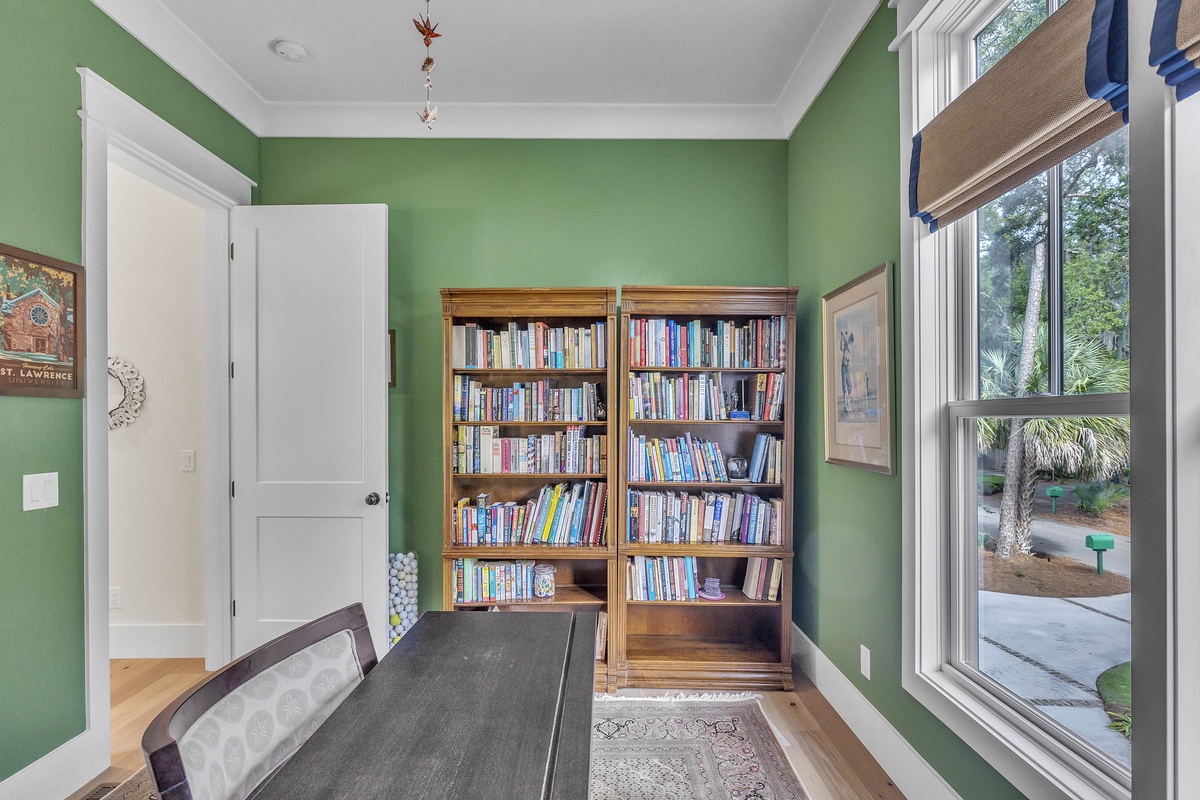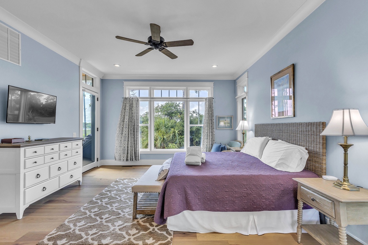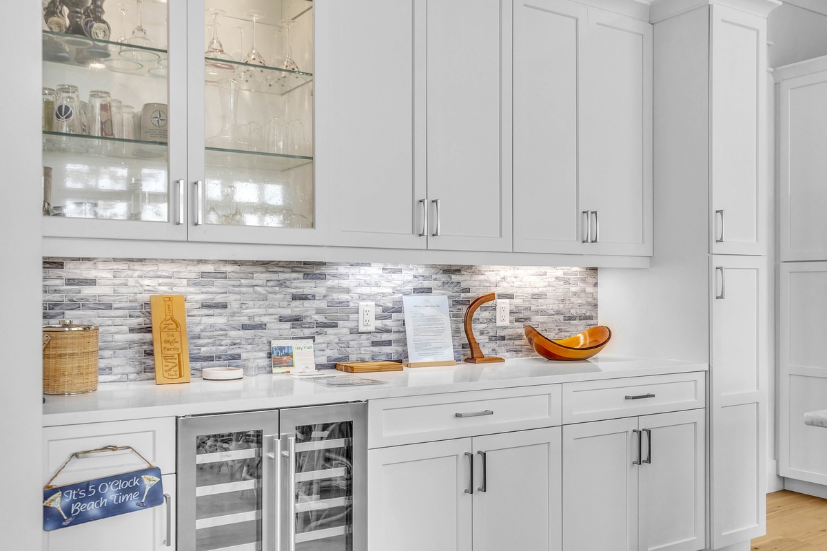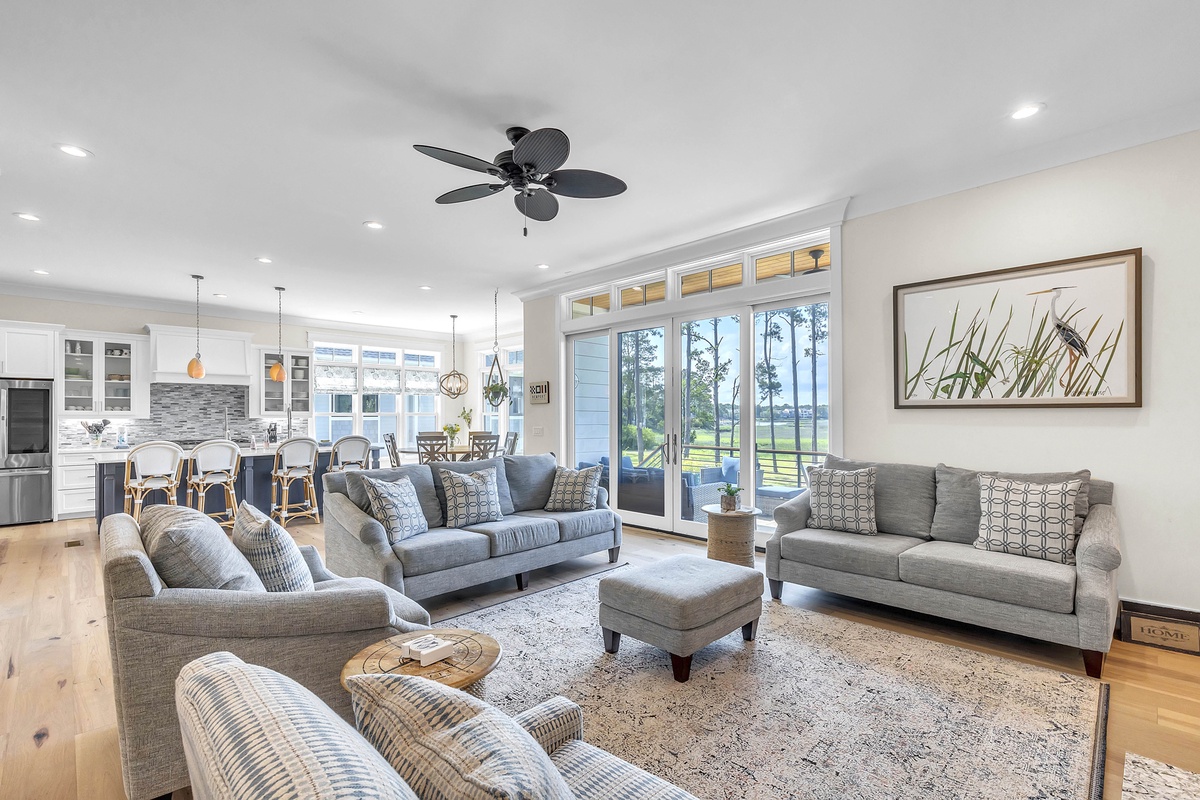 Welcome to "After Dune Delight". This 5-bedroom and 5-bath is a short 5 minute walk to the beach and it has been meticulously designed and furnished with no detail left undone, and it shows. Step through the front doors of the raised first level of the home and be greeted by the open-concept living, dining, and kitchen areas. Floor-to-ceiling windows and sliders open up to the balcony, providing exceptional views of the expansive marshes and tidal creeks below. The well-appointed kitchen has everything you need for making simple snacks or gourmet meals, and ample seating is available at the island and dining table. The primary bedroom is on this first level and features a king bed and a dream bathroom with his and her vanities, a large soaking tub, and a walk-in shower. This bedroom also has access to the balcony. Also on the first level is the office for those who want to work remotely. This office has a queen Murphy bed (that can be set up prior to arrival upon request) and uses its own full bathroom with a shower. The laundry room is situated adjacent to the kitchen.