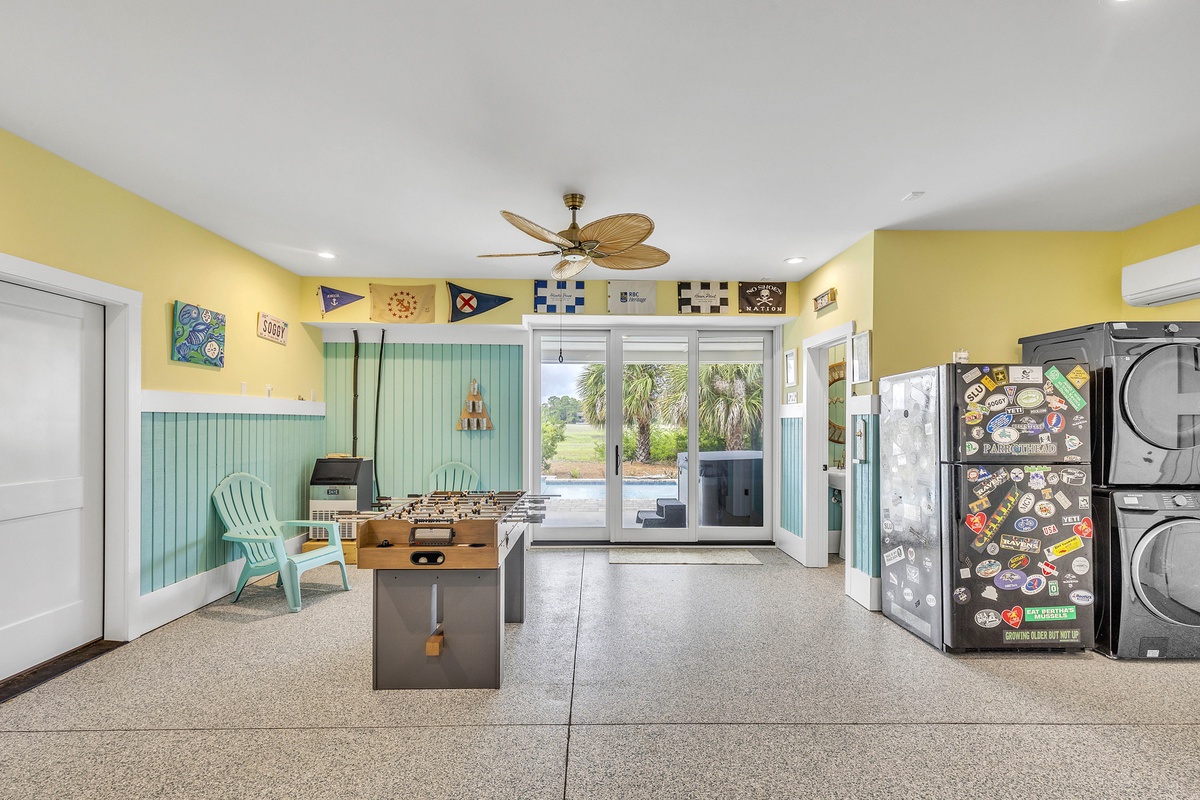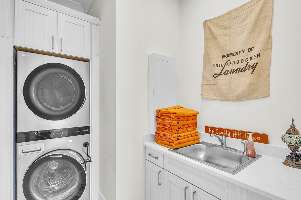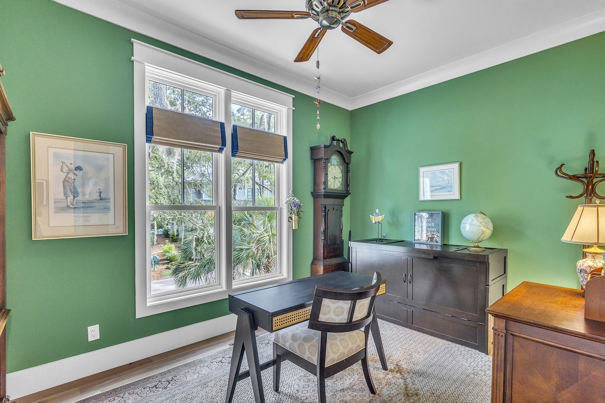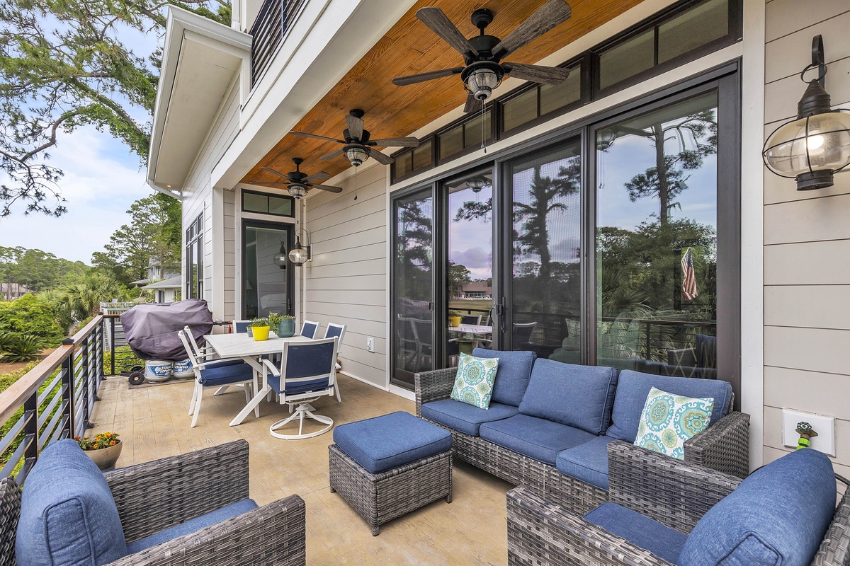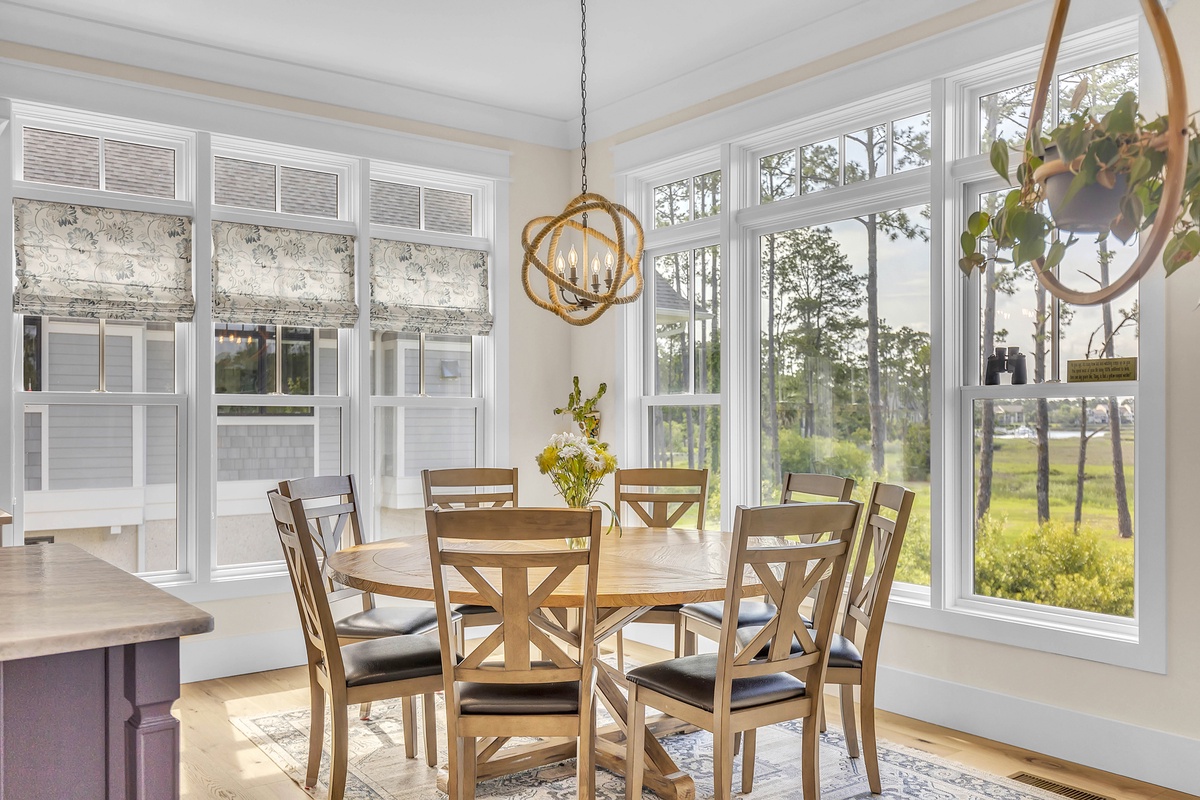 Welcome to "After Dune Delight". This 5-bedroom and 5-bath is a short 5 minute walk to the beach and it has been meticulously designed and furnished with no detail left undone, and it shows. Step through the front doors of the raised first level of the home and be greeted by the open-concept living, dining, and kitchen areas. Floor-to-ceiling windows and sliders open up to the balcony, providing exceptional views of the expansive marshes and tidal creeks below. The well-appointed kitchen has everything you need for making simple snacks or gourmet meals, and ample seating is available at the island and dining table. The primary bedroom is on this first level and features a king bed and a dream bathroom with his and her vanities, a large soaking tub, and a walk-in shower. This bedroom also has access to the balcony. Also on the first level is the office for those who want to work remotely. This office has a queen Murphy bed (that can be set up prior to arrival upon request) and uses its own full bathroom with a shower. The laundry room is situated adjacent to the kitchen.