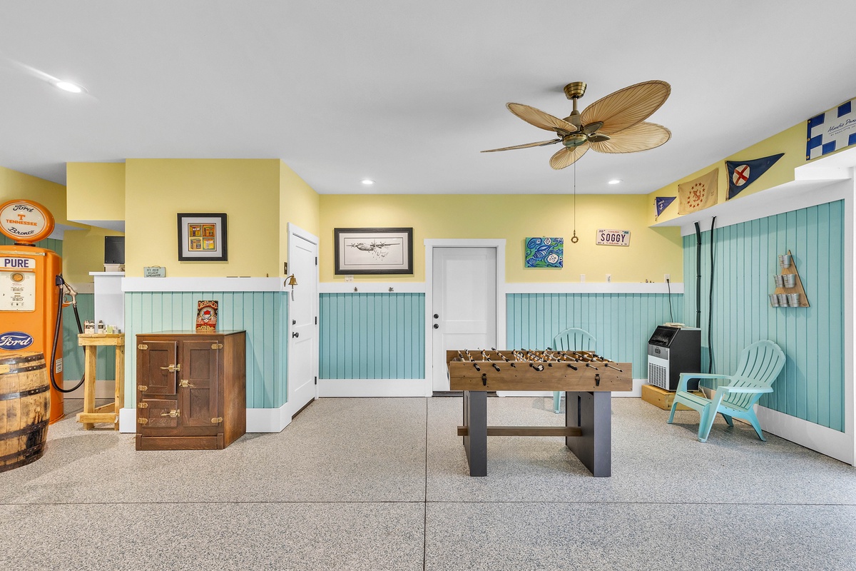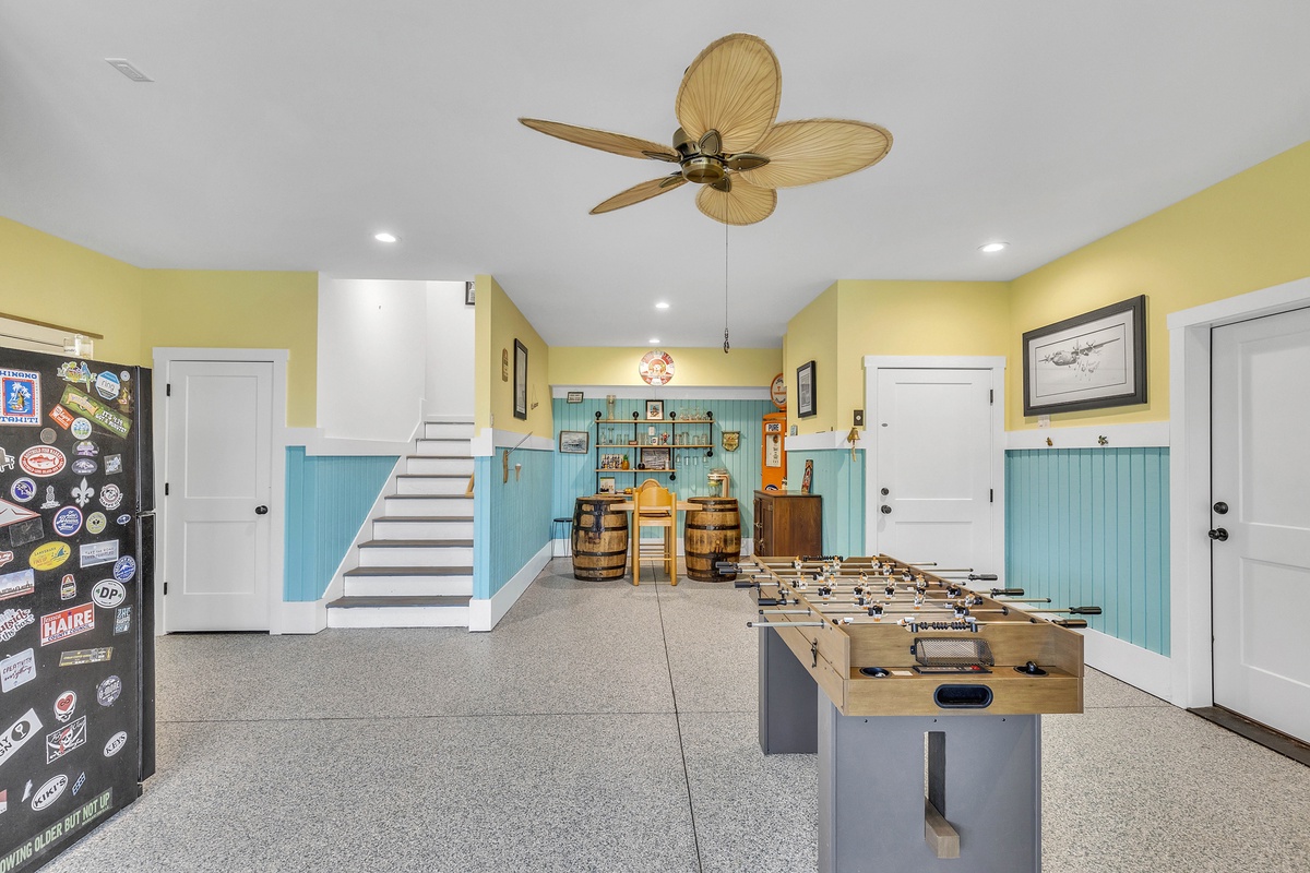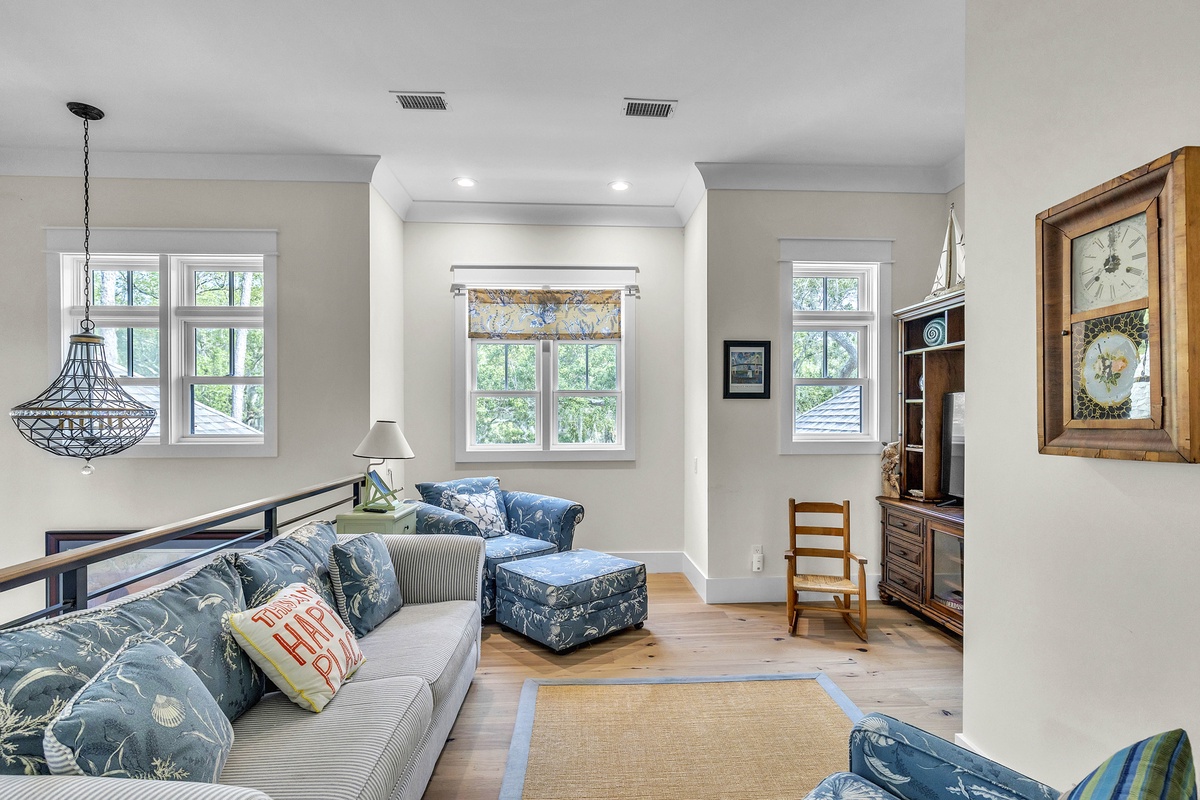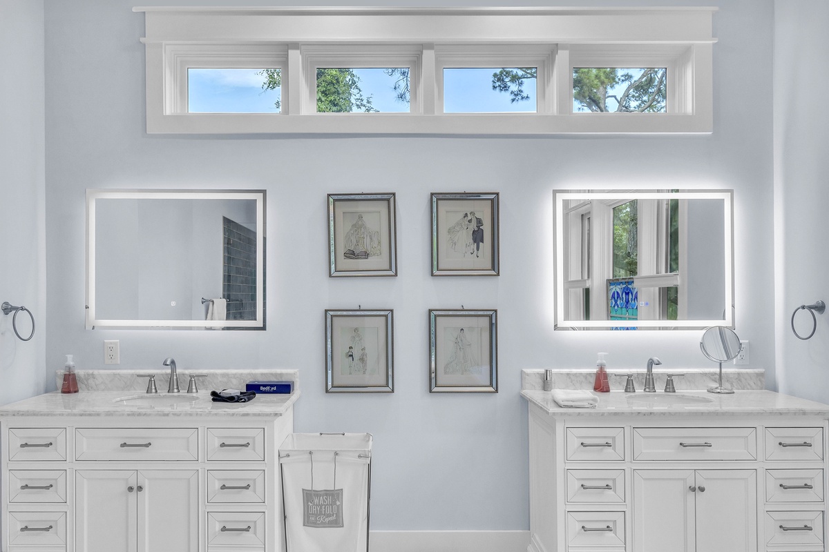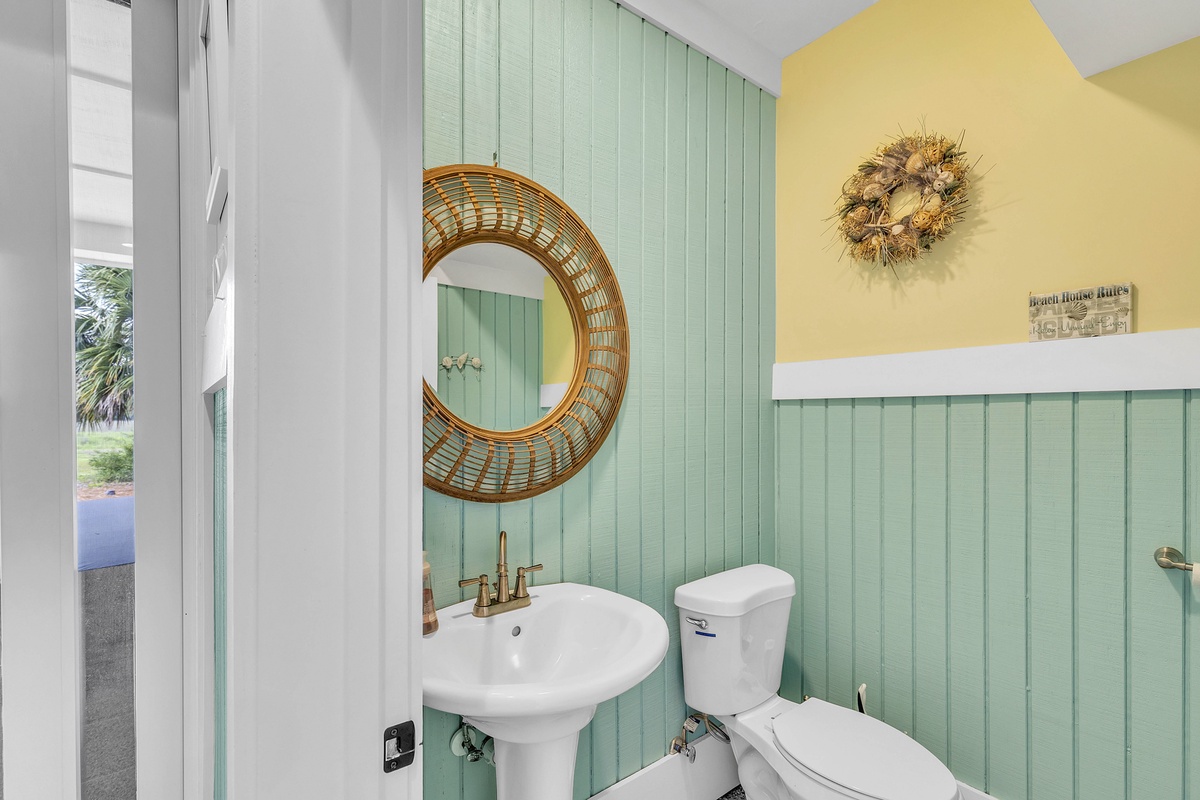Welcome to "After Dune Delight". This 5-bedroom and 5-bath is a short 5 minute walk to the beach and it has been meticulously designed and furnished with no detail left undone, and it shows. Step through the front doors of the raised first level of the home and be greeted by the open-concept living, dining, and kitchen areas. Floor-to-ceiling windows and sliders open up to the balcony, providing exceptional views of the expansive marshes and tidal creeks below. The well-appointed kitchen has everything you need for making simple snacks or gourmet meals, and ample seating is available at the island and dining table. The primary bedroom is on this first level and features a king bed and a dream bathroom with his and her vanities, a large soaking tub, and a walk-in shower. This bedroom also has access to the balcony. Also on the first level is the office for those who want to work remotely. This office has a queen Murphy bed (that can be set up prior to arrival upon request) and uses its own full bathroom with a shower. The laundry room is situated adjacent to the kitchen.