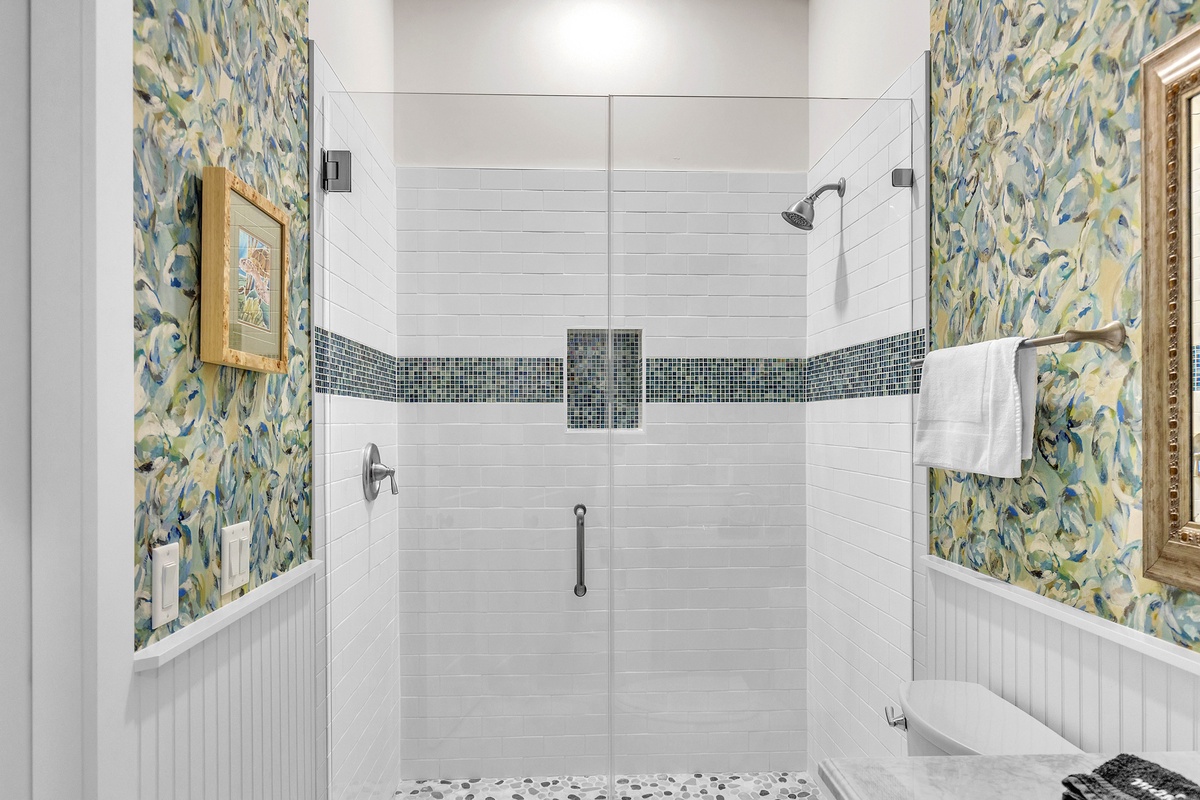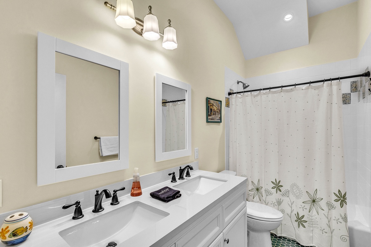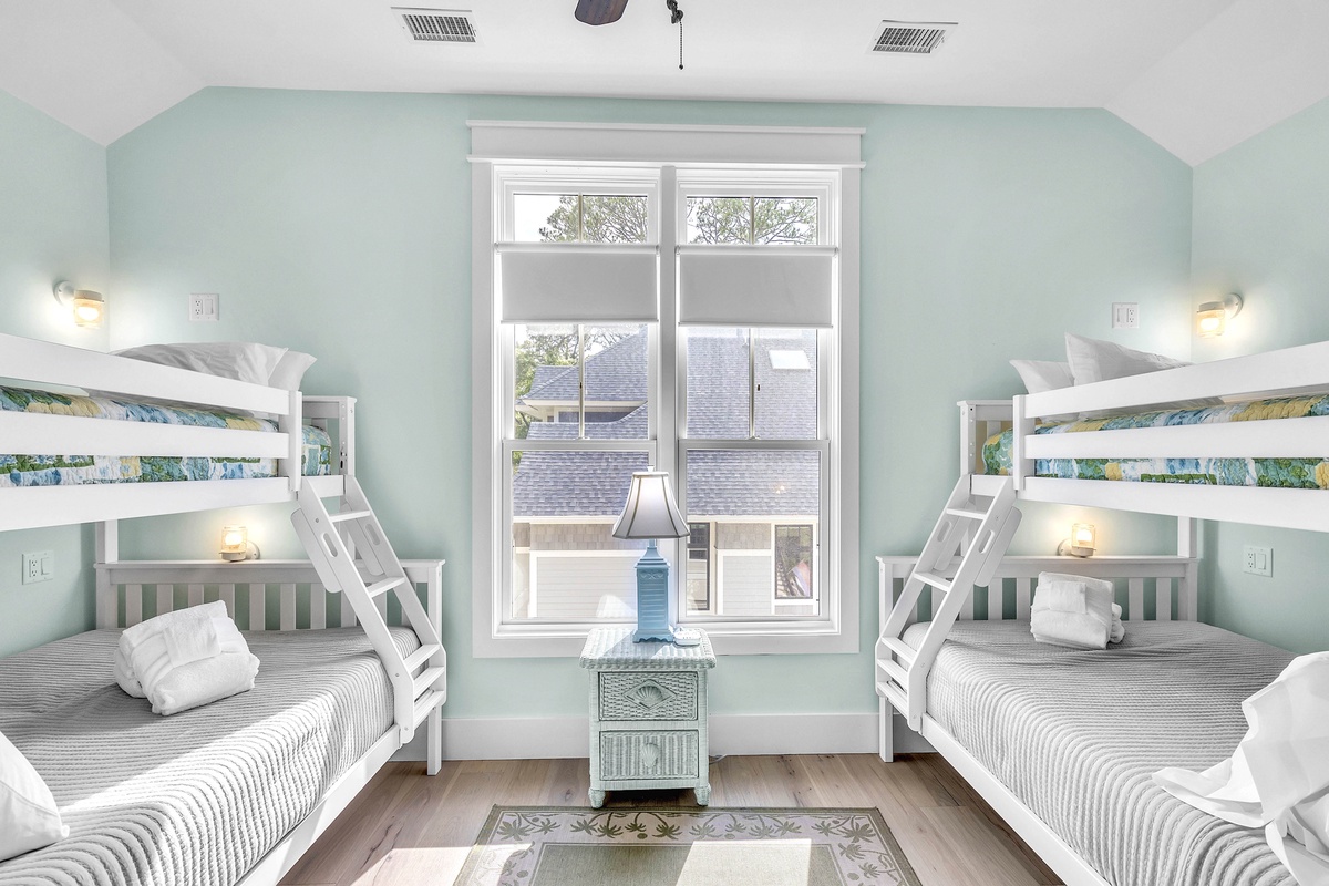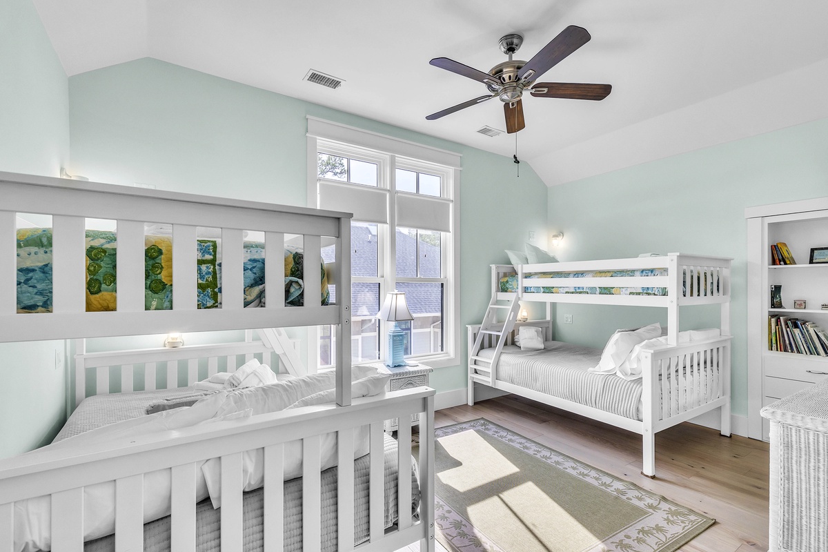On the 2nd level, there are the 3 additional bedrooms. The 1st is another king suite with its own balcony and a full bathroom with a walk-in shower. The 2nd is a queen suite that includes a twin pull-out a full bathroom with walk-in shower. The last bedroom is the kid's suite with 2 twin-over-full bunk beds and a shower/tub combo.