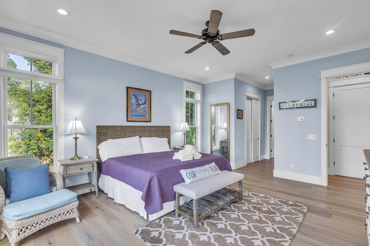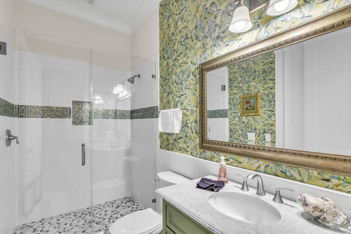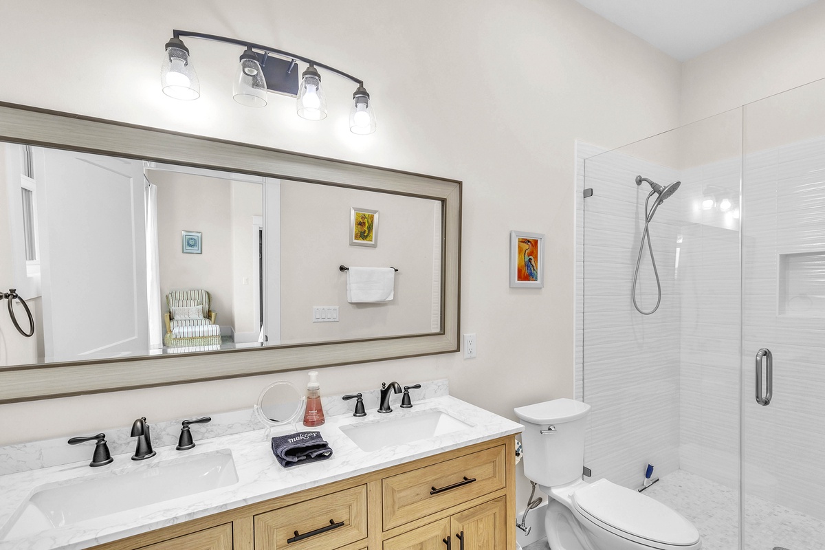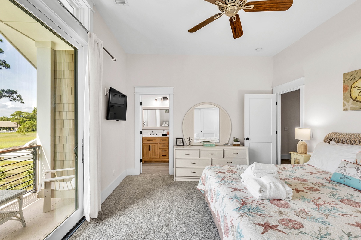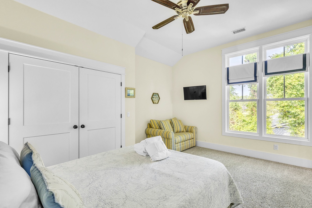 On the 2nd level, there are the 3 additional bedrooms. The 1st is another king suite with its own balcony and a full bathroom with a walk-in shower. The 2nd is a queen suite that includes a twin pull-out a full bathroom with walk-in shower. The last bedroom is the kid's suite with 2 twin-over-full bunk beds and a shower/tub combo.