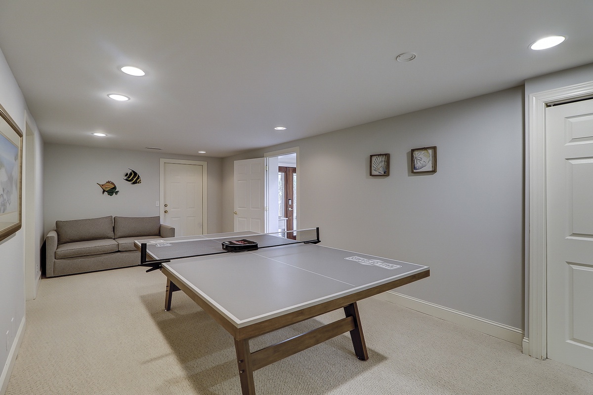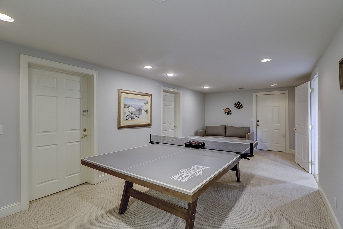 The upper level of the house boasts two king-sized bedrooms, each equipped with its own luxurious en-suite bathroom. Additionally, there is a queen-sized bedroom that can accommodate two people and a playful kids' bunk room that comes with a trundle bed, allowing three little ones to sleep comfortably. Moving to the lower level, you'll find two more cozy bedrooms, one furnished with a queen bed and the other with two twins, as well as a bonus space that features a pull-out sleeper sofa. The game room is also located downstairs and comes equipped with a ping pong table, which is sure to entertain any competitive guests in the group!