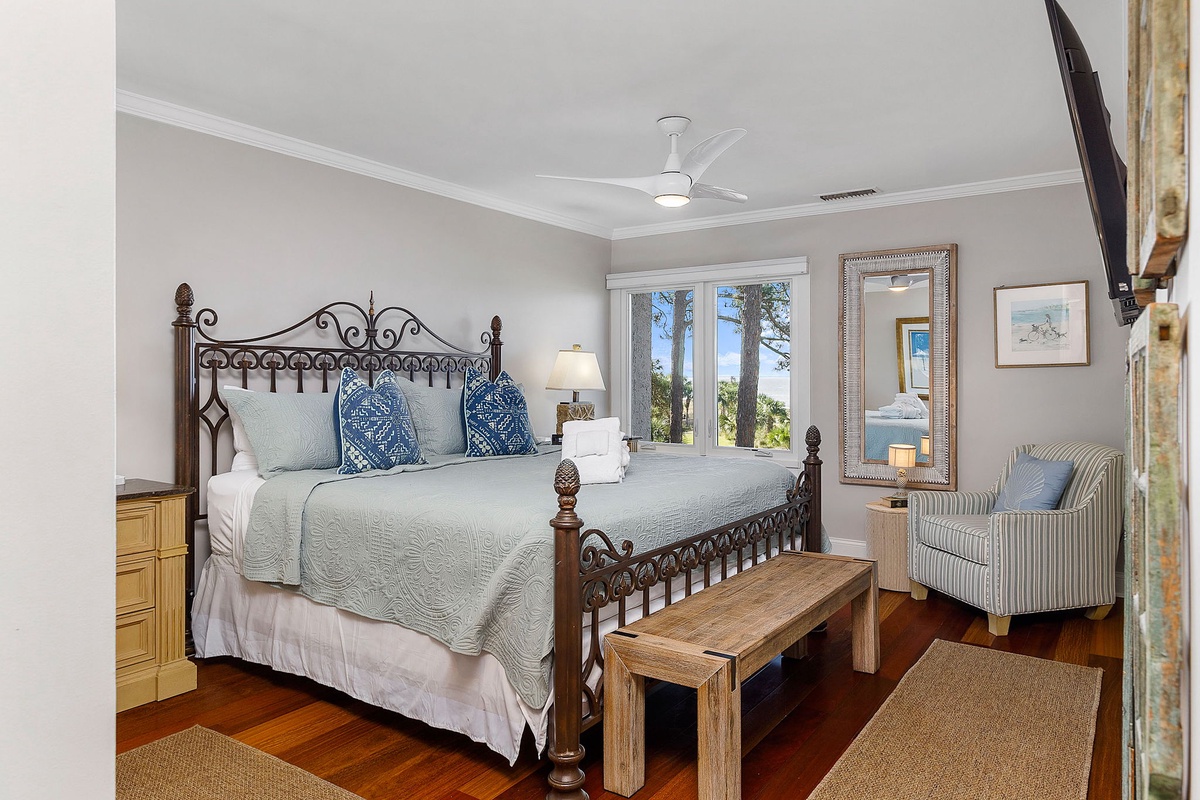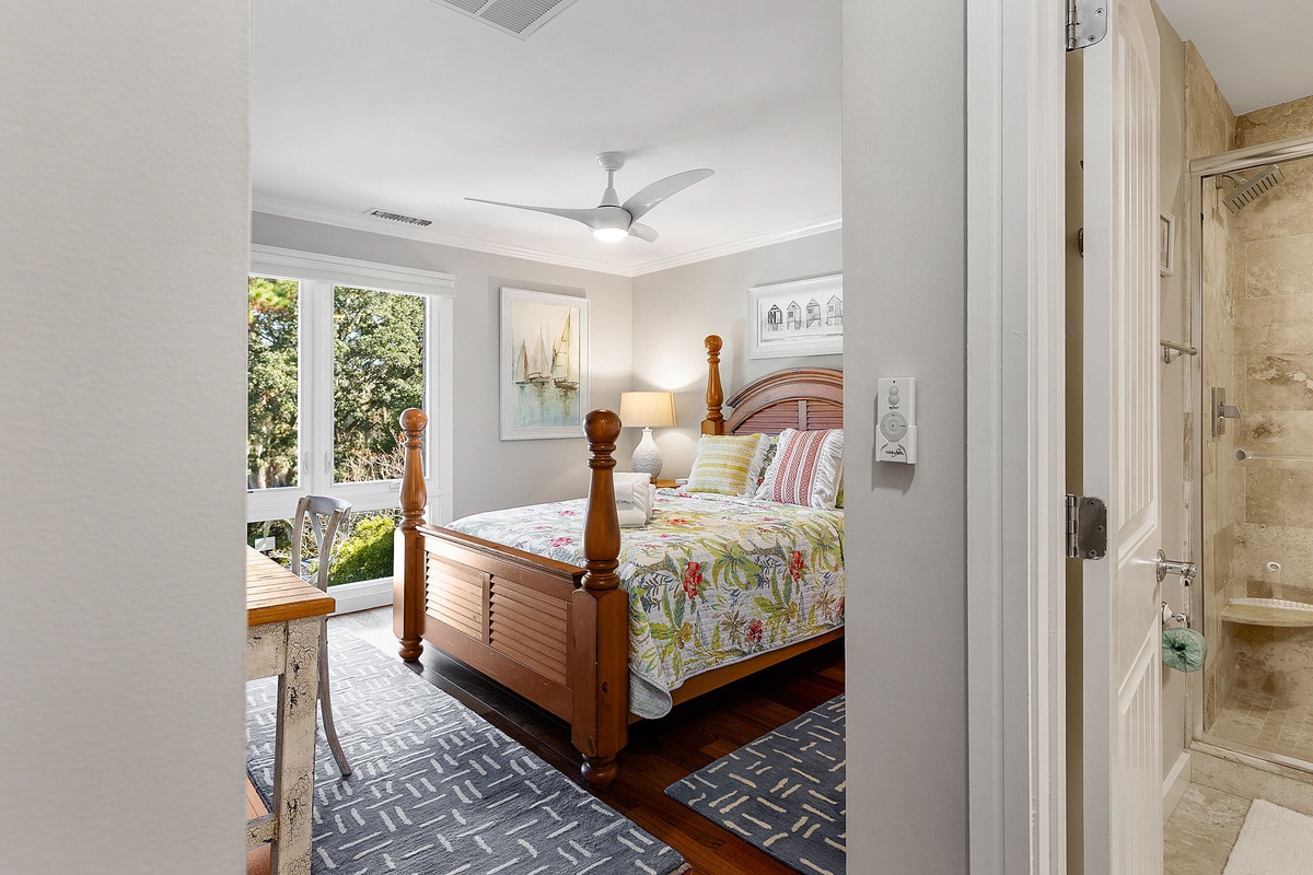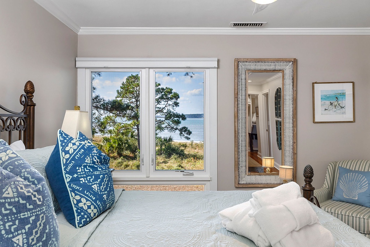 This exquisite villa boasts 4 bedrooms and 4 bathrooms and is situated in the center of South Beach. A secluded private beach is just a quick 50-step stroll away. Additionally, guests have access to a shared pool that is conveniently located right near the front entrance. 1456 Sound Villas is situated between Calibogue Sound and the Braddock Cove inlet in South Beach and you are able to take in the panoramic ocean views of the Calibogue Sound and Daufuskie Island from either of the two private outdoor spaces. The sliding glass doors from the balcony open to the lower level patio where you can barbeque on the gas grill and dine alfresco at the outdoor table or enjoy the second-story deck offers another table beneath an umbrella and more stunning views of the sound. The private beach is just a few feet away, and it's easy to walk to South Beach Marina and the South Beach Racquet Club. This is a popular area for golf enthusiasts, and you can enjoy swimming, building sandcastles, and even spotting dolphins. During the summer season, you can take a complimentary Sea Pines trolley around the plantation to visit all the shops and restaurants and see a family-friendly live concert under the famous Liberty Oak in Harbour Town. After sightseeing, you can head to the tennis and pickleball courts across the street or enjoy the sun and sand at the nearby Salty Dog Marina. There are also plenty of restaurants and shops to explore, and visitors have access to boat, kayak, and jet ski rentals. Don't forget to indulge in a romantic sunset cruise for the ultimate experience.