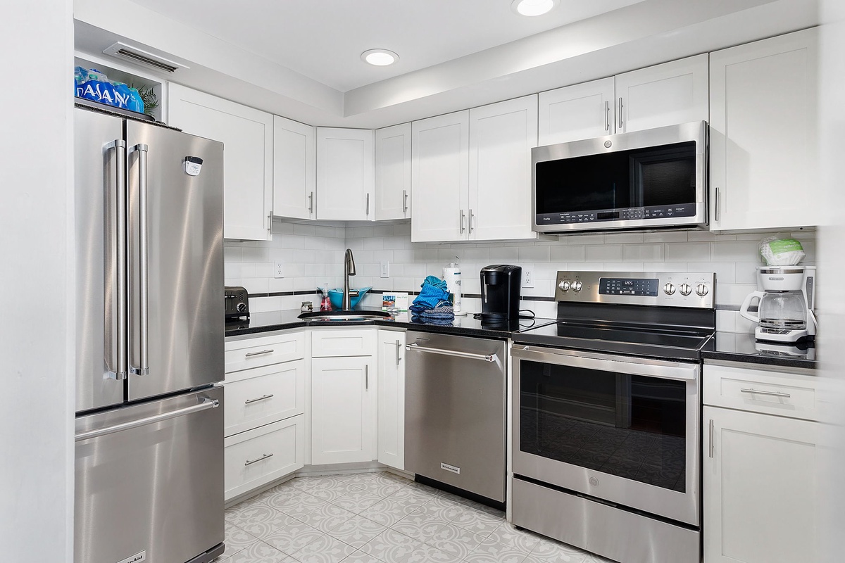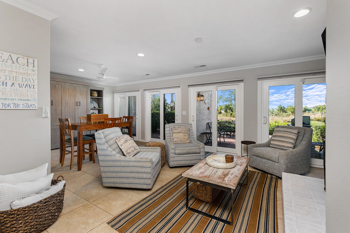 You'll love the modern and beachy feel of this villa, with its gorgeous high ceilings and beautiful hardwood floors. Take a load off in the comfy living area, where you can sink into a plush sofa or lounge in a luxurious armchair. Plus, you'll appreciate the convenience of having a wet bar right there at your fingertips. Looking for a great place to hang out during the day to beat the heat? Look no further than the game room in the lower-level den! With comfy armchairs and a 55-inch TV, it's the perfect spot for card games or movie nights. There is also a queen Murphy bed located on this level. And when you're hungry, the modern kitchen has everything you need - from black granite countertops to top-of-the-line stainless steel appliances. Whether you're grabbing a quick cup of coffee at the breakfast bar or enjoying a family meal at the dining table, you're sure to feel right at home.