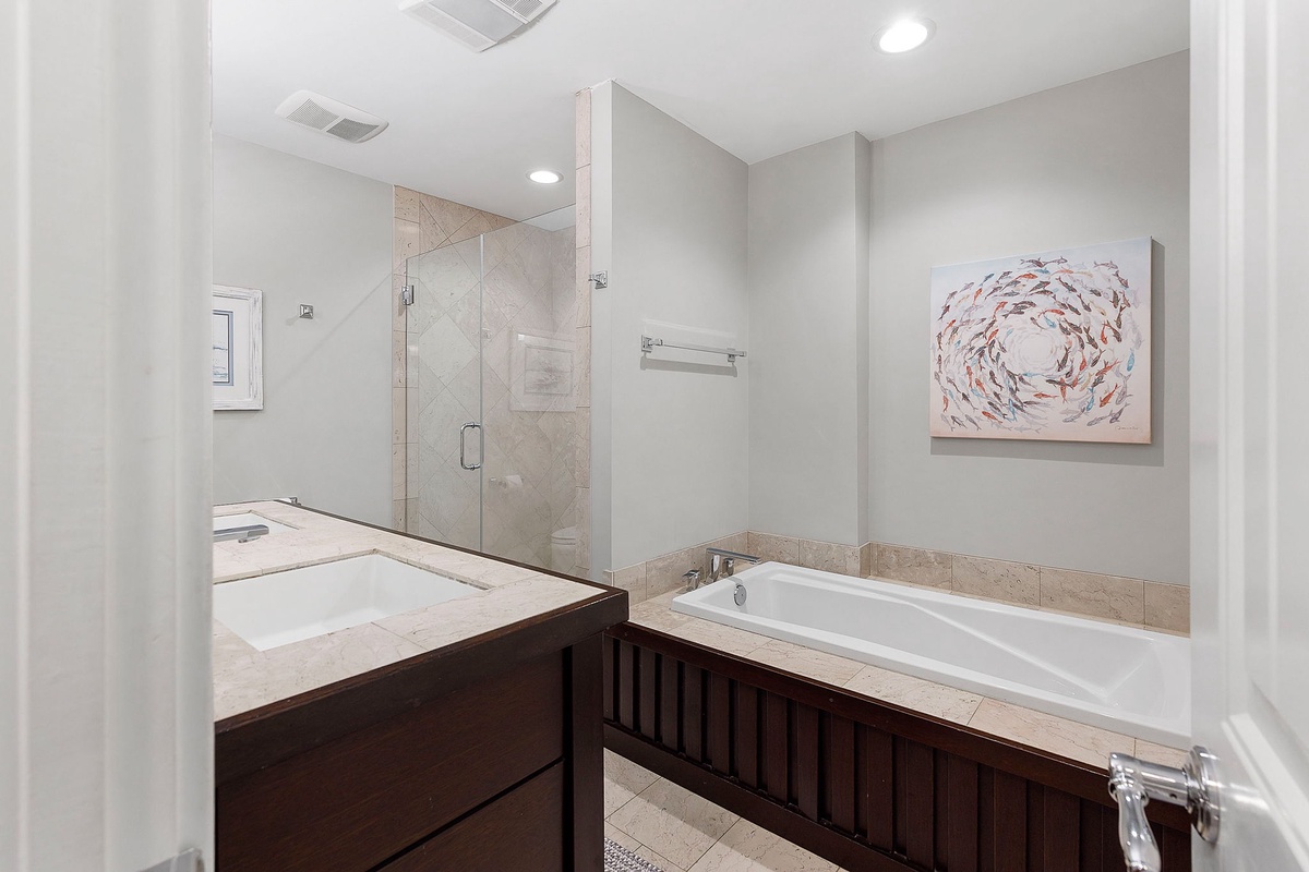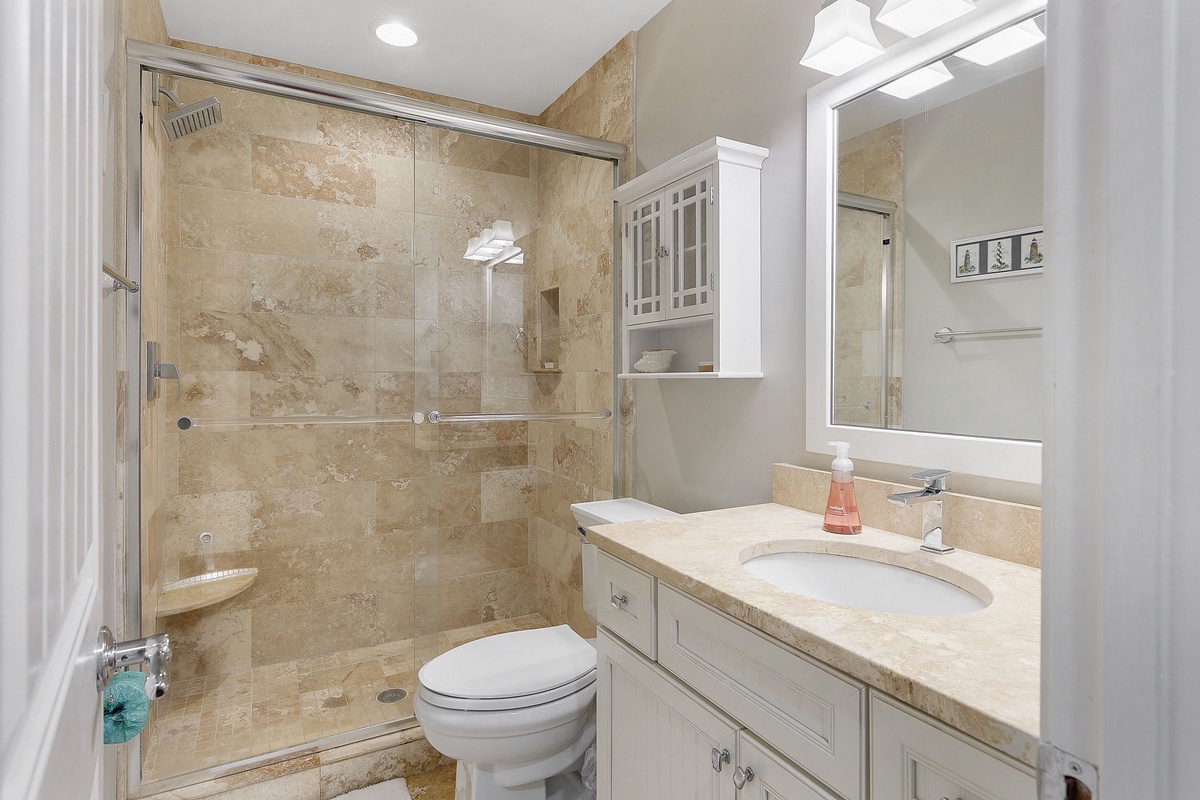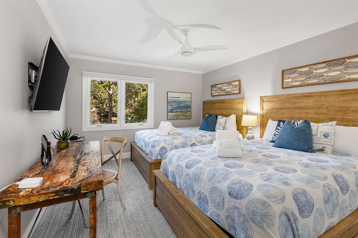 You can find peaceful tranquility in the primary bedroom, which features a 55-inch TV and oversized windows facing the beach. The en suite main bathroom boasts a double vanity, a walk-in shower, and a soaking tub. Two guest bedrooms, one with a queen bed and the other with two queen beds, also feature 55-inch TVs. The single queen bedroom has an ensuite bathroom with a walk-in shower. The bedroom with two queen beds also features a dedicated hall bath with a walk-in shower. The game room can also be transformed into another bedroom with a queen Murphy bed, and a fourth full bathroom is found on this level with a shower/tub combo.