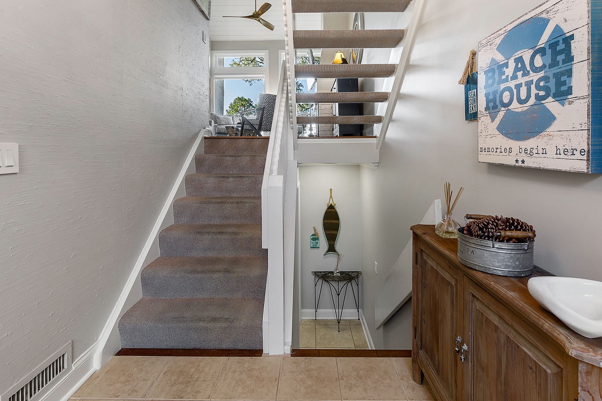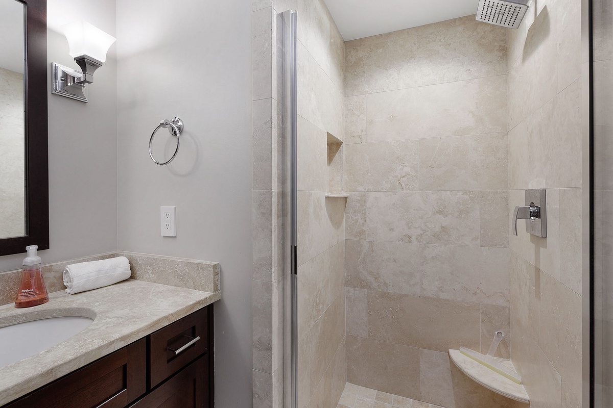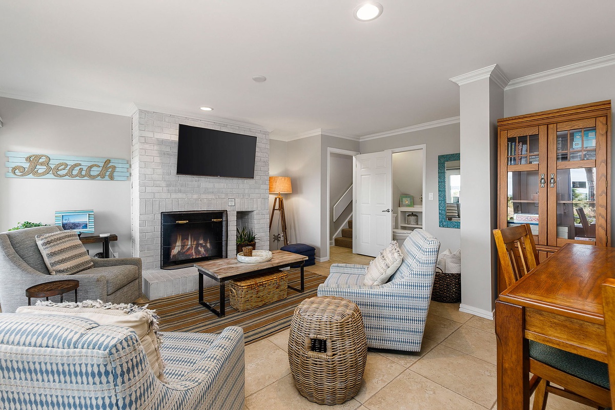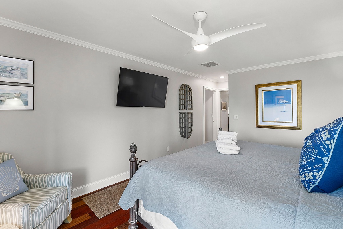 You can find peaceful tranquility in the primary bedroom, which features a 55-inch TV and oversized windows facing the beach. The en suite main bathroom boasts a double vanity, a walk-in shower, and a soaking tub. Two guest bedrooms, one with a queen bed and the other with two queen beds, also feature 55-inch TVs. The single queen bedroom has an ensuite bathroom with a walk-in shower. The bedroom with two queen beds also features a dedicated hall bath with a walk-in shower. The game room can also be transformed into another bedroom with a queen Murphy bed, and a fourth full bathroom is found on this level with a shower/tub combo.