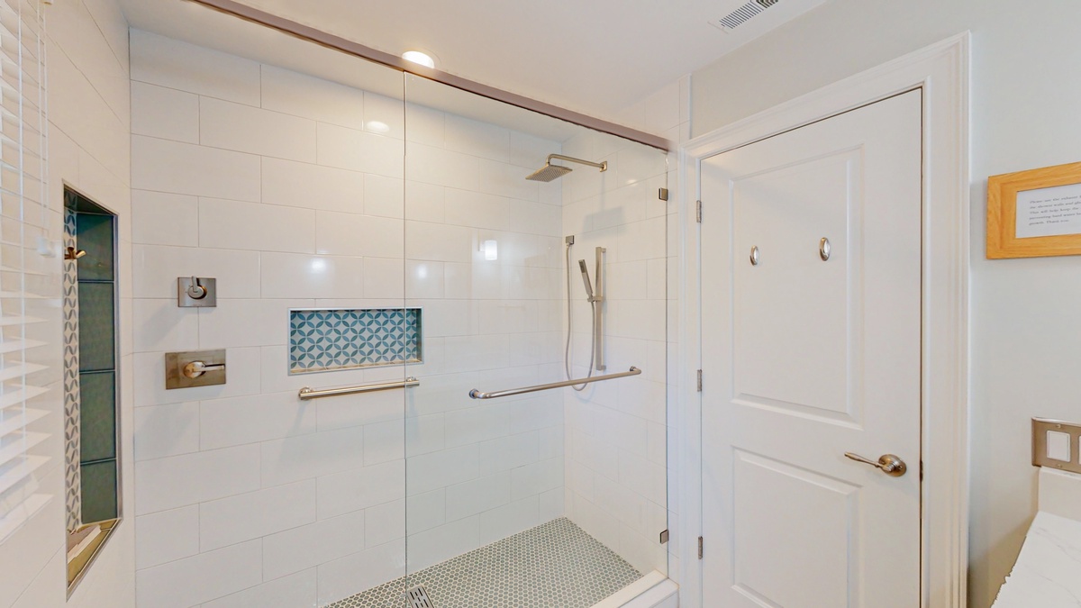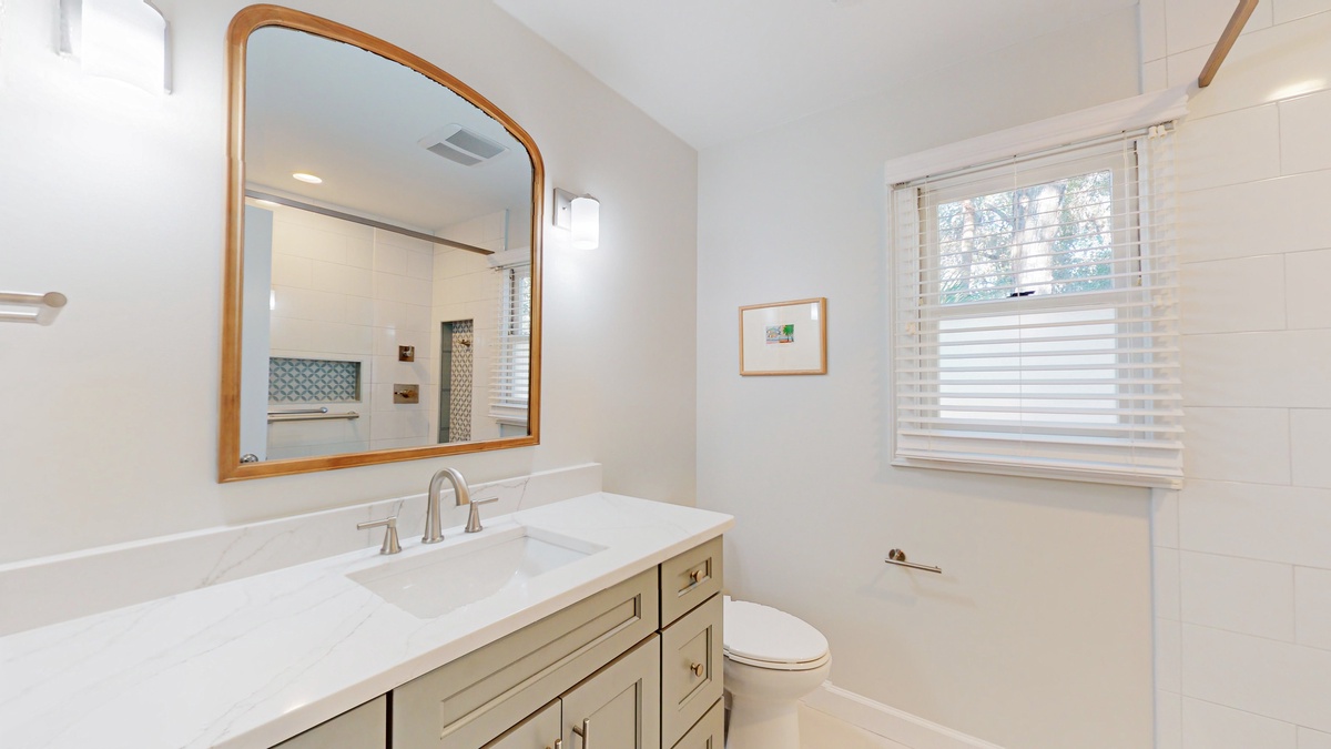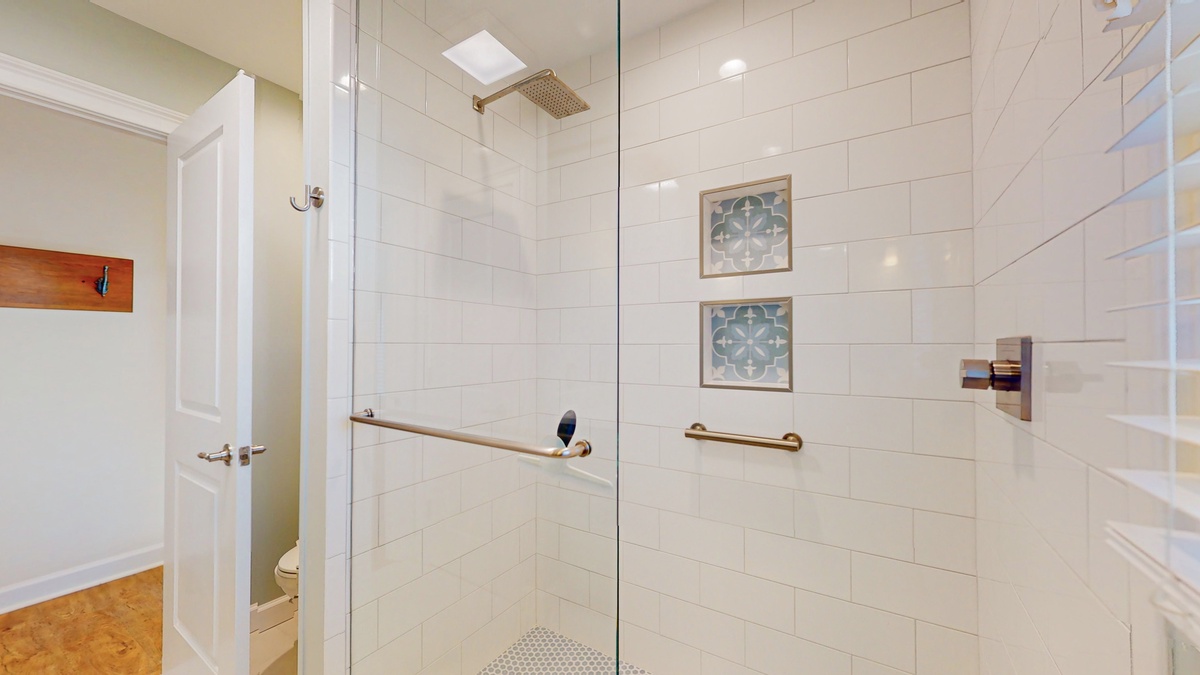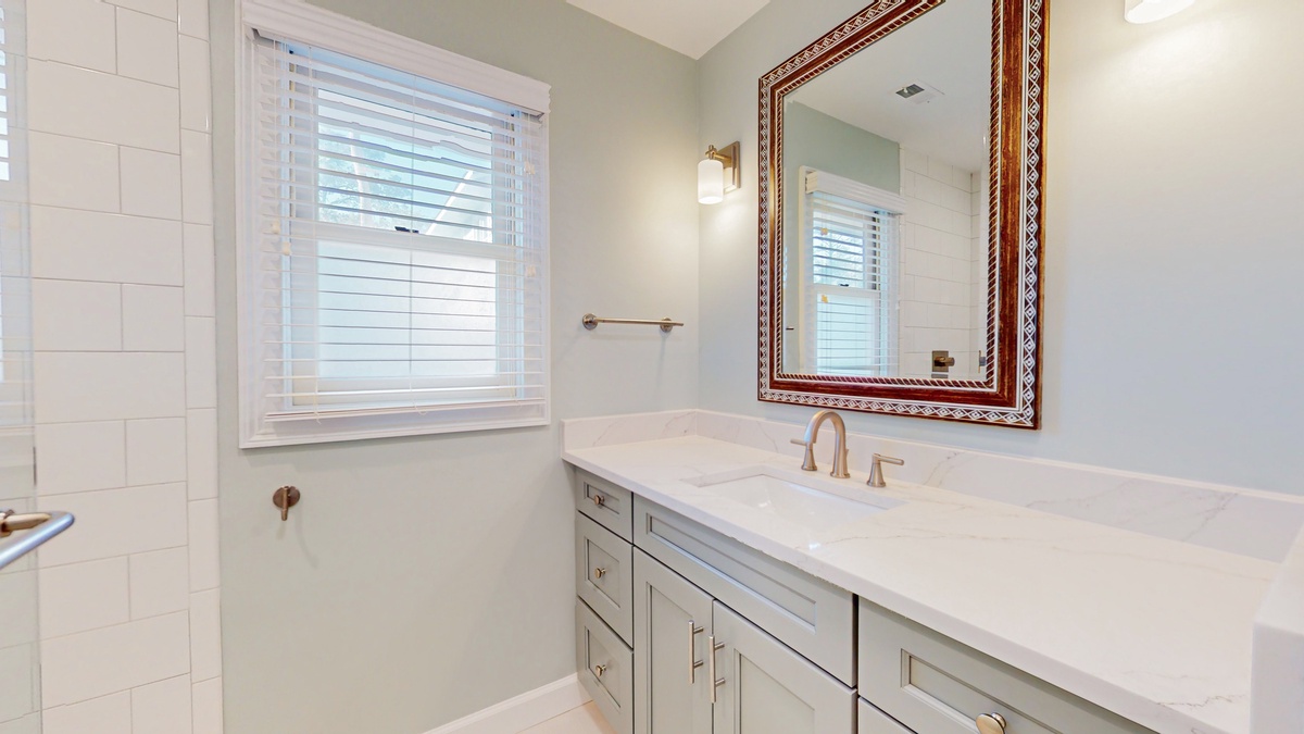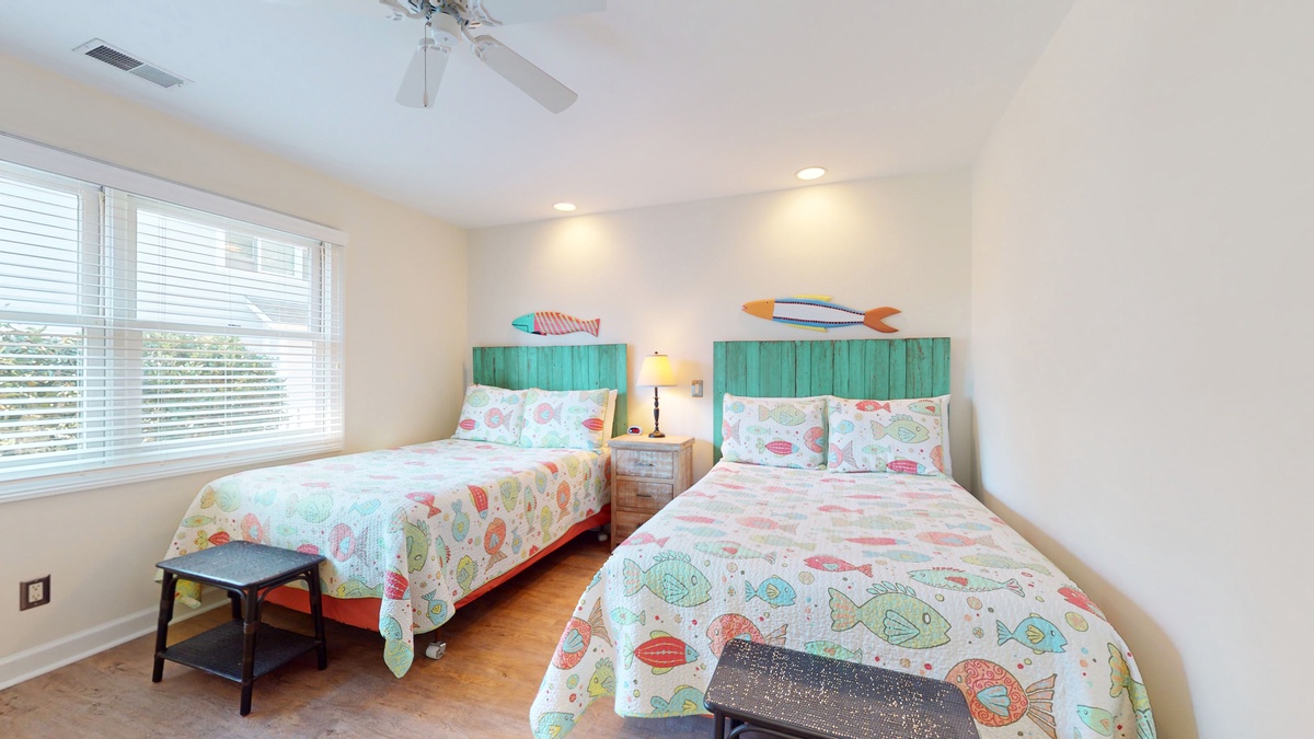 The primary suite is a peaceful sanctuary designed for rest and relaxation. A king sized bed, flat screen TV, and soothing coastal tones create a calming atmosphere. The newly renovated en suite bathroom showcases a custom tiled walk in shower and a quartz countertop vanity that adds a touch of understated luxury. Down the hall, two beautifully appointed guest bedrooms ensure comfort for everyone. One features two double beds and a flat screen TV, while the other offers a queen sized bed, flat screen TV, and direct access to the private deck. These rooms share a renovated full bath complete with another custom tiled walk in shower and quartz vanity, offering both style and convenience!