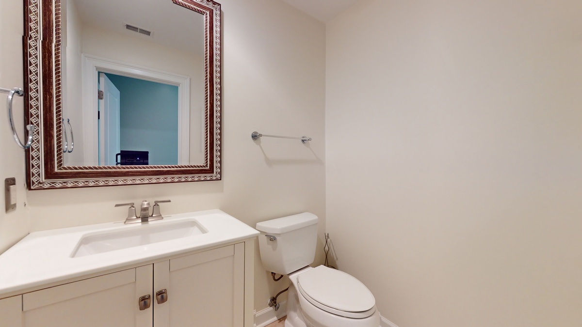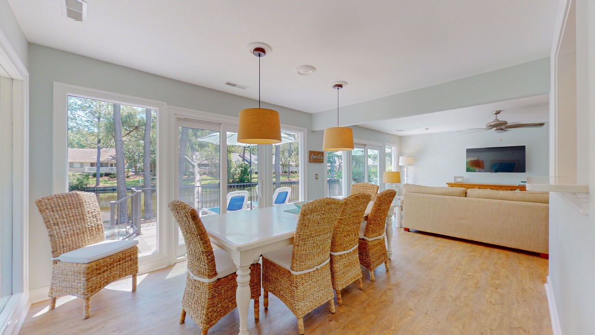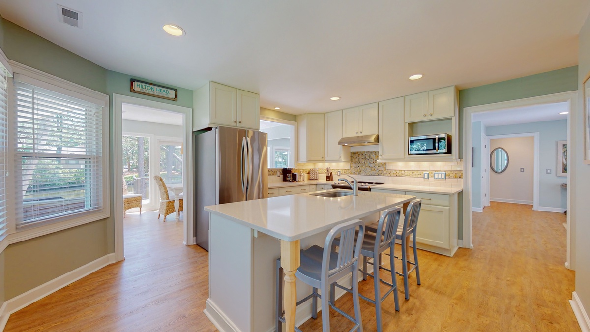 Step inside and discover an open concept living and dining space designed for gathering and connection. The spacious living room offers plush seating where conversations flow easily after a day at the beach. The dining area comfortably seats eight, making it perfect for family dinners filled with laughter and stories of sun soaked adventures. Just beyond, the fully stocked kitchen glows with natural light, featuring stainless steel appliances and a large quartz island with seating for three, inviting everyone to linger a little longer.