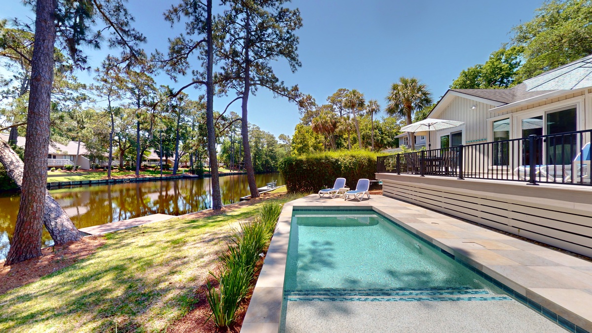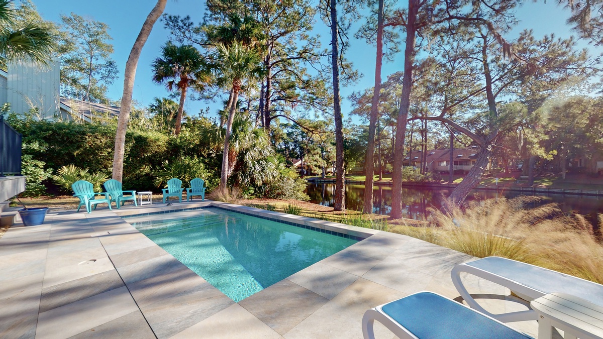 Outdoor living is where this home truly shines. The expansive private deck overlooks the stunning eleven mile lagoon system, where shimmering waters reflect the Carolina sky and native birds glide overhead. Spend your afternoons lounging by the private pool, grilling fresh seafood, or enjoying meals at the outdoor dining set surrounded by lush greenery. Lounge chairs invite you to soak up the sun, while the gentle island breeze carries the scent of salt air through the palms.