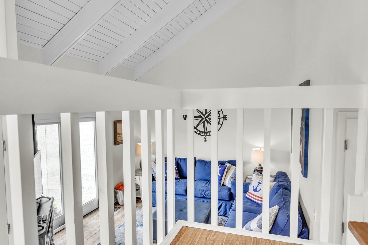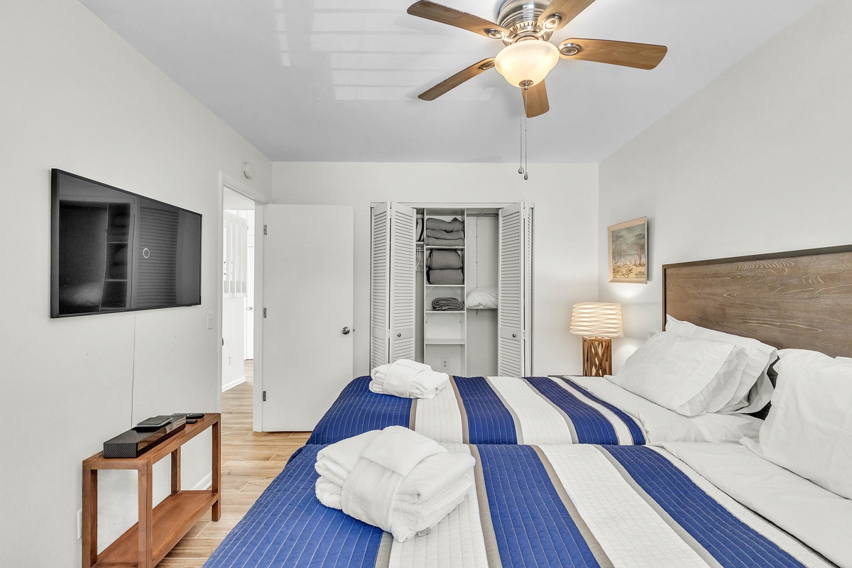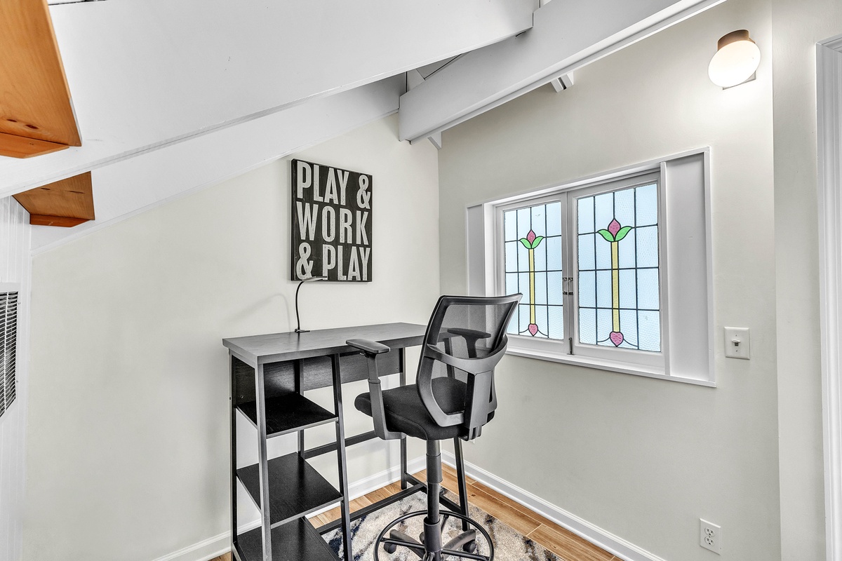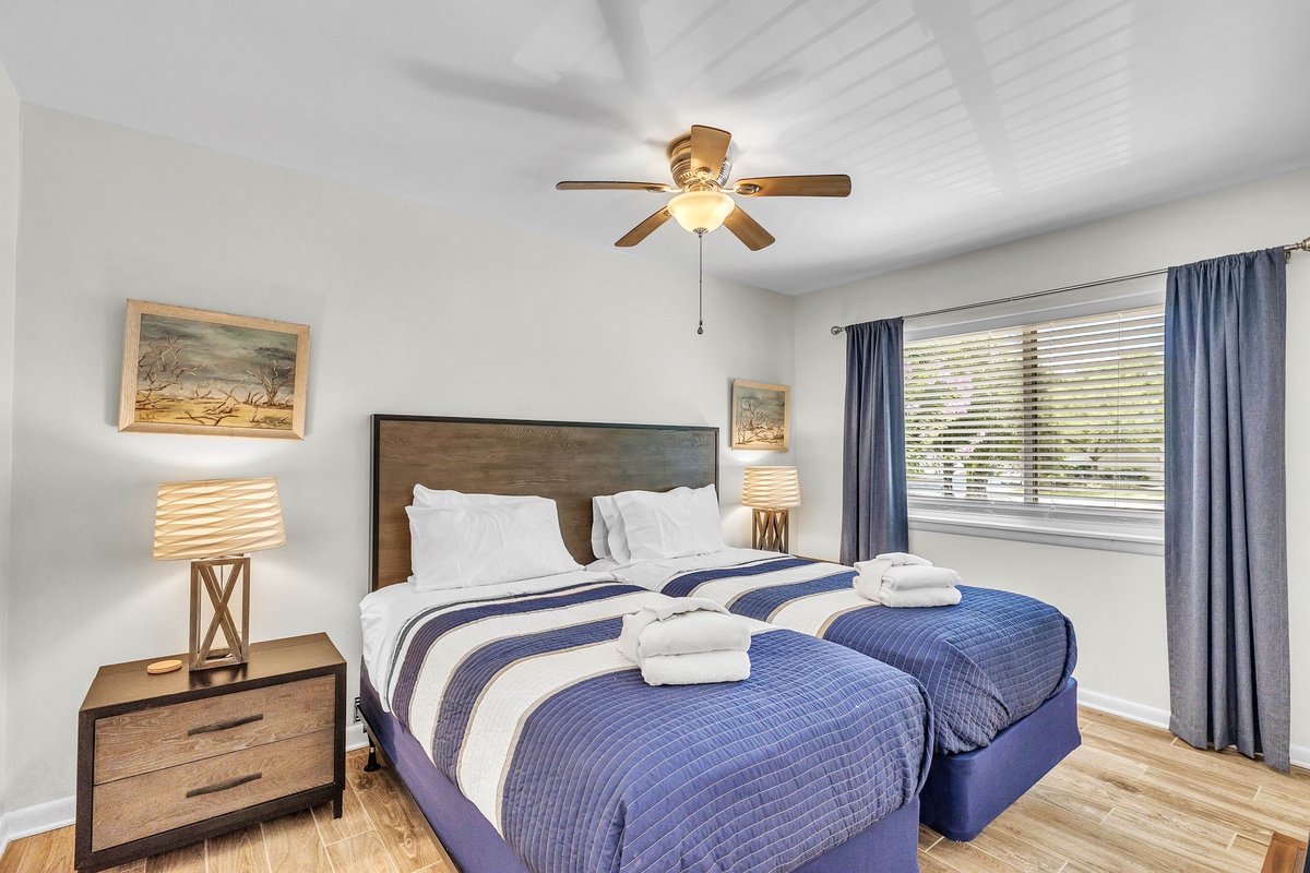 When it’s time to unwind, retreat to the bedrooms designed with both style and serenity in mind. The master suite features a private balcony and updated primary bathroom, while its king-sized bed and spa-like atmosphere ensure complete relaxation. A second bedroom features twin beds dressed in navy-and-white quilts, perfect for children or friends, while soft lighting and driftwood-inspired accents carry the beachy theme throughout. Upon request, this room can be made to be a second king bed. The villa also features a dedicated loft workspace, with a modern standing desk and stained-glass window backdrop, giving remote workdays a touch of inspiration.