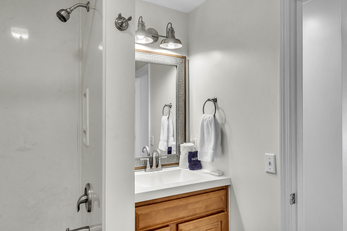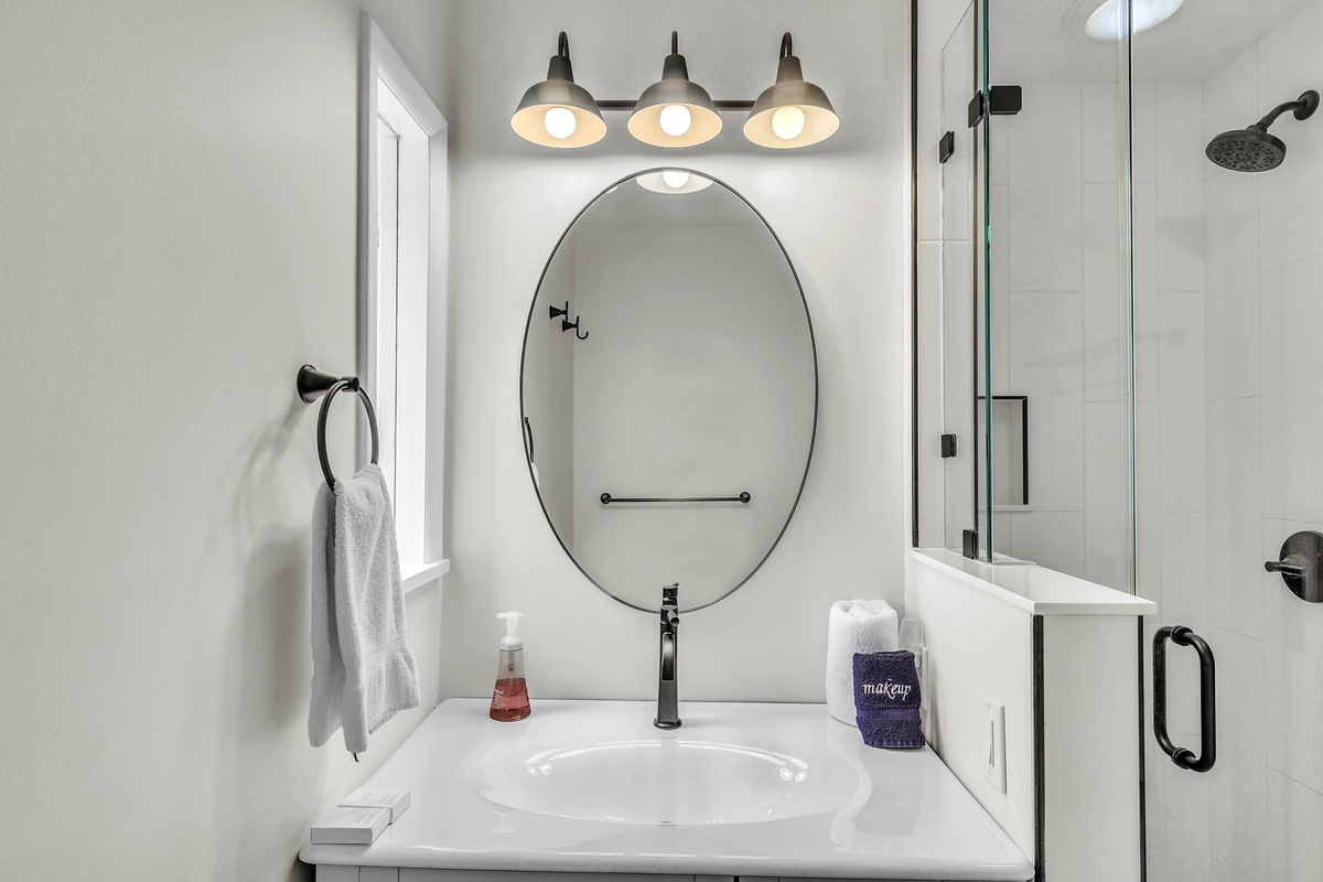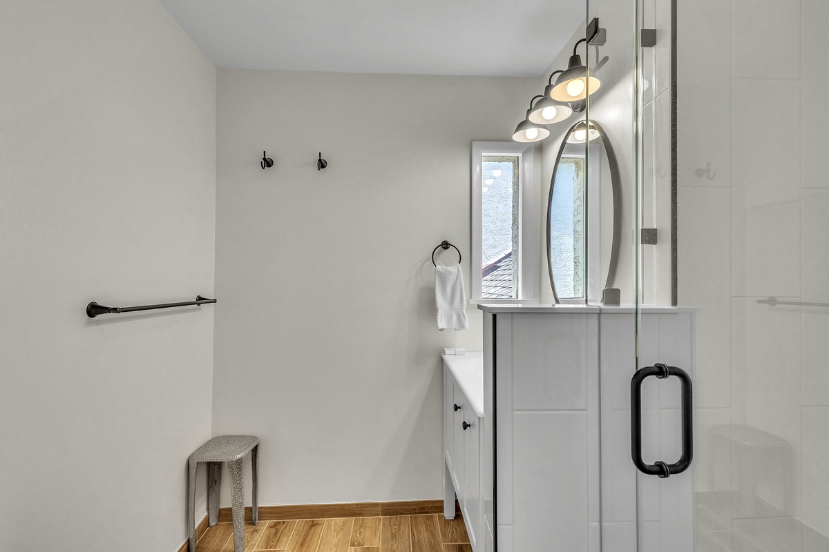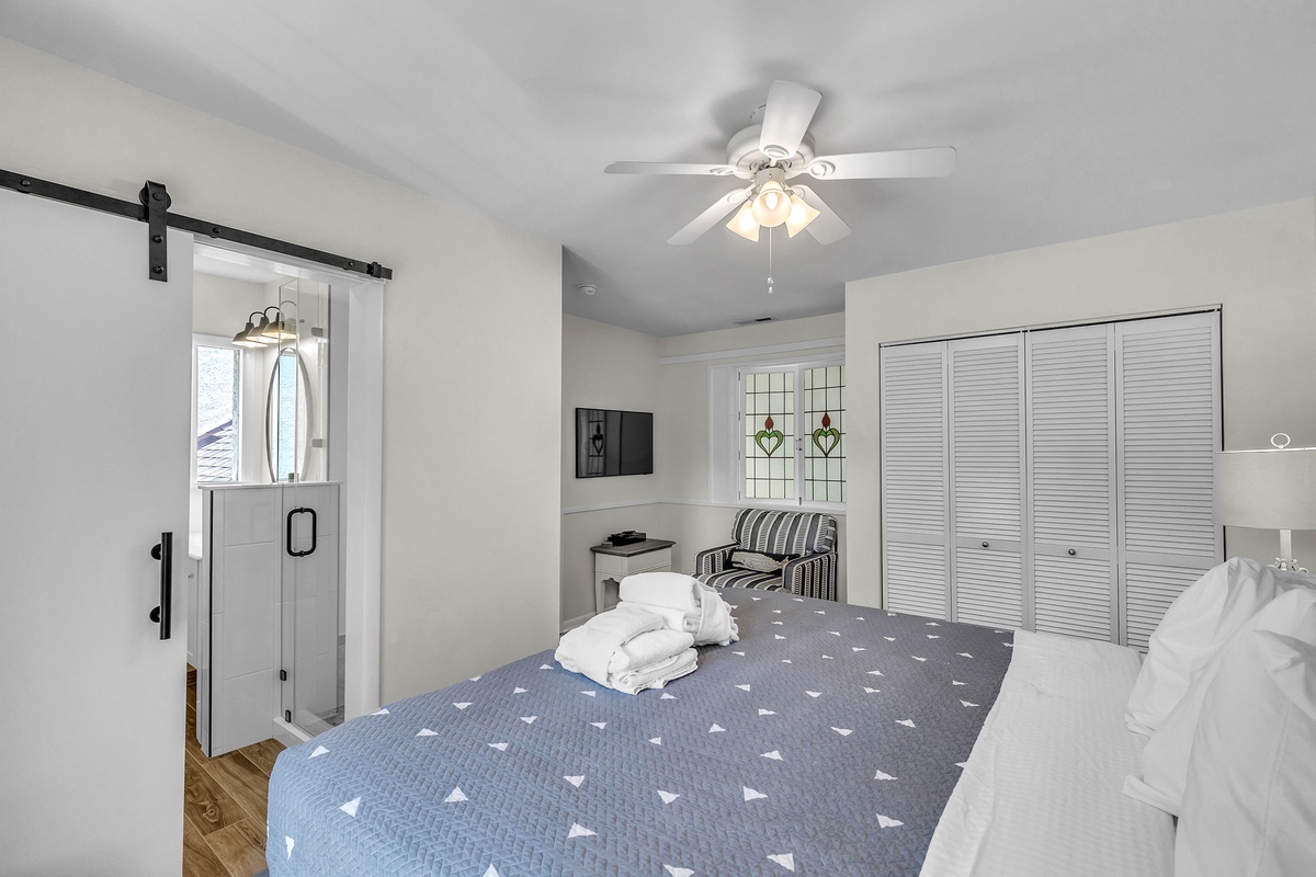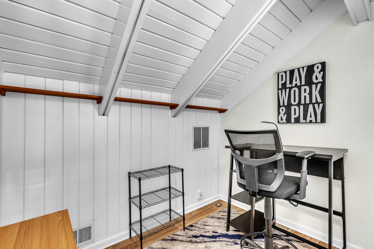 When it’s time to unwind, retreat to the bedrooms designed with both style and serenity in mind. The master suite features a private balcony and updated primary bathroom, while its king-sized bed and spa-like atmosphere ensure complete relaxation. A second bedroom features twin beds dressed in navy-and-white quilts, perfect for children or friends, while soft lighting and driftwood-inspired accents carry the beachy theme throughout. Upon request, this room can be made to be a second king bed. The villa also features a dedicated loft workspace, with a modern standing desk and stained-glass window backdrop, giving remote workdays a touch of inspiration.