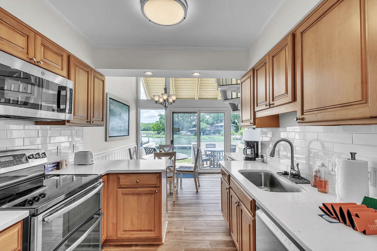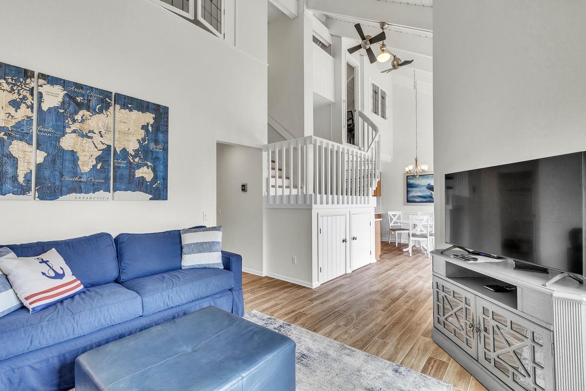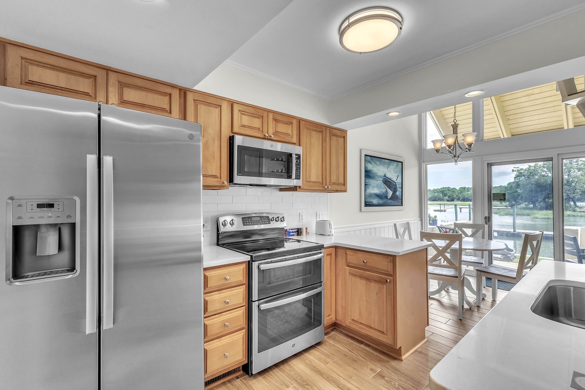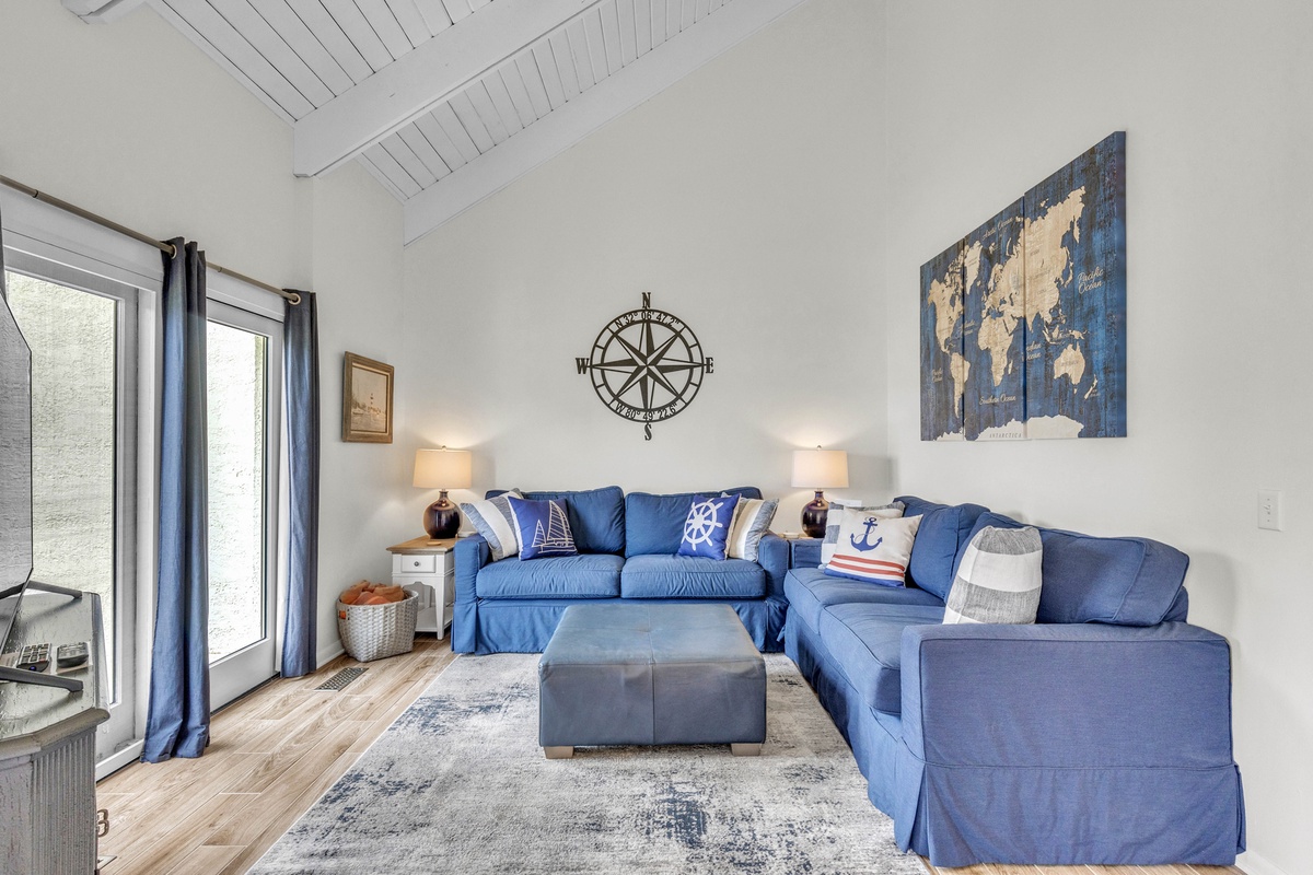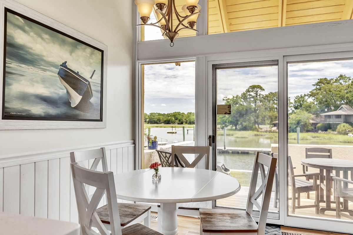 Step inside and feel instantly at home in a space that blends coastal charm with modern comfort. The remodeled kitchen gleams with stainless steel appliances, quartz countertops, and warm wood cabinetry - a chef’s dream for cooking fresh island meals. The dining nook, framed by oversized windows, bathes in natural light and overlooks the cove, while the open-concept living room welcomes you with vaulted ceilings, two full-size comfortable sofas, and nautical décor that nods to Hilton Head’s maritime spirit. Plush pillows, a compass wall feature, and a rustic world map art piece make this room both inviting and Instagram-worthy.