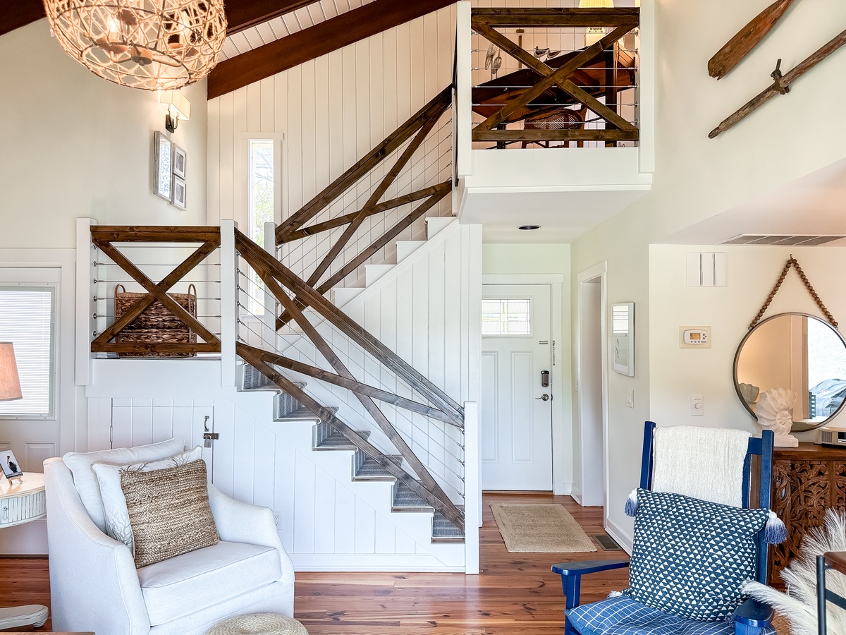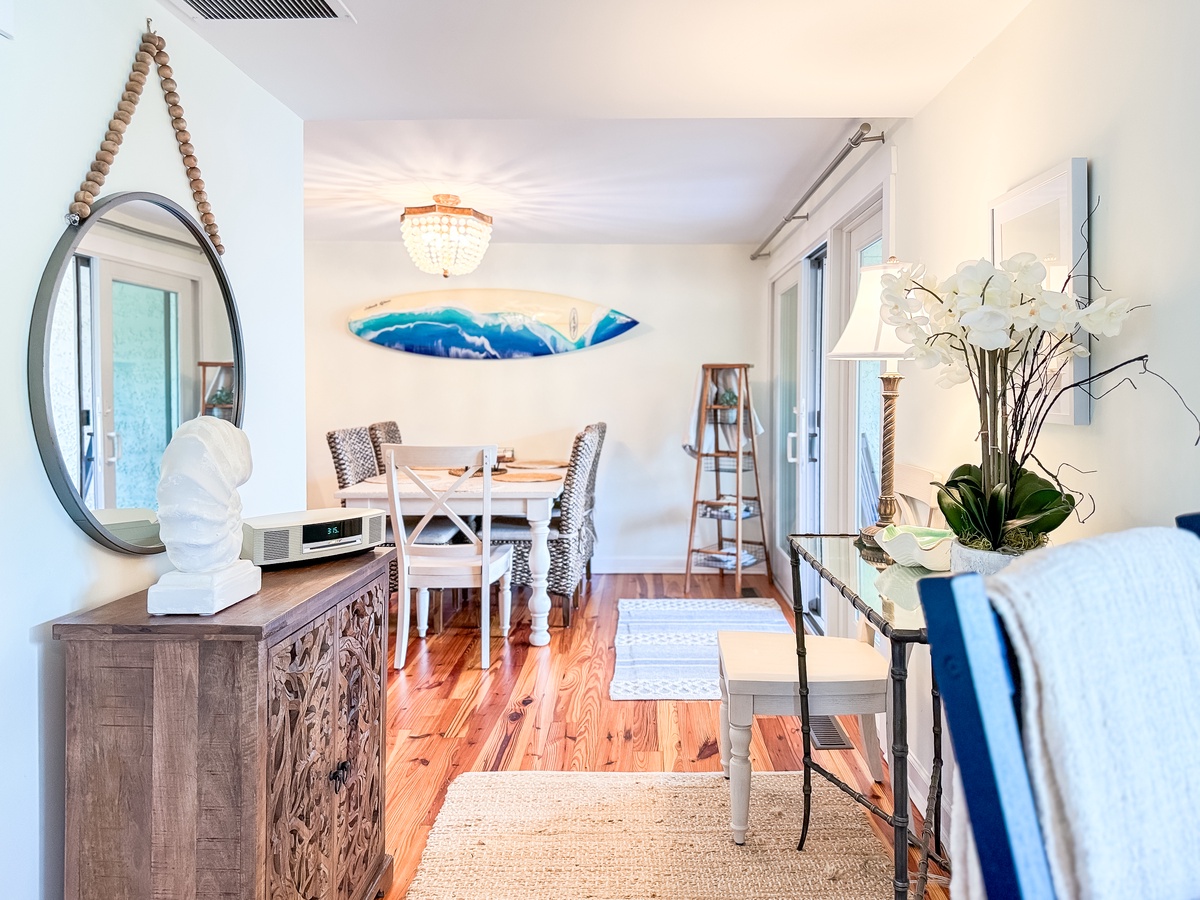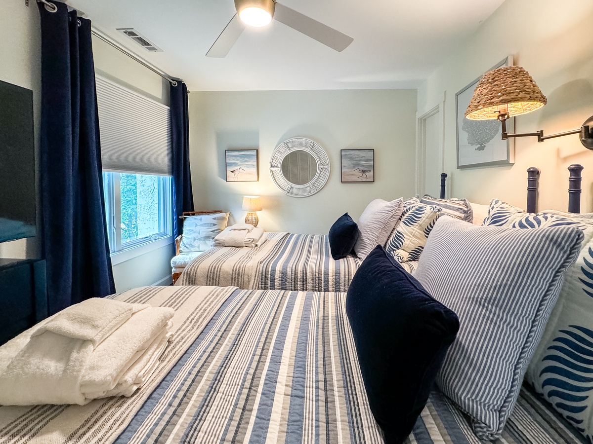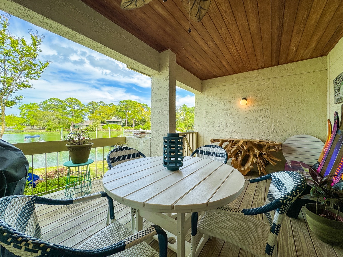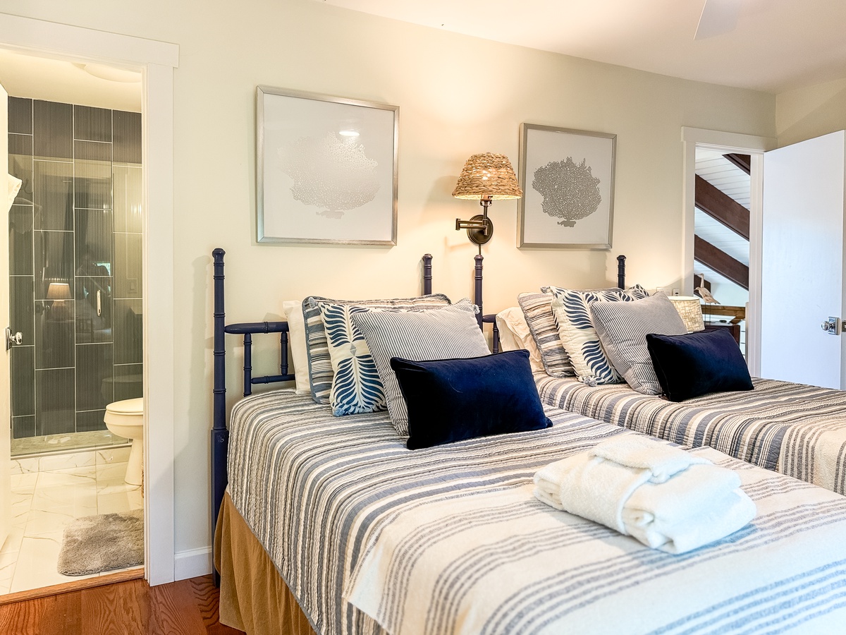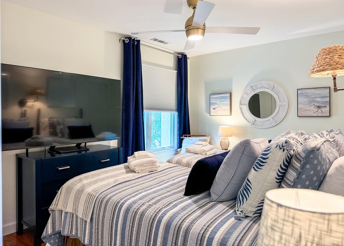 With two bedrooms, a king-size bed in the primary and a second bedroom offering the flexibility of a king or 2-twin bed configuration, ensuite renovated bathrooms in both, and a half bath downstairs, there's plenty of space to relax and unwind after a day of pedaling and paddling around Sea Pines. You’ll find that every detail has been carefully curated to ensure your utmost comfort, from the high-end appliances, well-appointed kitchen, and comfortable furnishings to the fashionable coastal decor.
