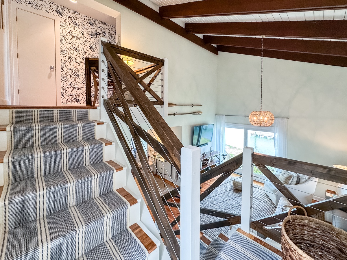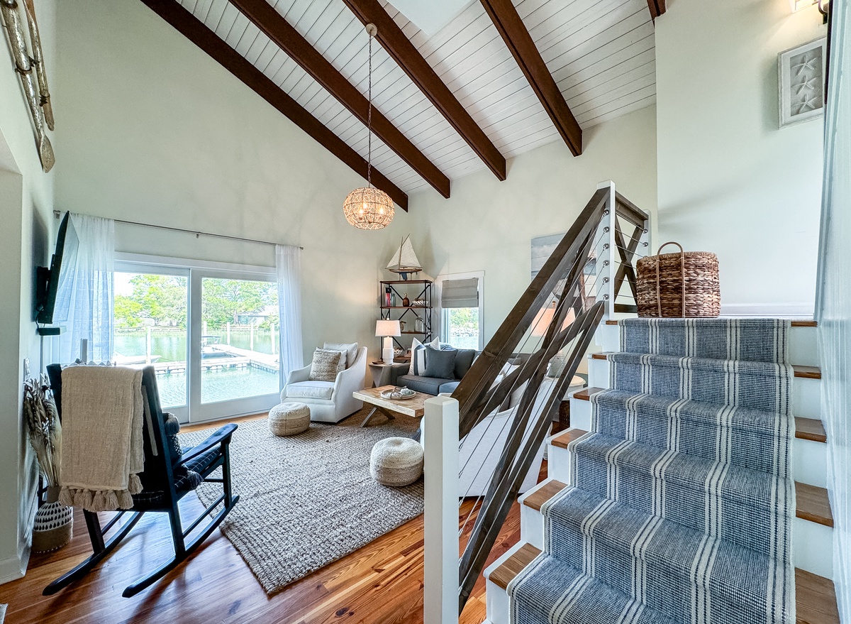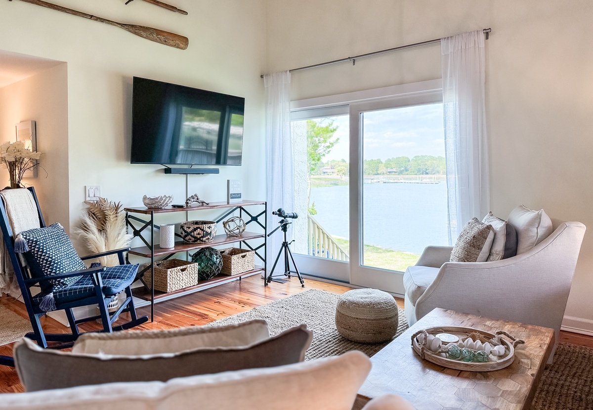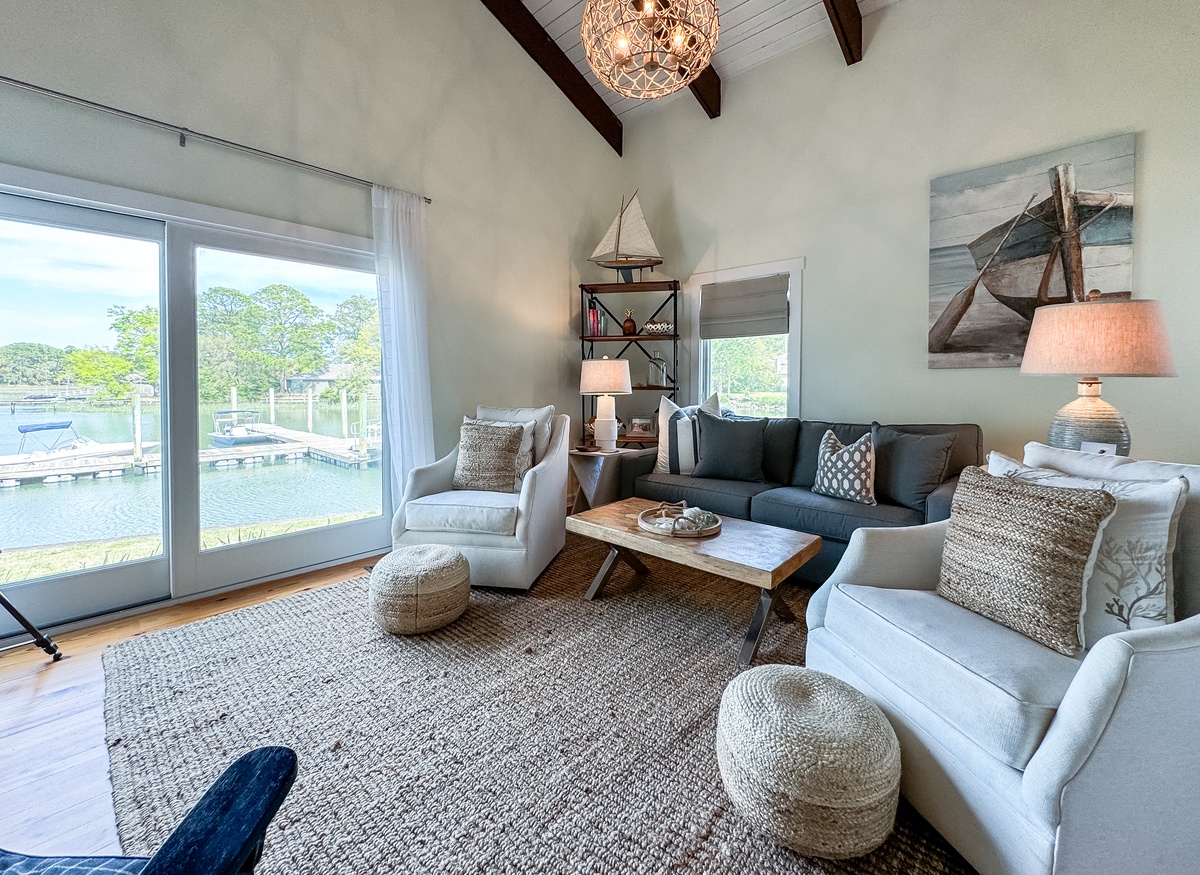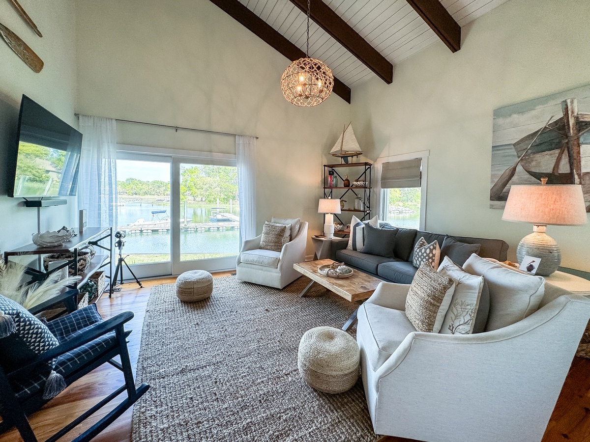 Two spacious covered decks offer sweeping views of Braddock Cove, making dining al fresco or coffee on the perfectly oriented sunrise porch even more inviting. The spacious living room welcomes an abundance of light with its soaring two-story ceiling and sliding glass doors that frame the panoramic vista of Braddock Cove. You’ll never tire of watching the sky ablaze with hues of orange and pink—this is coastal living at its finest.