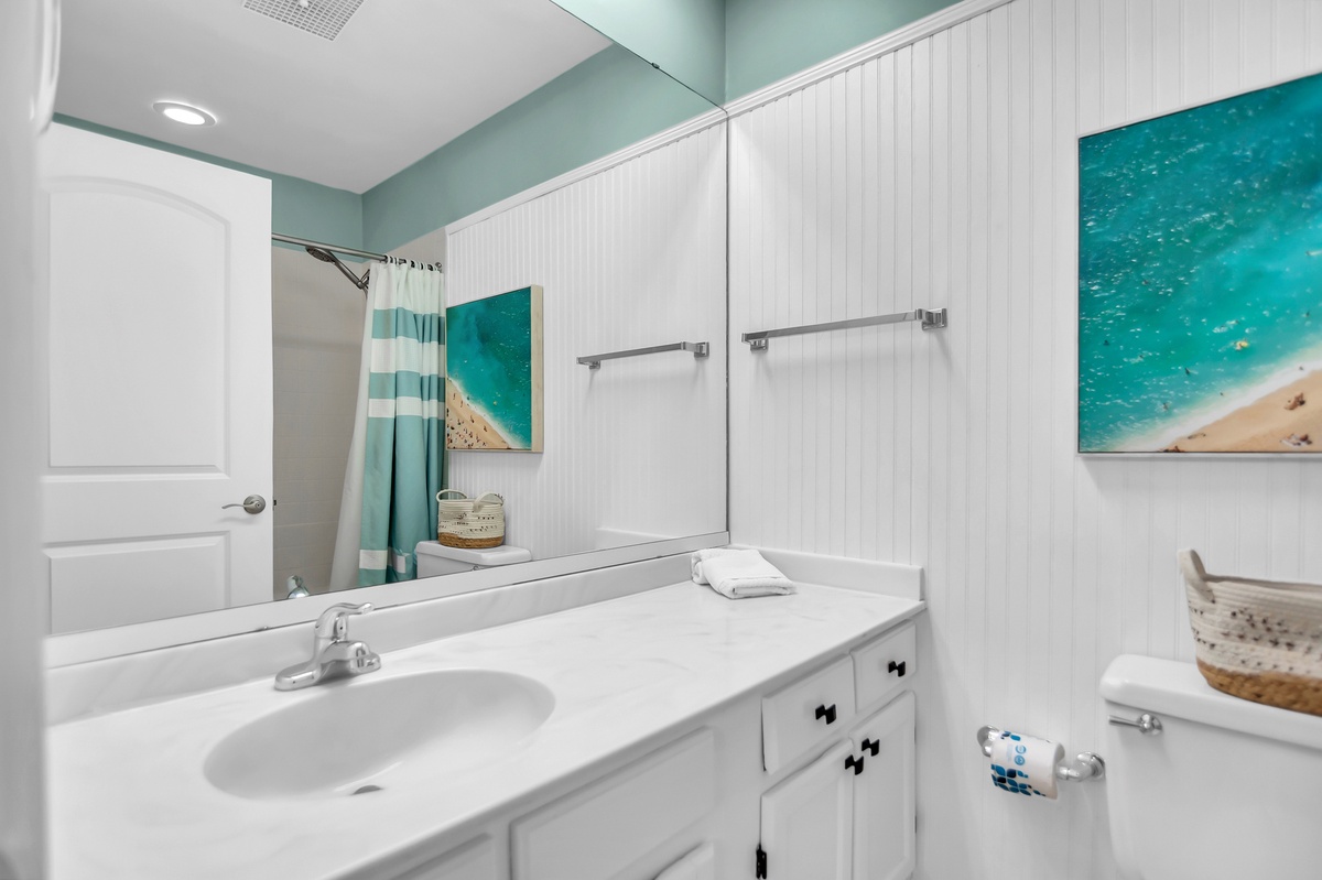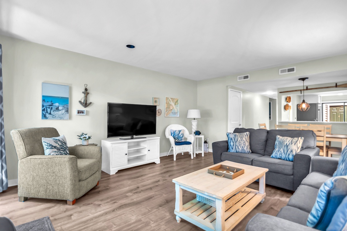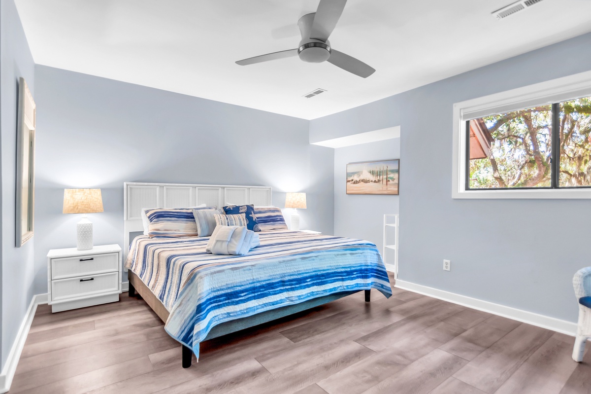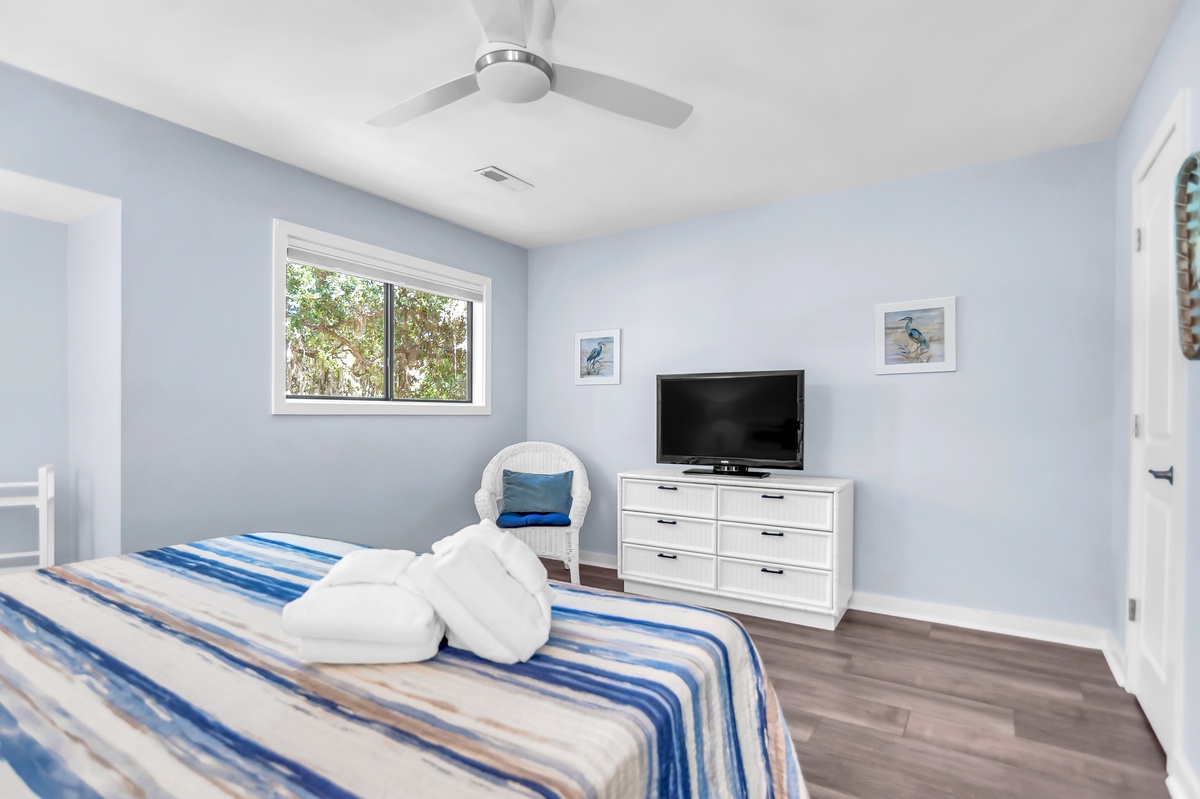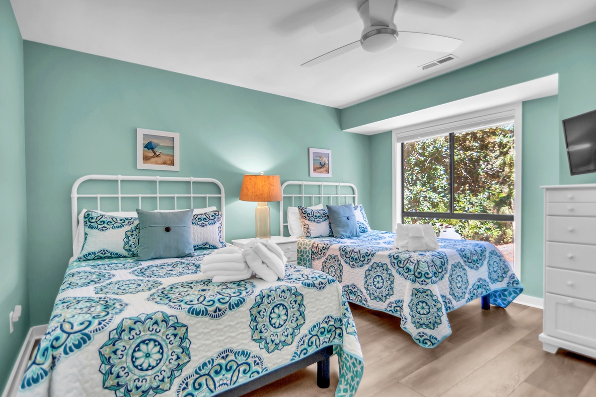 Step inside and be greeted by a spacious living area filled with natural light pouring through large windows and sliding glass doors. The bright and airy design showcases tranquil golf course views, creating the perfect backdrop for your stay. Comfortable seating, coastal-inspired décor, and a fully equipped kitchen allow you to relax, entertain, and prepare meals with ease. The living room flows seamlessly to your private deck, where you can unwind with a cup of coffee in the morning or enjoy the sunset over the greens in the evening. Upstairs, you’ll find two spacious bedrooms designed with comfort and style in mind. The primary suite features a king bed and calming blue hues, while the guest room offers two full beds with cheerful coastal patterns, making it perfect for families or friends. With an additional queen sleeper sofa in the living room, the villa comfortably sleeps six guests.