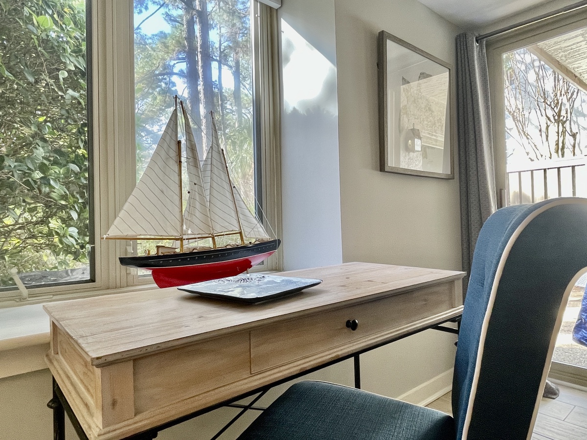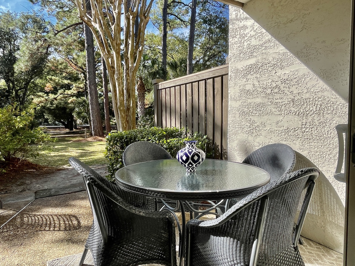 "Perfectly located, well-appointed and the best terrace in Bluff Villas! My 25-year-old son and I met in HH for a much-needed break and were lucky enough to stay at 1651. The villa was fantastic -- great wifi and perfect spaces for doing a bit of work when necessary. The walk-out terrace and luxurious greenery provided privacy, great views and the perfect spot for evening cocktails. Can't say enough about the benefits of being on the first floor for convenience and extra room on terrace. It's a 2-min walk to our favorite bar at the Salty Dog, tennis and bikes were a stone’s throw away. The villa was beautifully furnished and stocked for our every need. It's a 5-min bike or drive to the beach where we kite surfed and paddle boarded. Sunrise bike rides are definitely encouraged. This place is perfect for a couple or a much-needed getaway with a friend or older child. There is no better location in Sea Pines for convenience and 1651 Bluff Villa with the walk-out terrace will be our new favorite!"