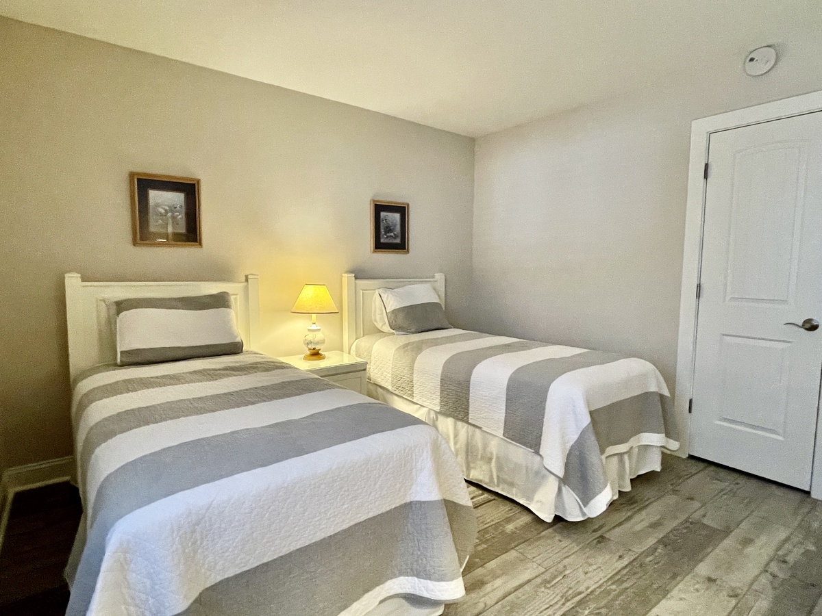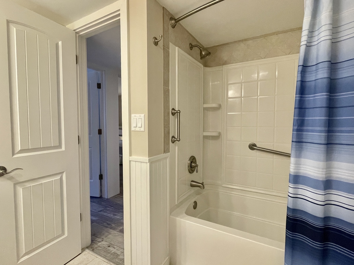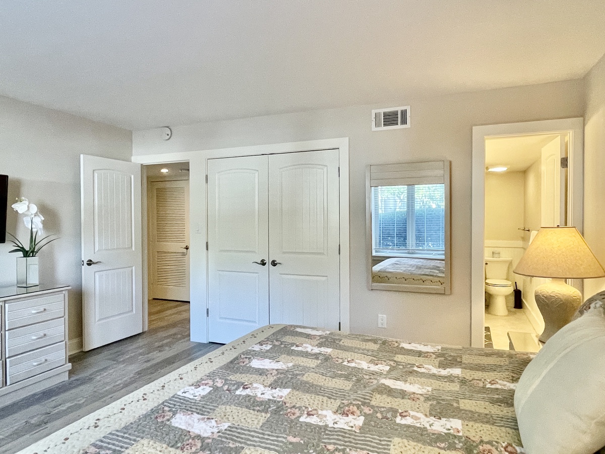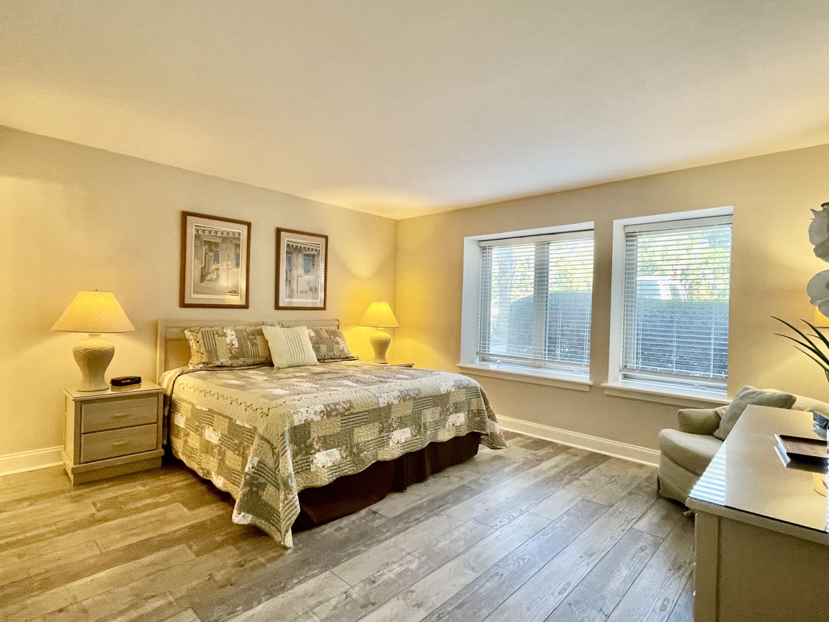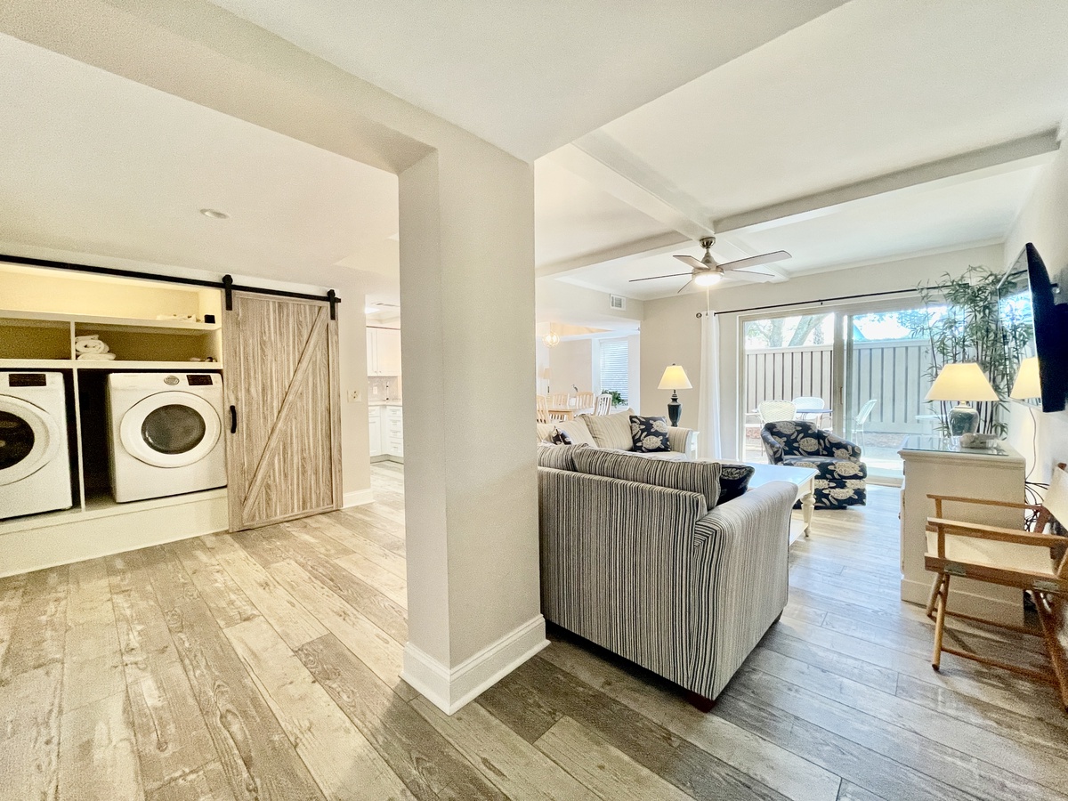 1652 Bluff Villas is a first-floor end unit villa with a lovely open floorplan that includes a spacious living room with plenty of seating around a large coffee table, perfect for a family game or movie night. The new sofa has a queen-size sleeper. The full-equipped kitchen opens into the living space, with a large island counter and breakfast bar. The whole villa has new vinyl plank flooring and there is a brand new washer and dryer for your convenience. The primary bedroom features a king sized bed with an updated en suite. The guest bedroom features a set of twin beds and great closet space and is across from the updated hall bathroom.