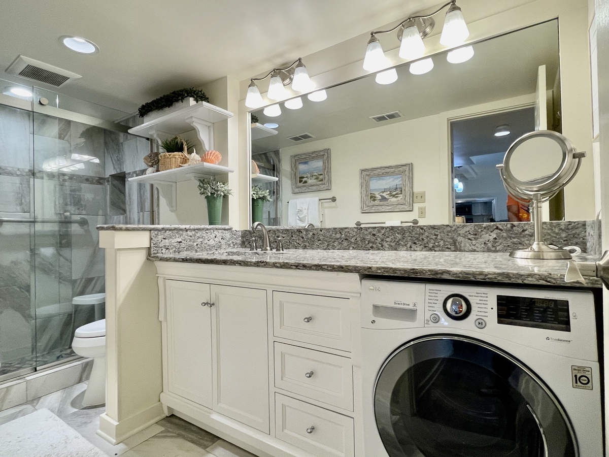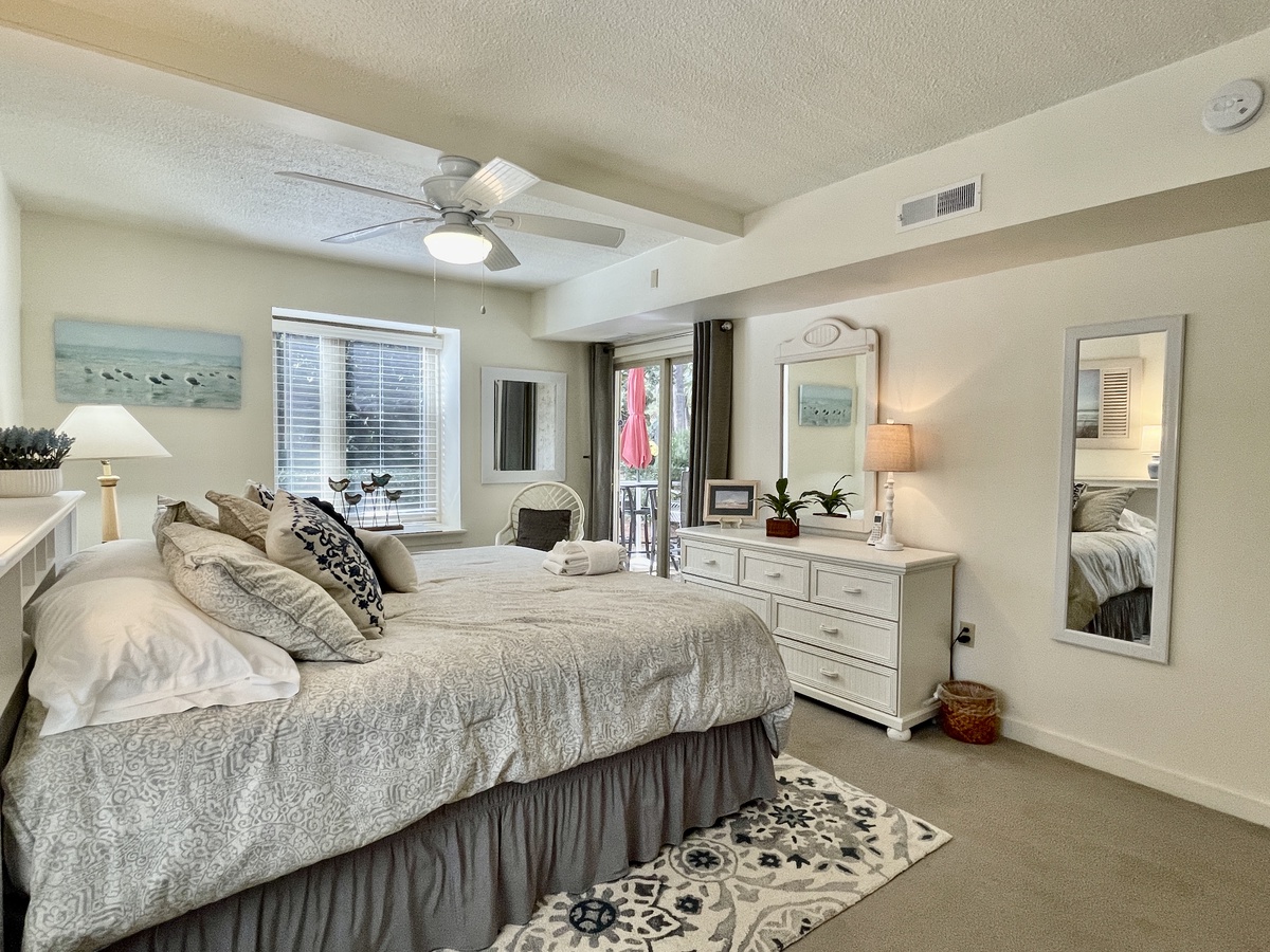 The bedroom with king bed has plenty of storage space and has its own access to the back patio. The bathroom features a beautiful walk-in shower and has plenty of counter space. A conveniently located washer/dryer combo unit is also found here.