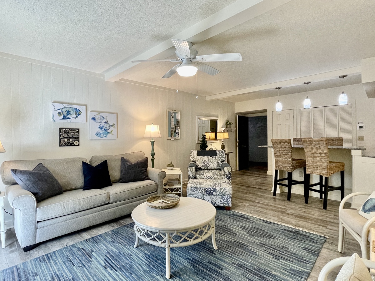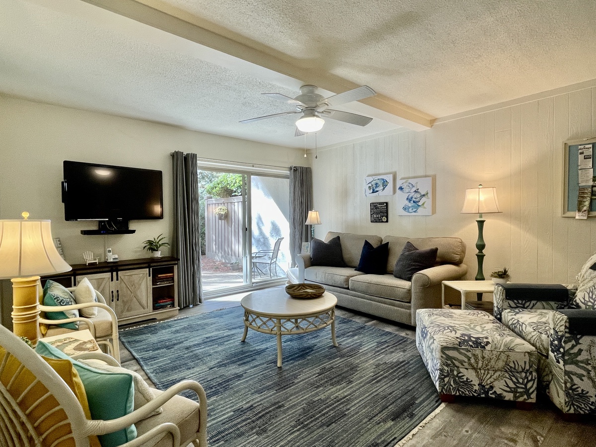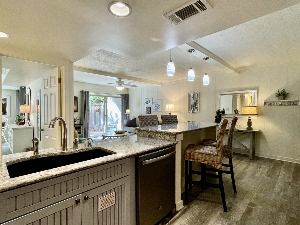 Only steps away from the amenities and excitement of South Beach Marina Village, this recently renovated first-floor villa is your perfect Hilton Head Island getaway. The gorgeous updated kitchen with granite countertops is full equipped for your convenience and features a breakfast bar that can seat 4 and opens up to the spacious living room. The living room has a large walk out patio with its own private view. This is a wonderful space for family movie or game nights, or for simply curling up with a good book on the comfy couch.