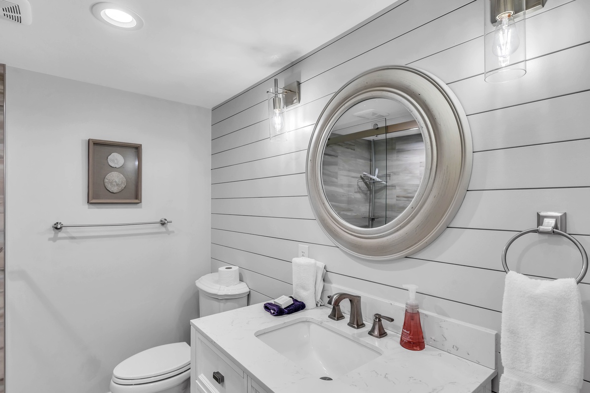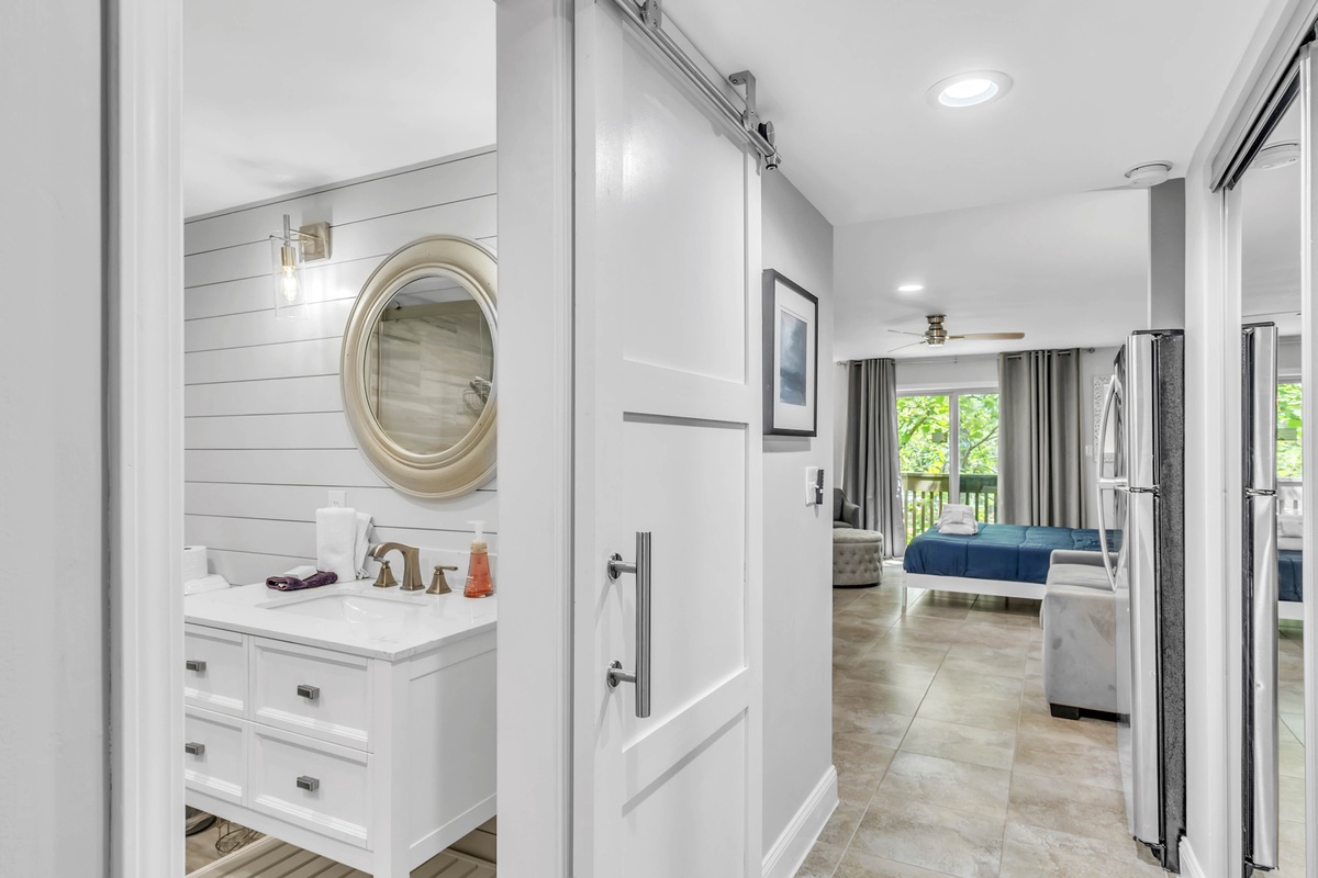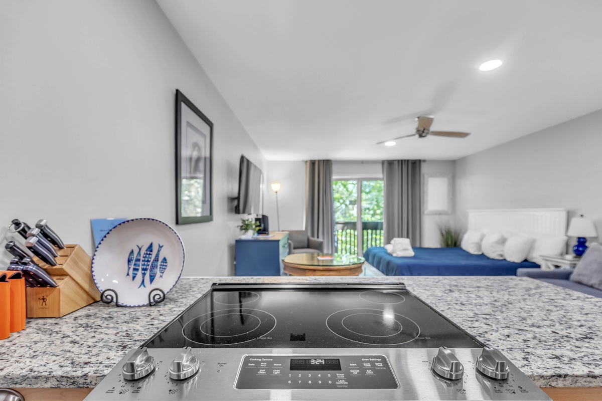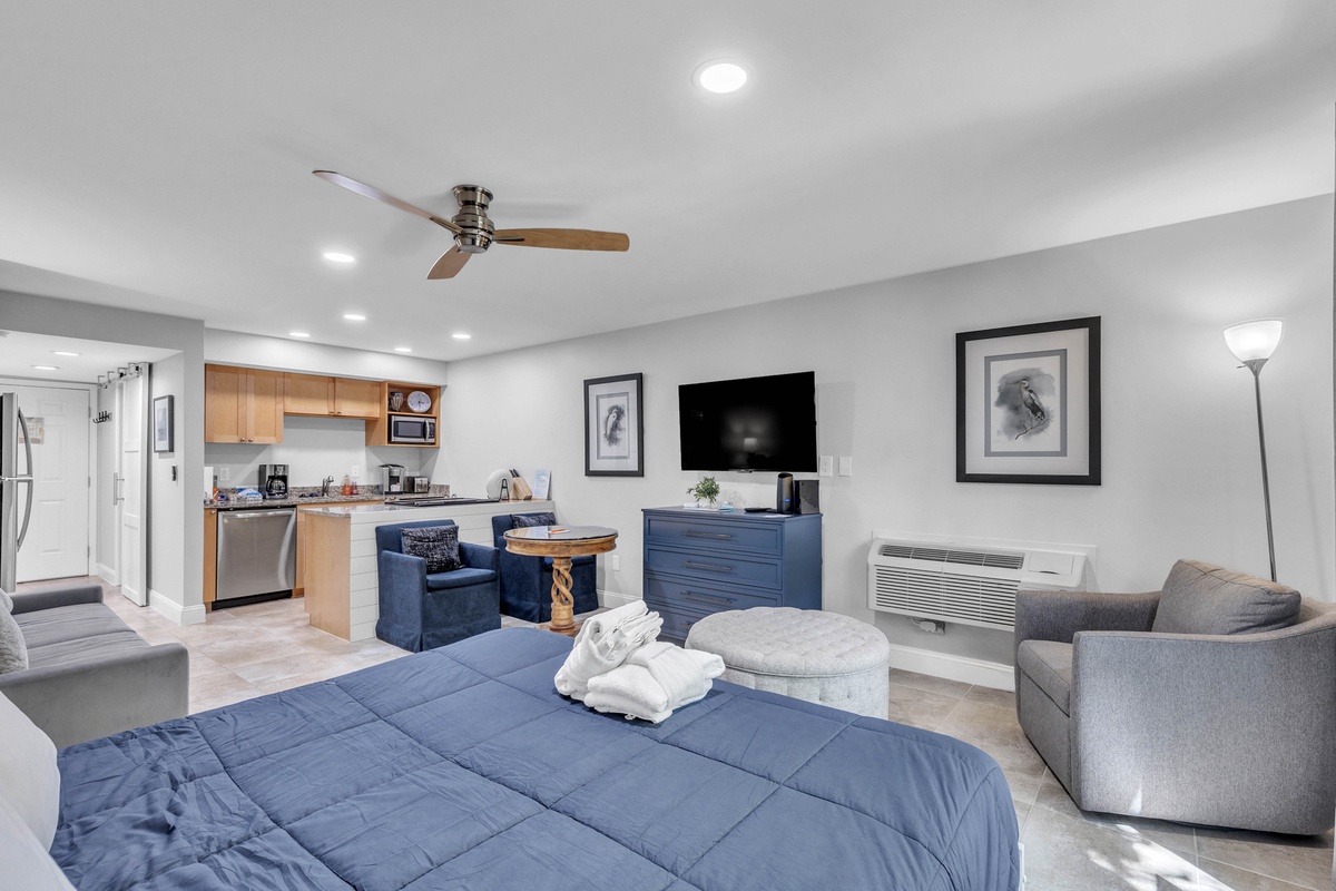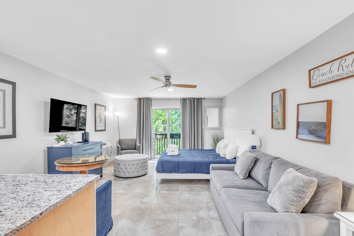 Upon entering, you'll be impressed by the beautiful furniture and modern updates throughout. On your left, you'll find a tiled walk-in shower and plenty of storage space in the bathroom. Meanwhile, the closet to your right provides additional storage for your clothes and luggage. The kitchen is equipped with granite countertops, a full-sized oven, stove top, fridge and freezer, Keurig, microwave, and washer. A dining area for two is located adjacent to the kitchen. The living area is spacious, with a comfortable couch, smart TV, and a king-sized bed!