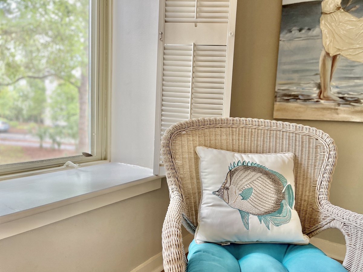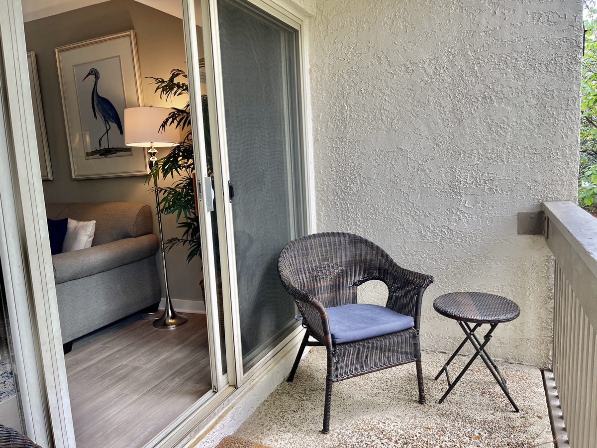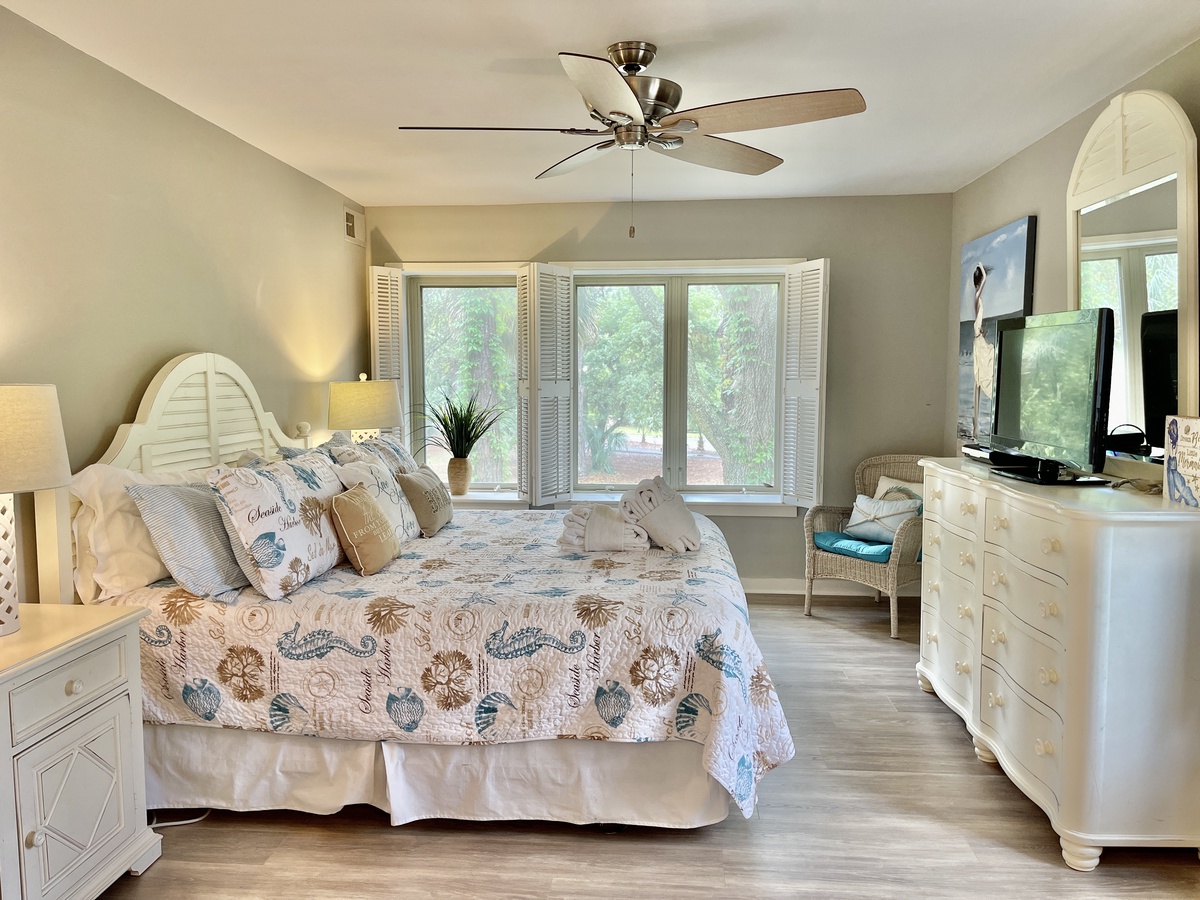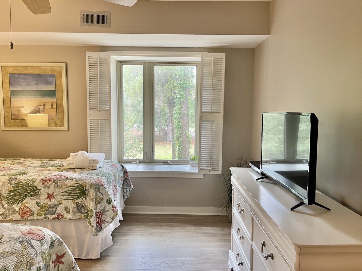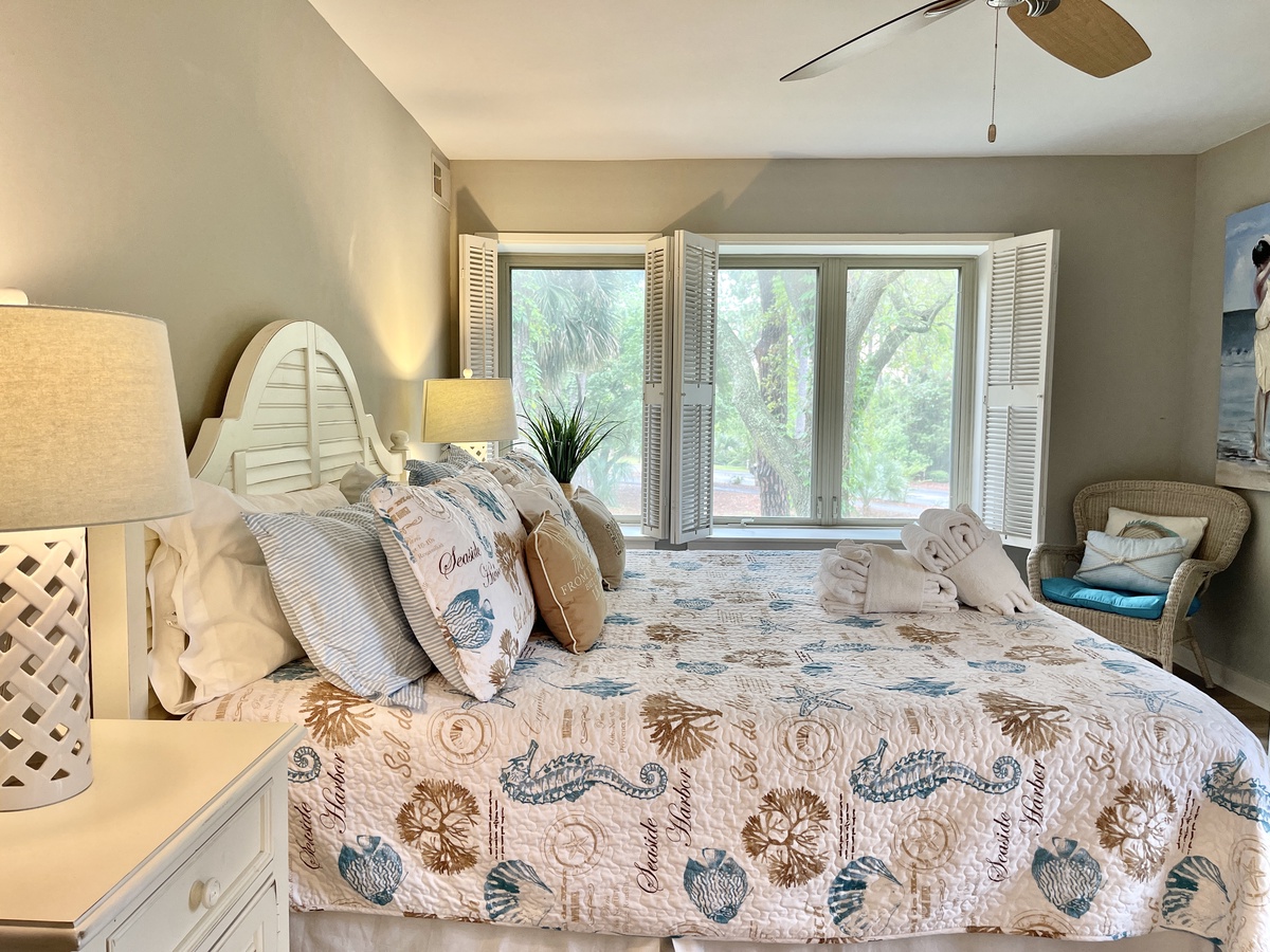 This lovely second floor villa sleeps six, offers peaceful landscape views, and is only a 5-minute walk to the beach. The beautifully updated kitchen features stainless steel appliances and plenty of counter space ideal for preparing meals at home during your vacation. The open living area extending out to the balcony is bright and comfortable for a crowd! The primary suite features a king-sized bed and a spacious, updated bathroom. The second bedroom provides 2 twin beds and is just across from the gorgeous hall bathroom. This villa is situated between the Calibogue Sound, the inlet of Braddock Cove, and the always-entertaining South Beach Marina Village.