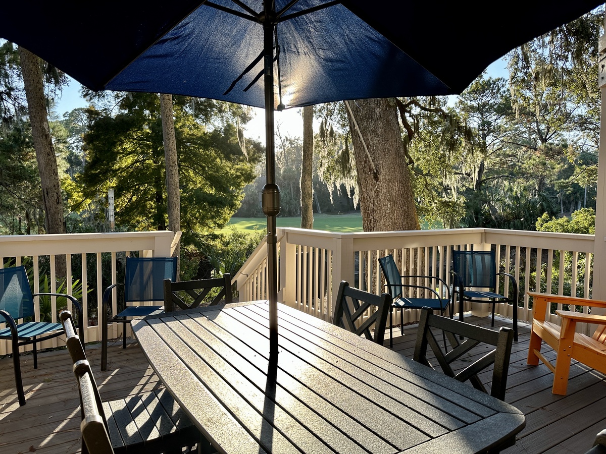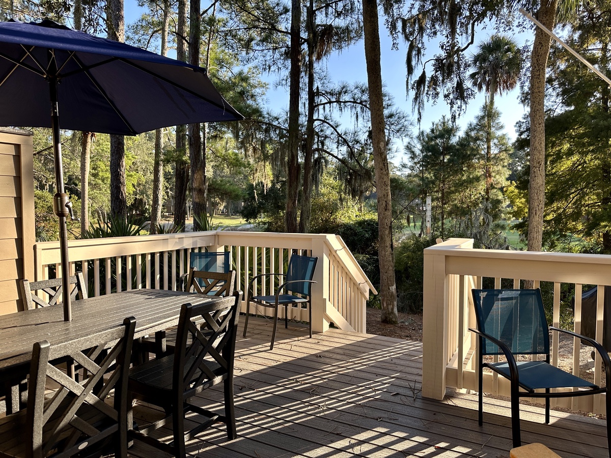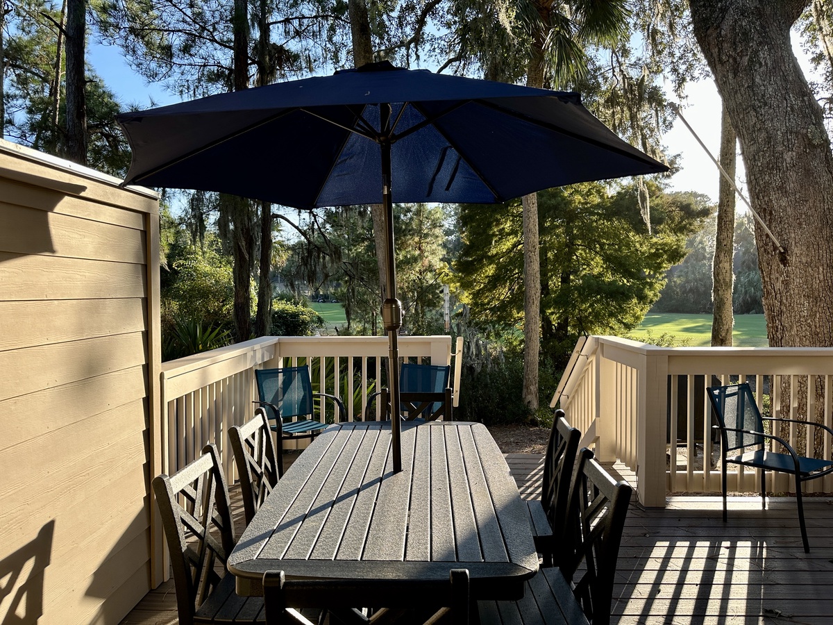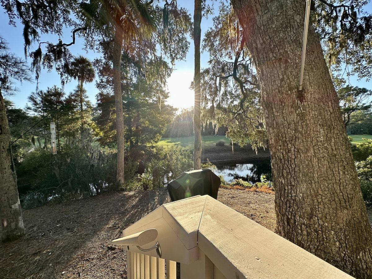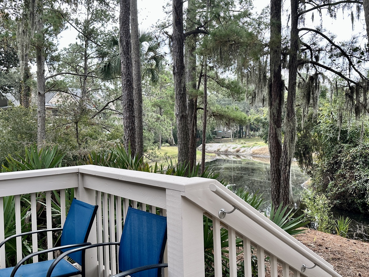 The sliders in the living room do more than frame the gorgeous lagoon and golf views. They offer access to a beautiful deck with dining area and space for relaxing with a good book while being soothed by calming breezes.