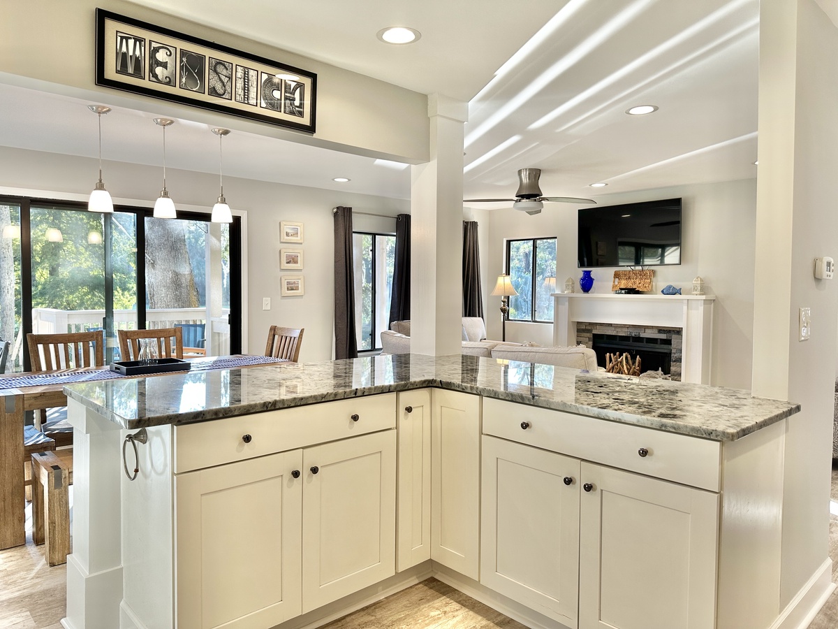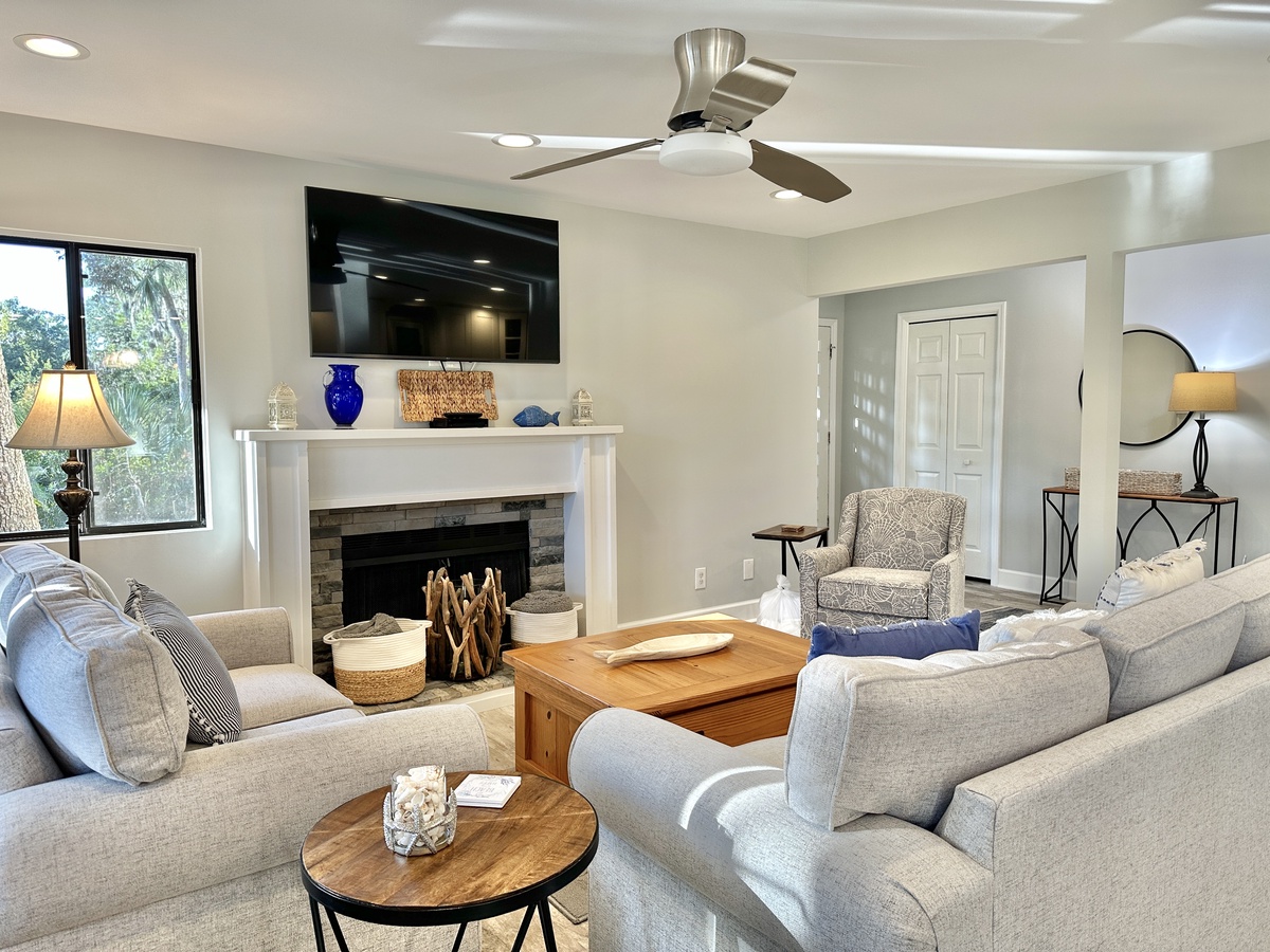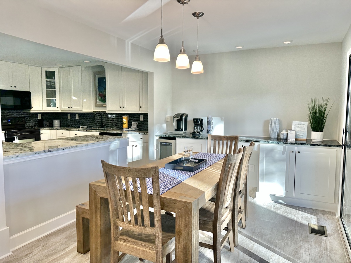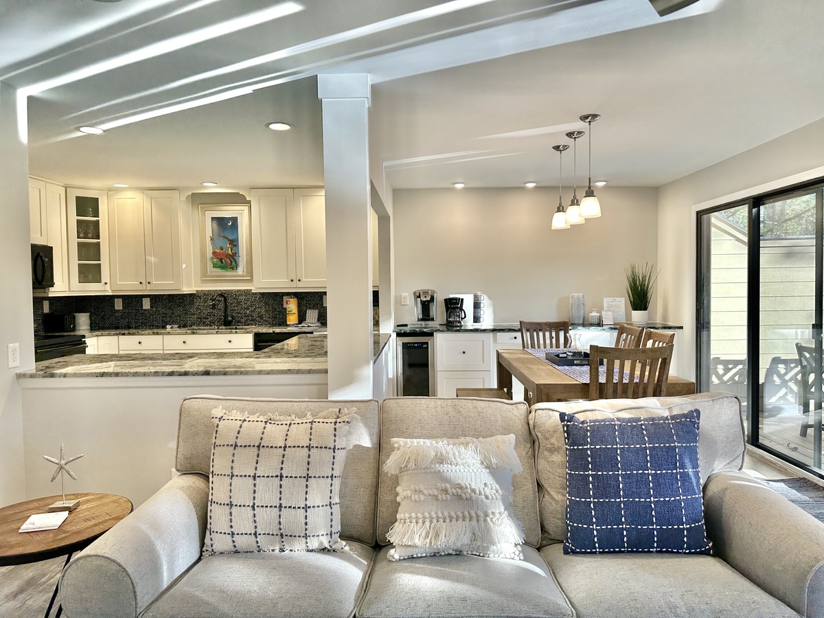Be among the first to experience this completely renovated villa where everything is new from floor to ceiling! The kitchen is fully-equipped for preparing a cup of coffee or a gourmet meal. There is seating for 6 in the dining area and the living room with fireplace is the perfect place for game or movie night. You’ll find plenty of games on hand, as well, should you need any rainy-day activities! There is also a washer and dryer for your added convenience.