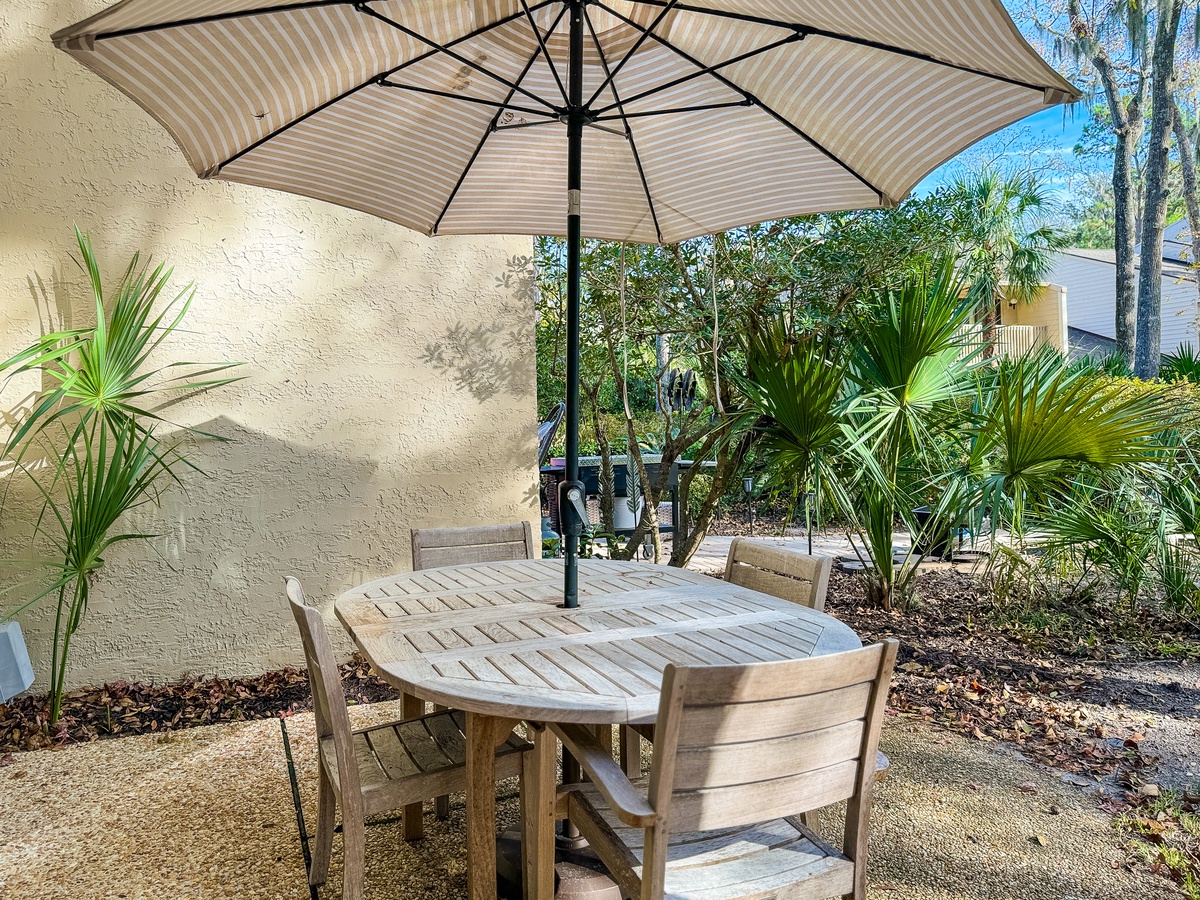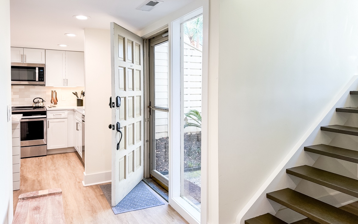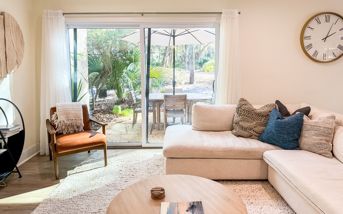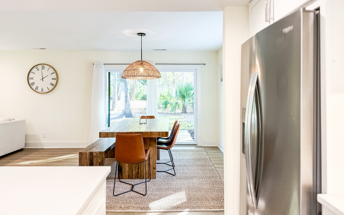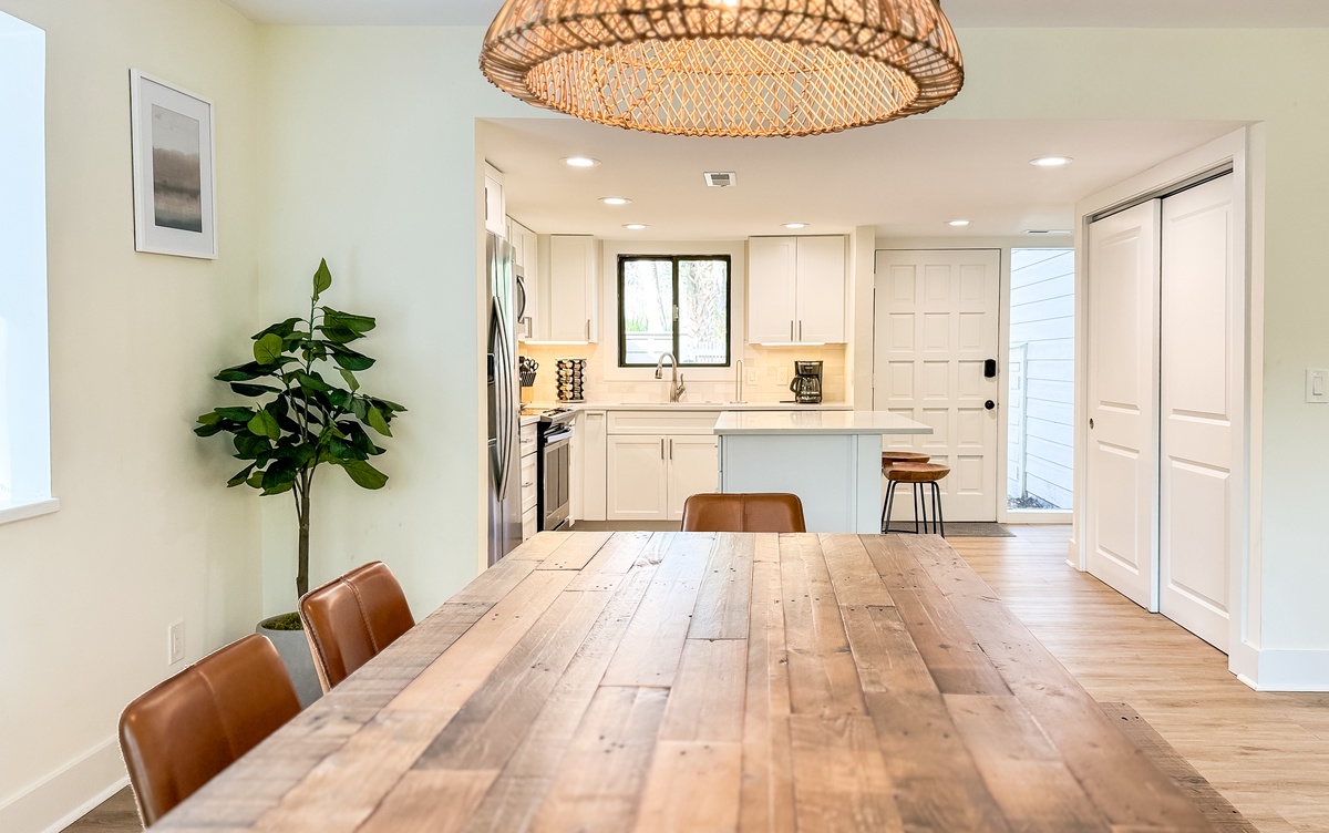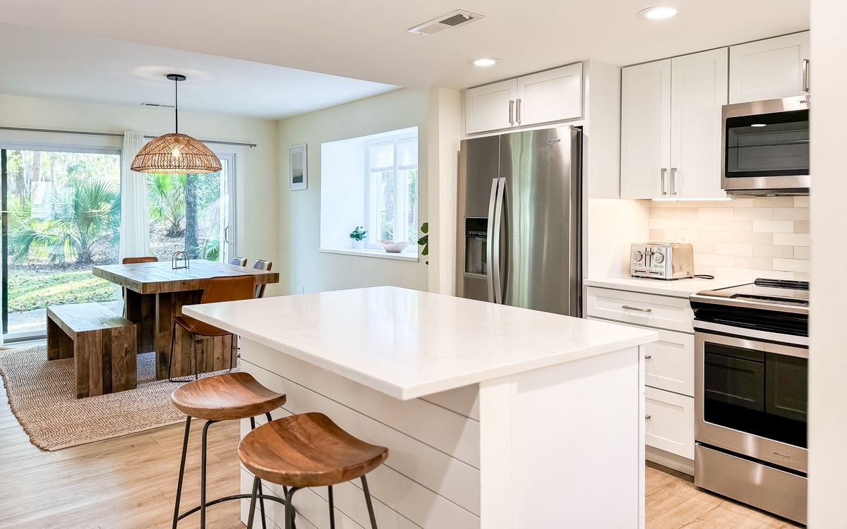 The villa has a spacious living and dining area with views of the lush island locale, which makes hosting game or movie night a breeze. The fully-equipped kitchen is ideal for brewing morning coffee, packing a picnic lunch for the beach, or preparing a delectable meal to enjoy indoors or outdoors. Additionally, there is a powder room and a laundry area on the main floor for your convenience.