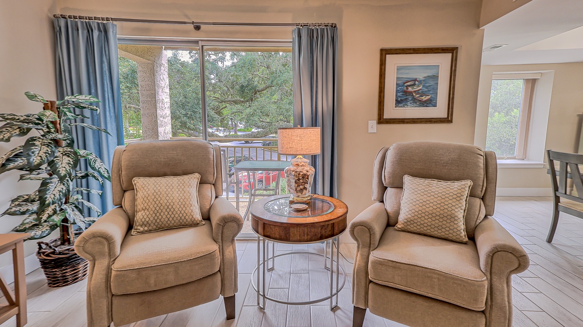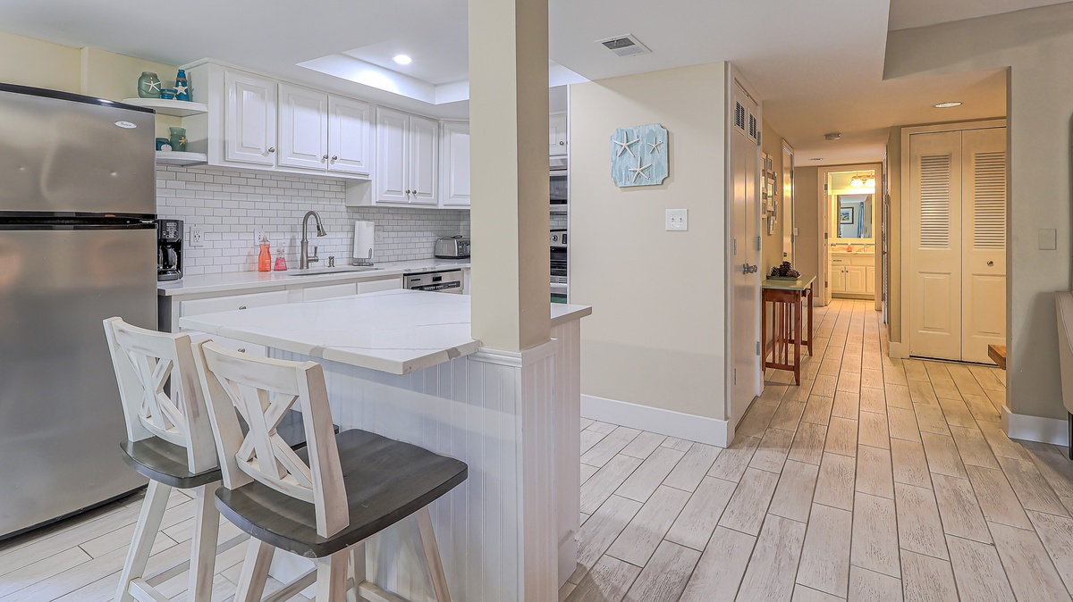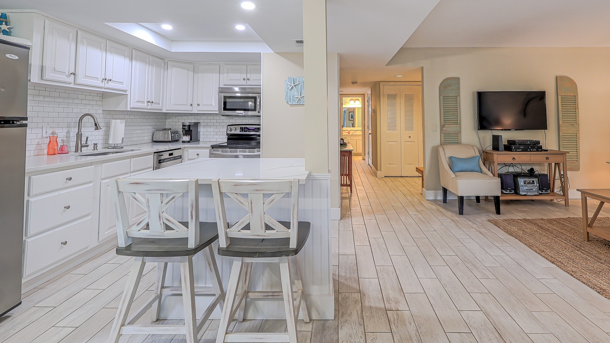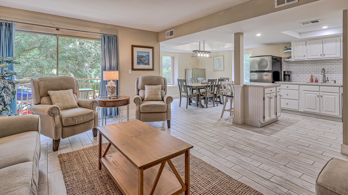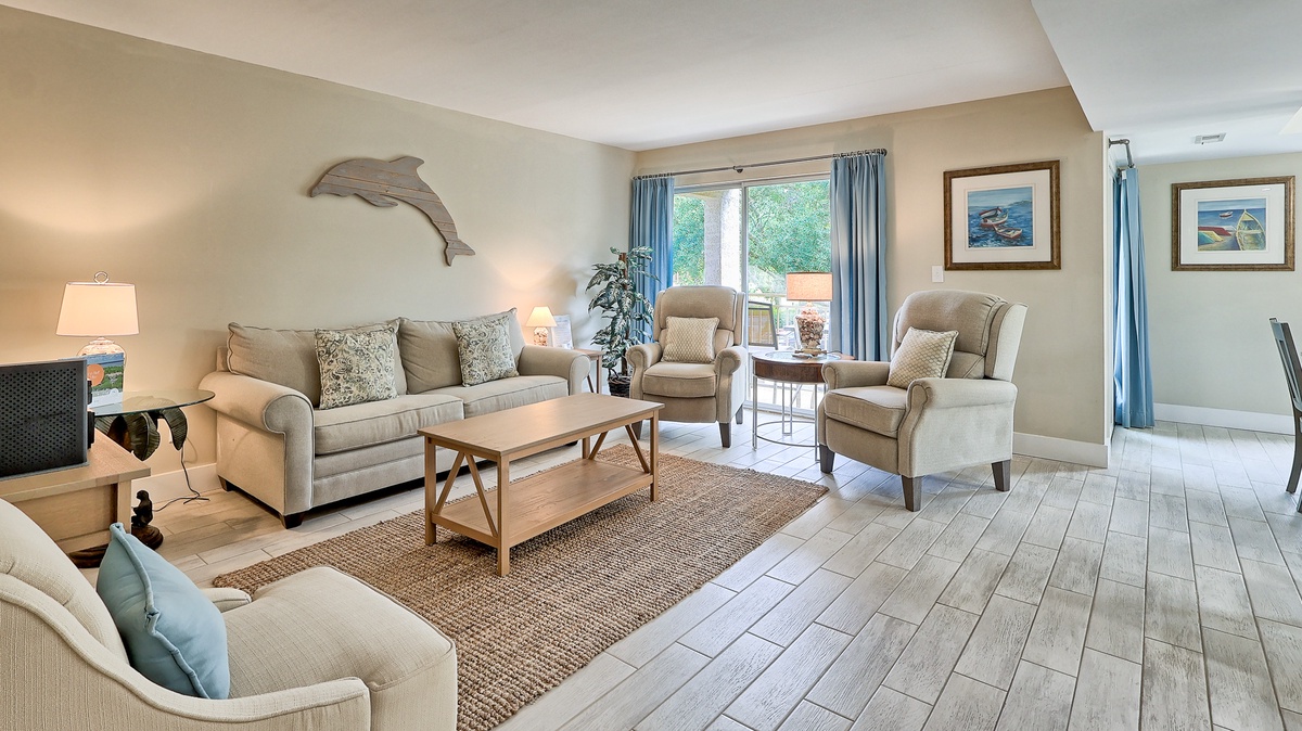 1736 Bluff Villa is a lovely updated two-bedroom two bath villa in South Beach. Situated between the Calibogue Sound and Braddock Cove, you are just steps from the beach!! This villa has beautiful wood plank tile throughout and a newly updated kitchen with everything you need to prepare snacks for the beach, morning coffee, or a delectable meal to enjoy at the dining table. The sliding doors in the living area let the light in and the open living space has comfy cozy furnishings just perfect for relaxing with a good book or hosting movie or game night! The entryway gives you a nice place to store beach gear out of site, and there's a full-sized washer and dryer for your convenience.