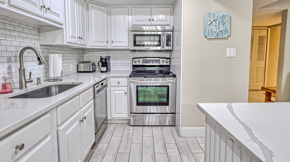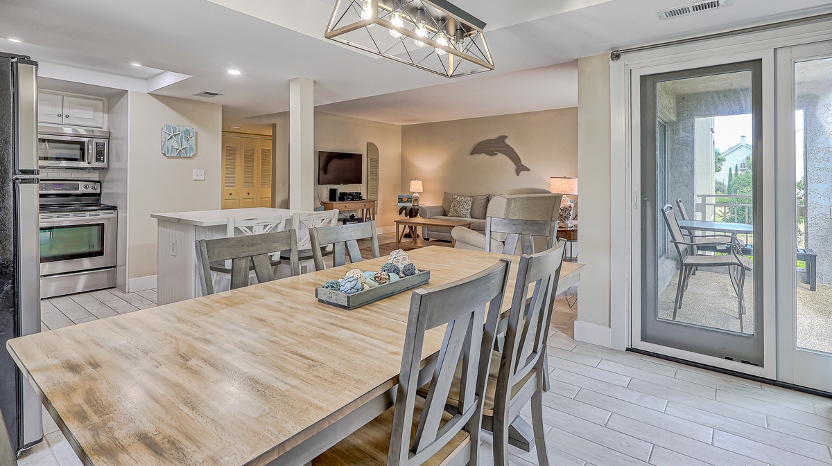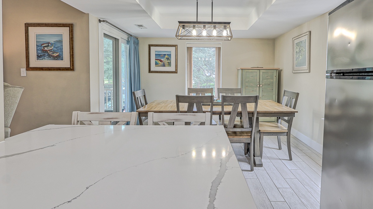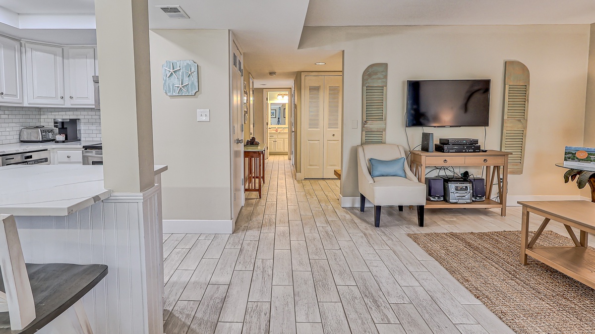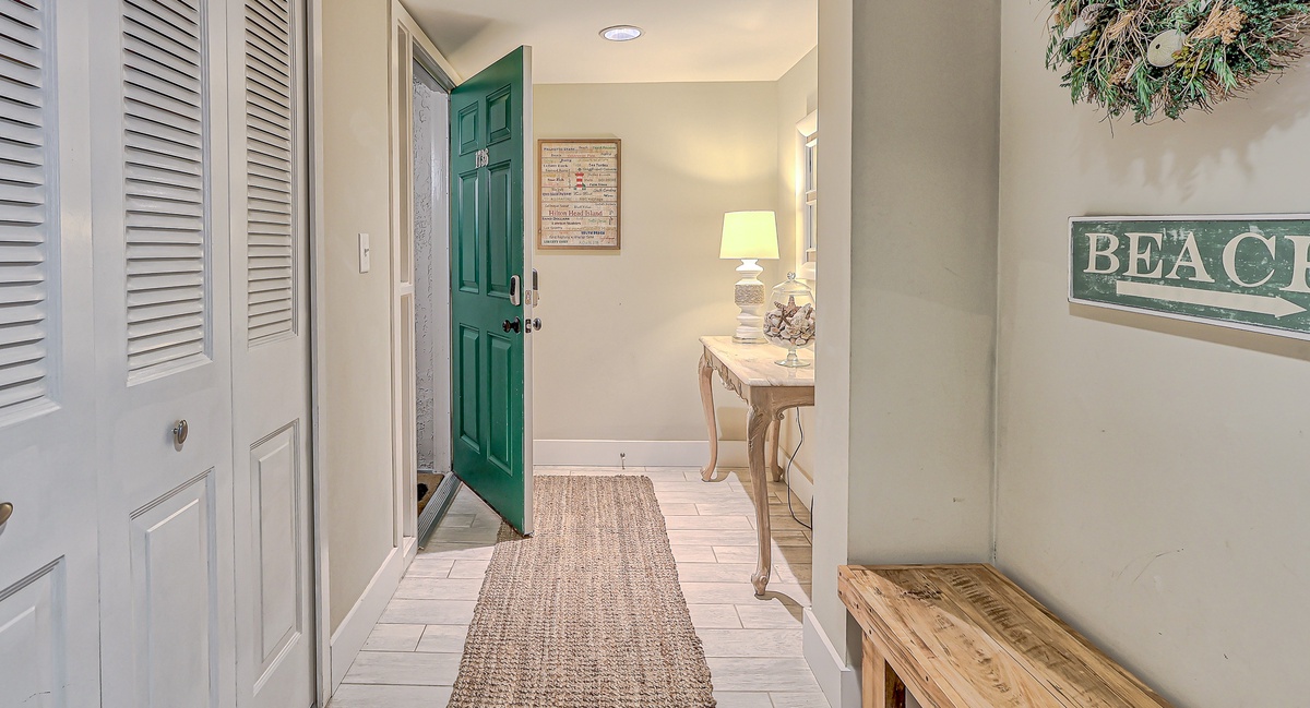 1736 Bluff Villa is a lovely updated two-bedroom two bath villa in South Beach. Situated between the Calibogue Sound and Braddock Cove, you are just steps from the beach!! This villa has beautiful wood plank tile throughout and a newly updated kitchen with everything you need to prepare snacks for the beach, morning coffee, or a delectable meal to enjoy at the dining table. The sliding doors in the living area let the light in and the open living space has comfy cozy furnishings just perfect for relaxing with a good book or hosting movie or game night! The entryway gives you a nice place to store beach gear out of site, and there's a full-sized washer and dryer for your convenience.