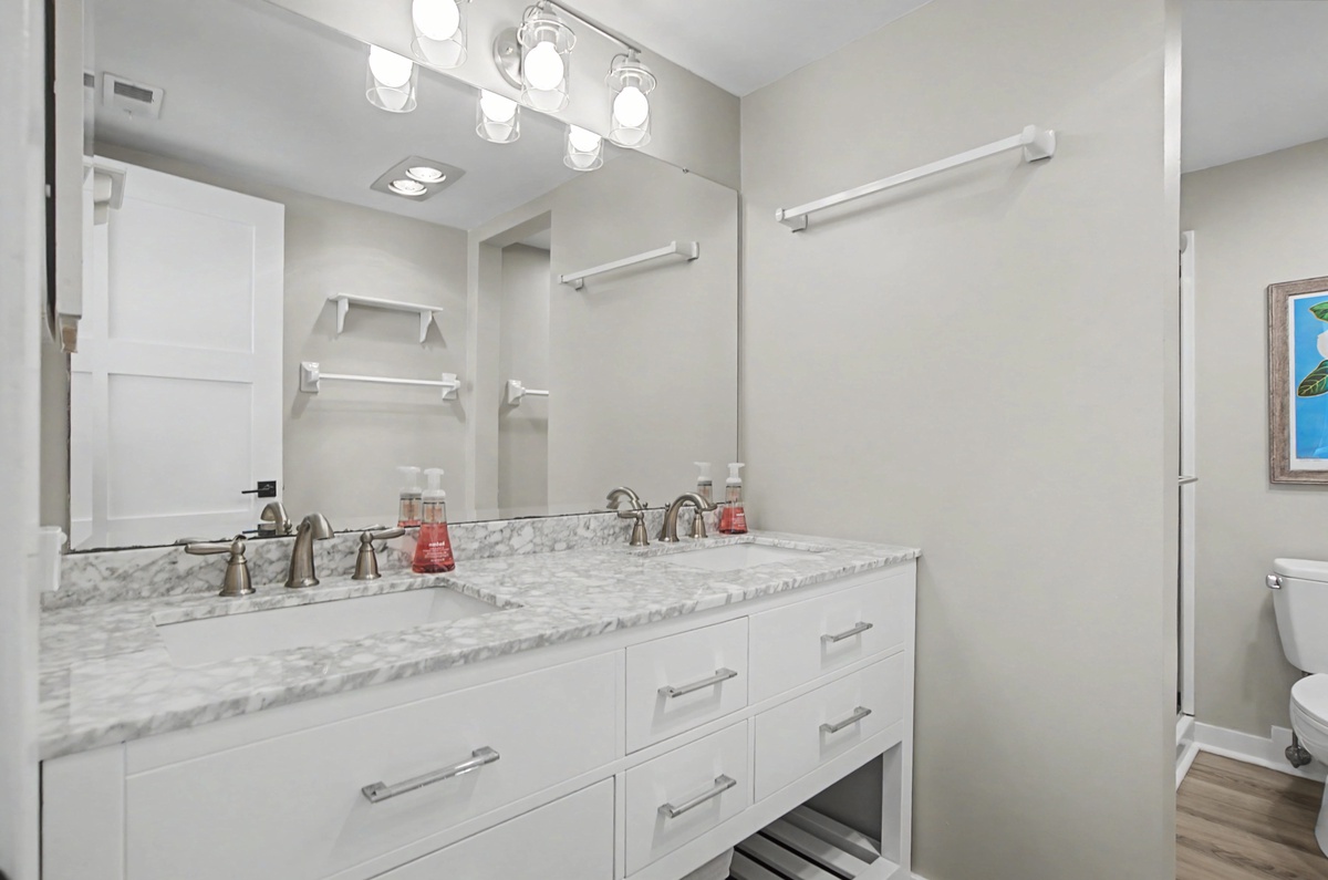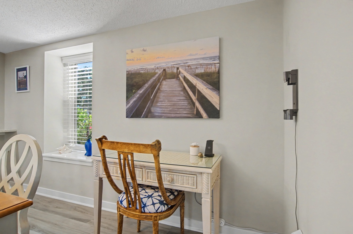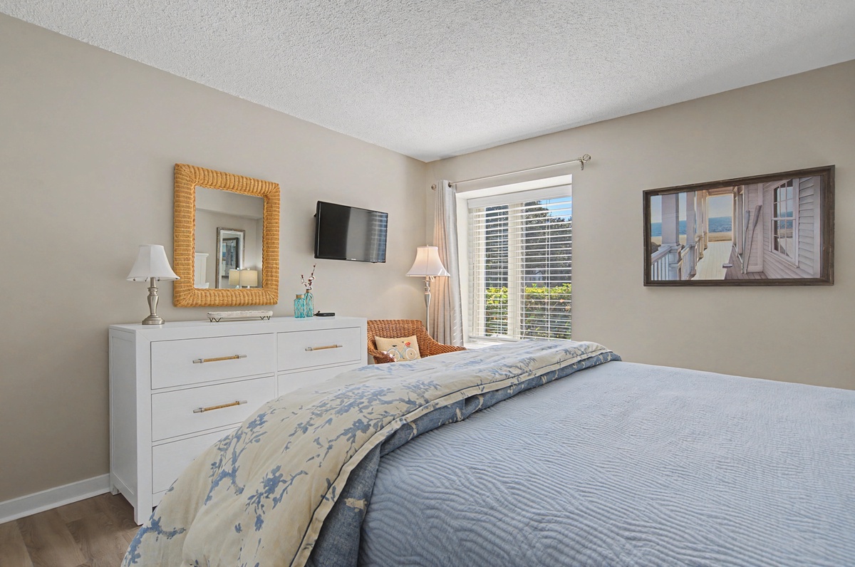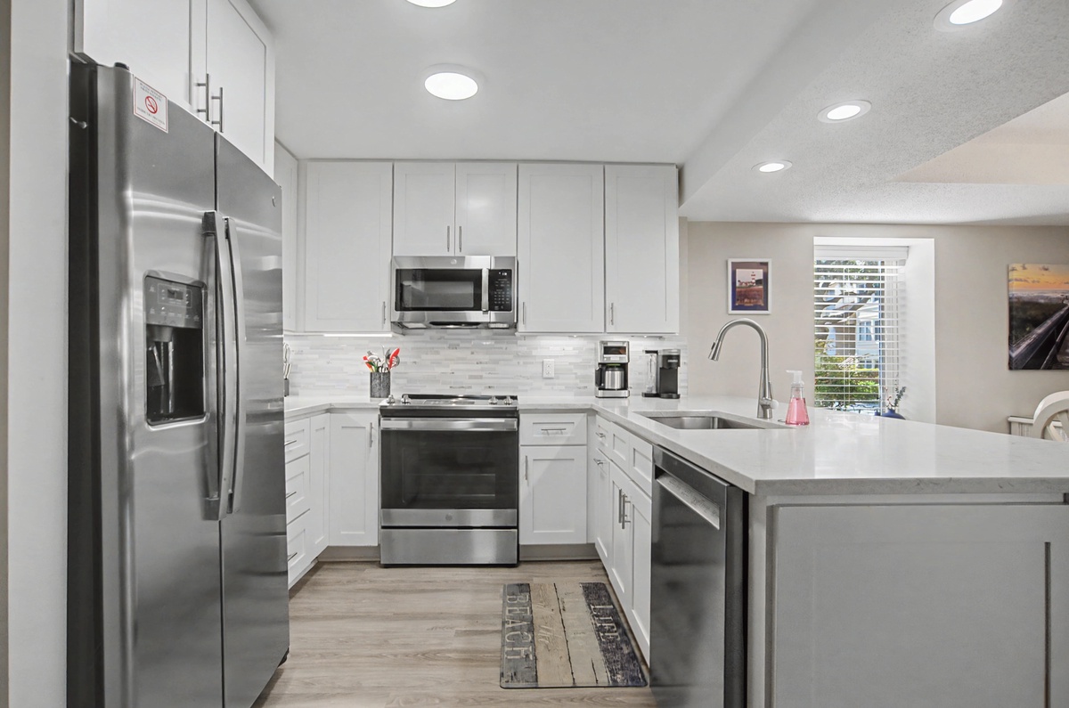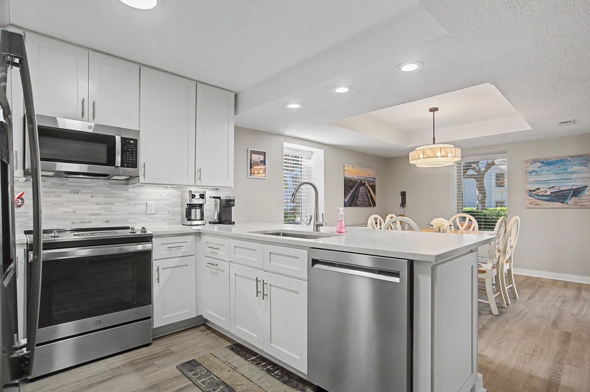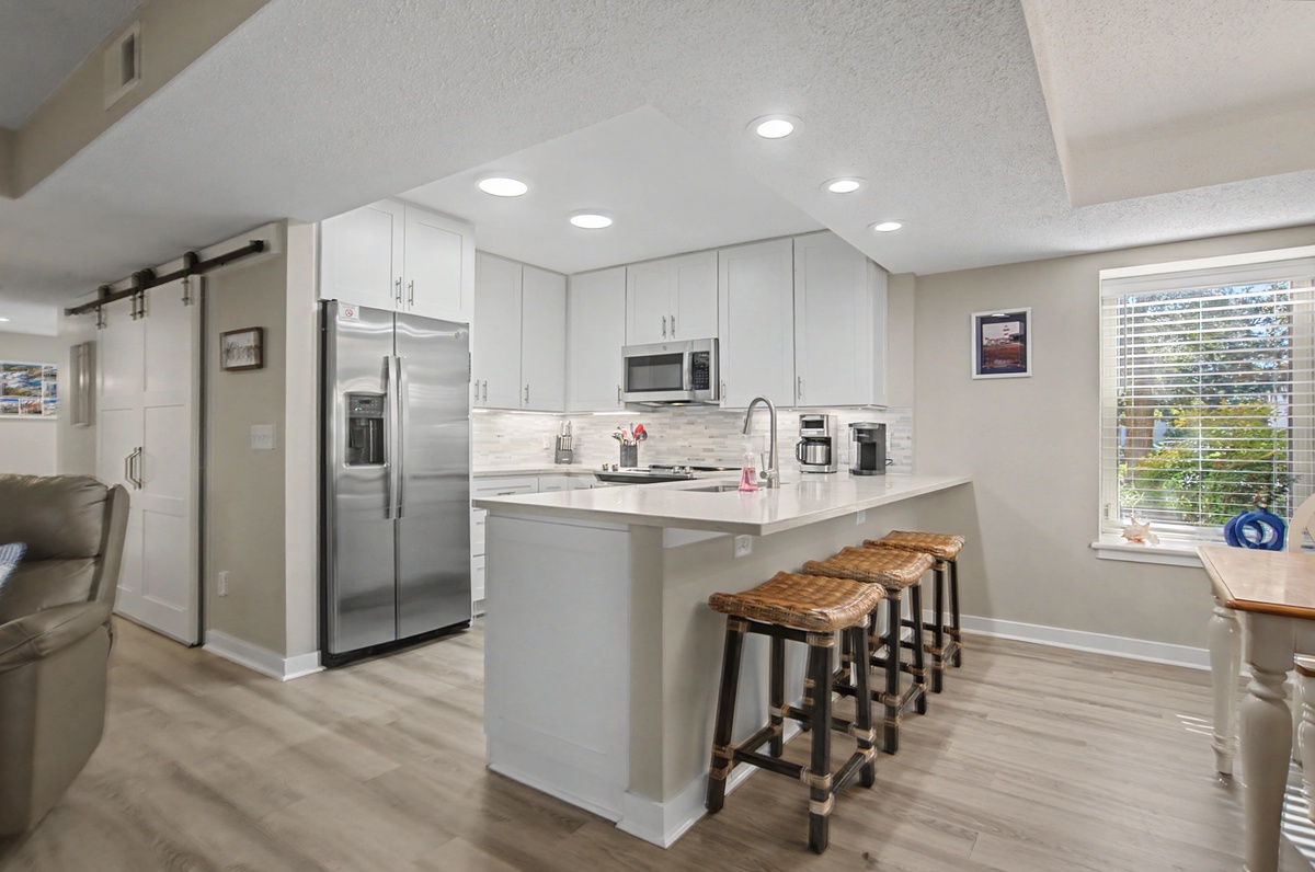 We know you are going love the ease of access with this first floor walk-up. Enjoy the private patio for a relaxing meal, keeping your bikes and beach gear right outside or walking right around to your car. The large sliding doors offer plenty of natural light. There is plenty of seating in the living area and the sofa is a queen sleeper bed. The dining room seats six comfortably, and there is seating for three at the breakfast bar. You will find everything you need in this immaculately remodeled and fully-equipped kitchen with an efficient layout and plenty of counter space. Coffee lovers will especially like the option to use either the Keurig or the drip coffee maker - m-m-m, who doesn't love the smell of coffee in the morning?