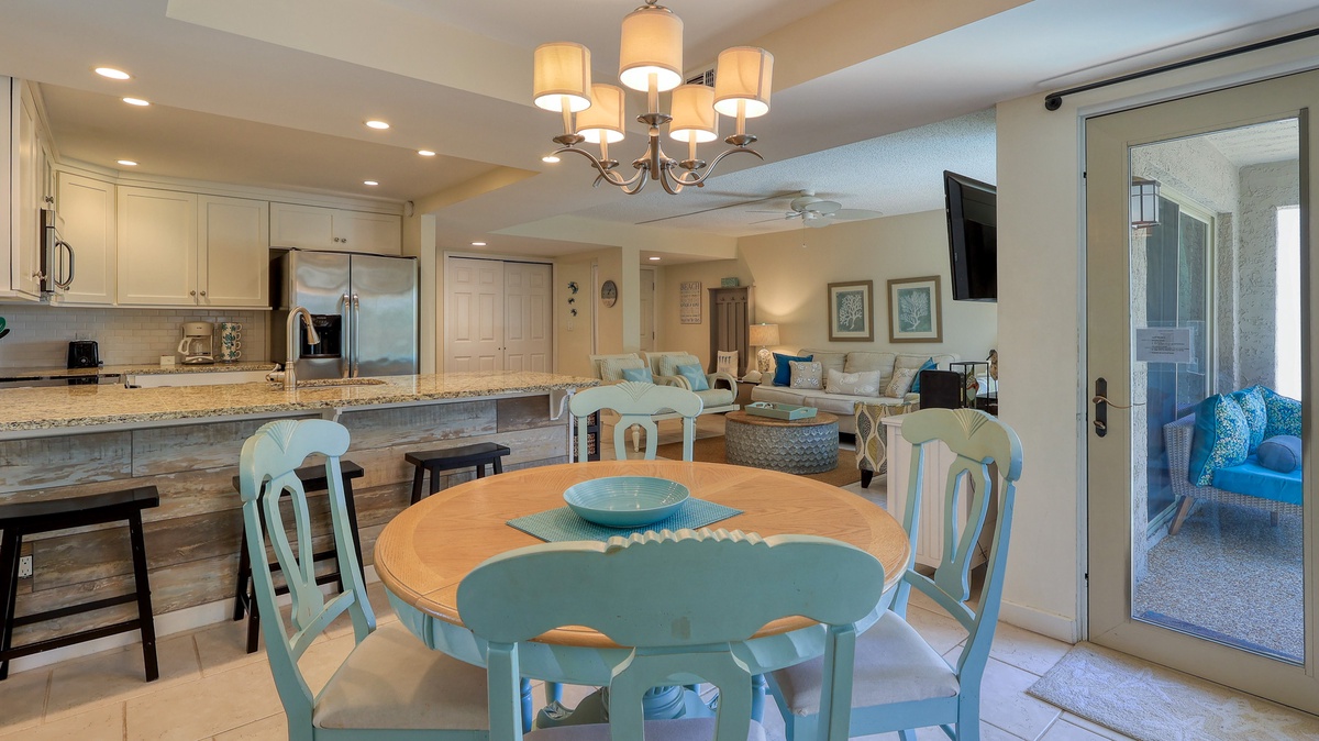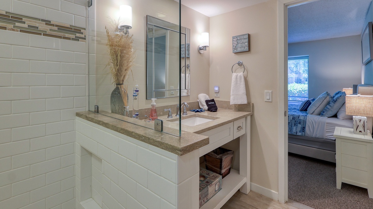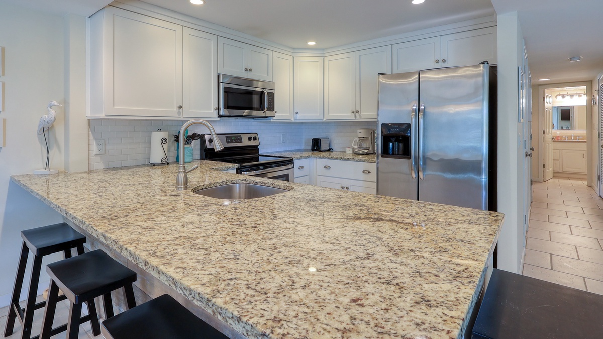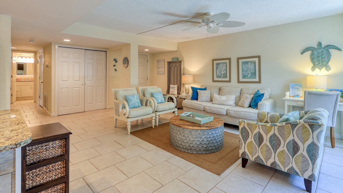 Our guests' comments make it easy to rave about 1752 Bluff Villa, a "better than fantastic" first-floor vacation home away from home that comfortably accommodates a party of 6. This 2-bedroom, 2 bathrooms completely renovated villa has a relaxing coastal feel throughout. The open floor plan allows for easy entertaining from the stunning new kitchen. Granite countertops, stainless steel appliances and new cabinets make this kitchen one you will not want to leave. Tile floors connect the whole living space with a cool, clean feeling. The comfy new sofa opens into a queen sleeper. The guest bedroom has coastal touches, a queen bed and is across the hall from an amazingly updated bathroom. The primary bedroom has a king bed and walk in shower en suite, pretty as a picture!