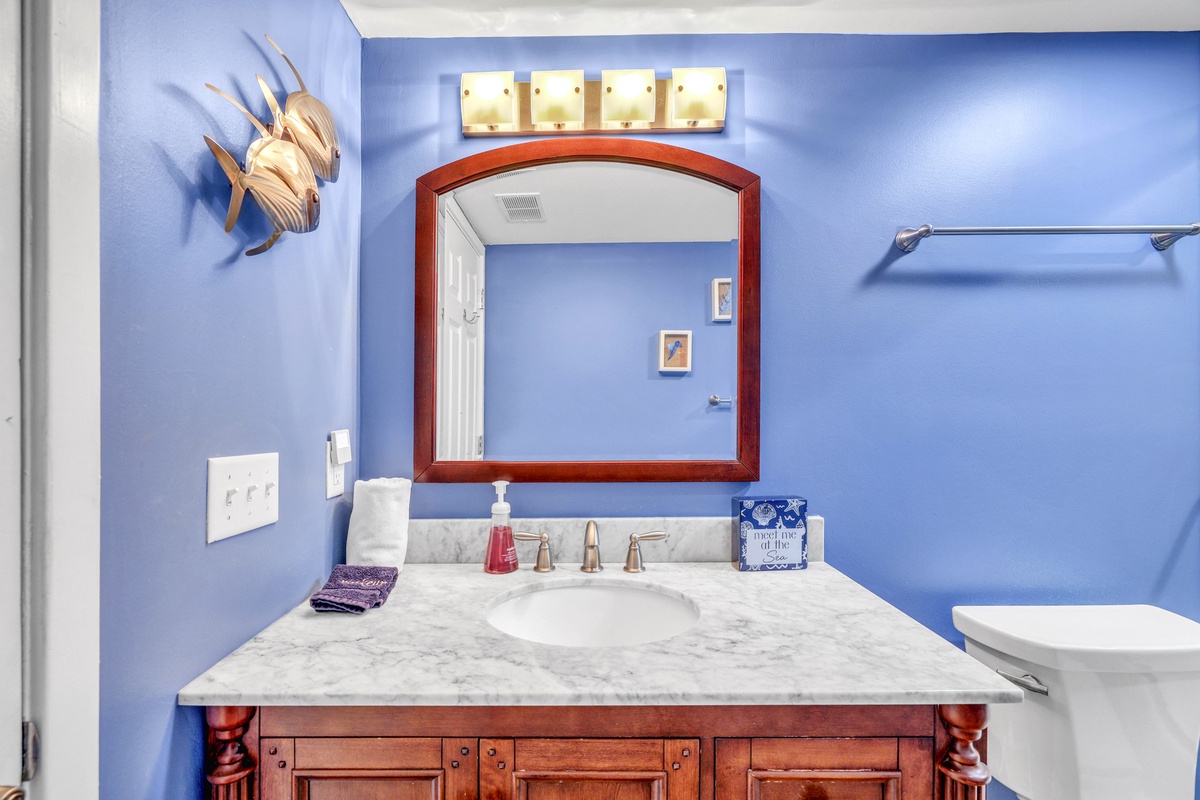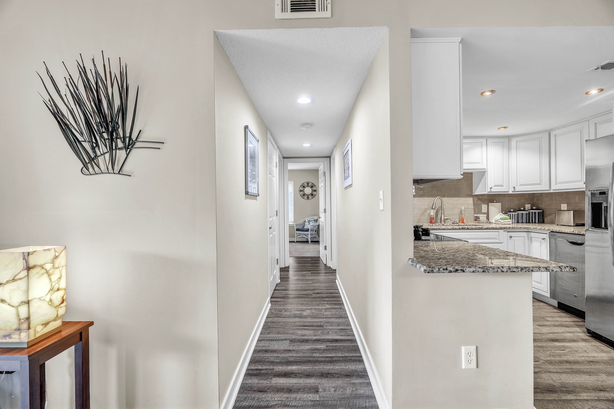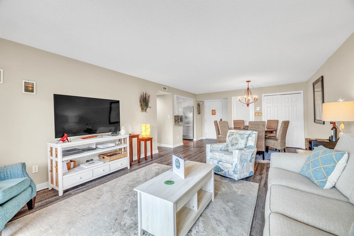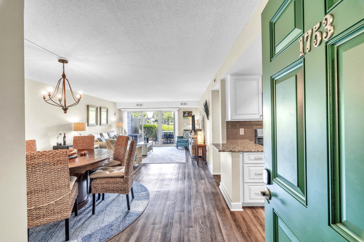 Our guests' comments make it easy to rave about 1752 Bluff Villa, a "better than fantastic" first-floor vacation home away from home that comfortably accommodates a party of 6. This 2-bedroom, 2 bathrooms completely renovated villa has a relaxing coastal feel throughout. The open floor plan allows for easy entertaining from the stunning new kitchen. Granite countertops, stainless steel appliances and new cabinets make this kitchen one you will not want to leave. Tile floors connect the whole living space with a cool, clean feeling. The comfy new sofa opens into a queen sleeper. The guest bedroom has coastal touches, a queen bed and is across the hall from an amazingly updated bathroom. The primary bedroom has a king bed and walk in shower en suite, pretty as a picture!